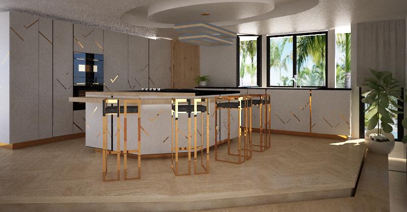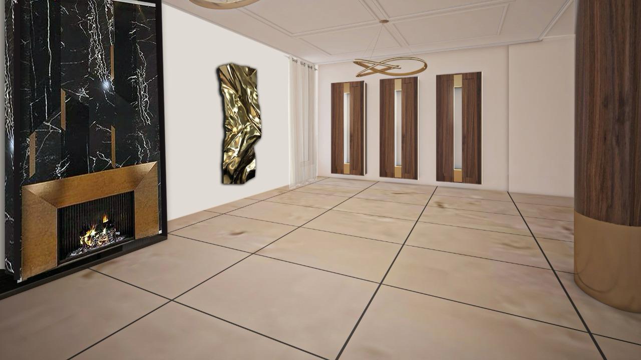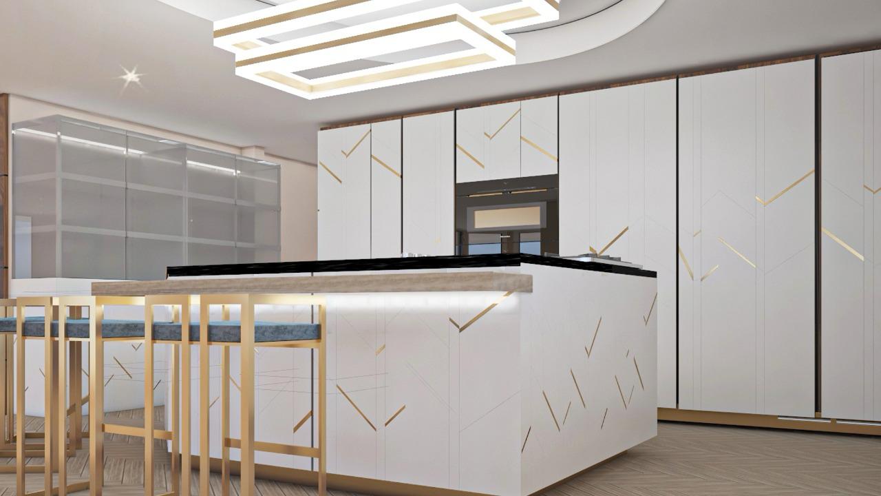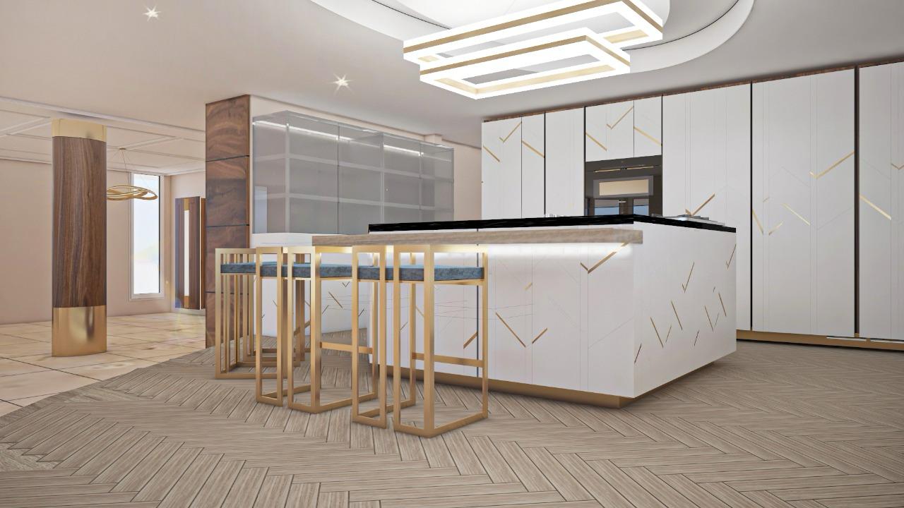 This bathroom masterfully combines minimalism with bold patterns through its standout chevron feature wall and clean architectural elements.