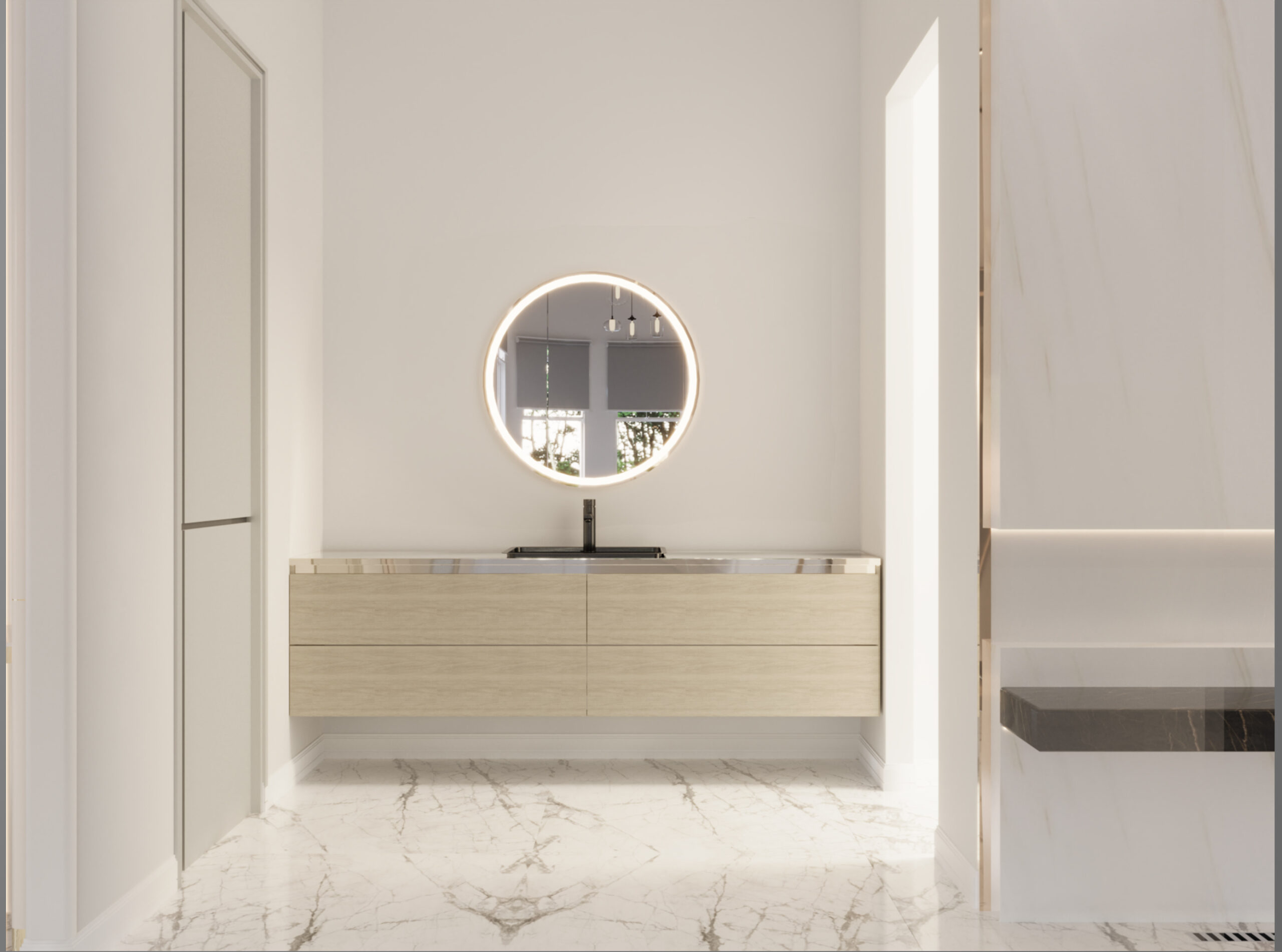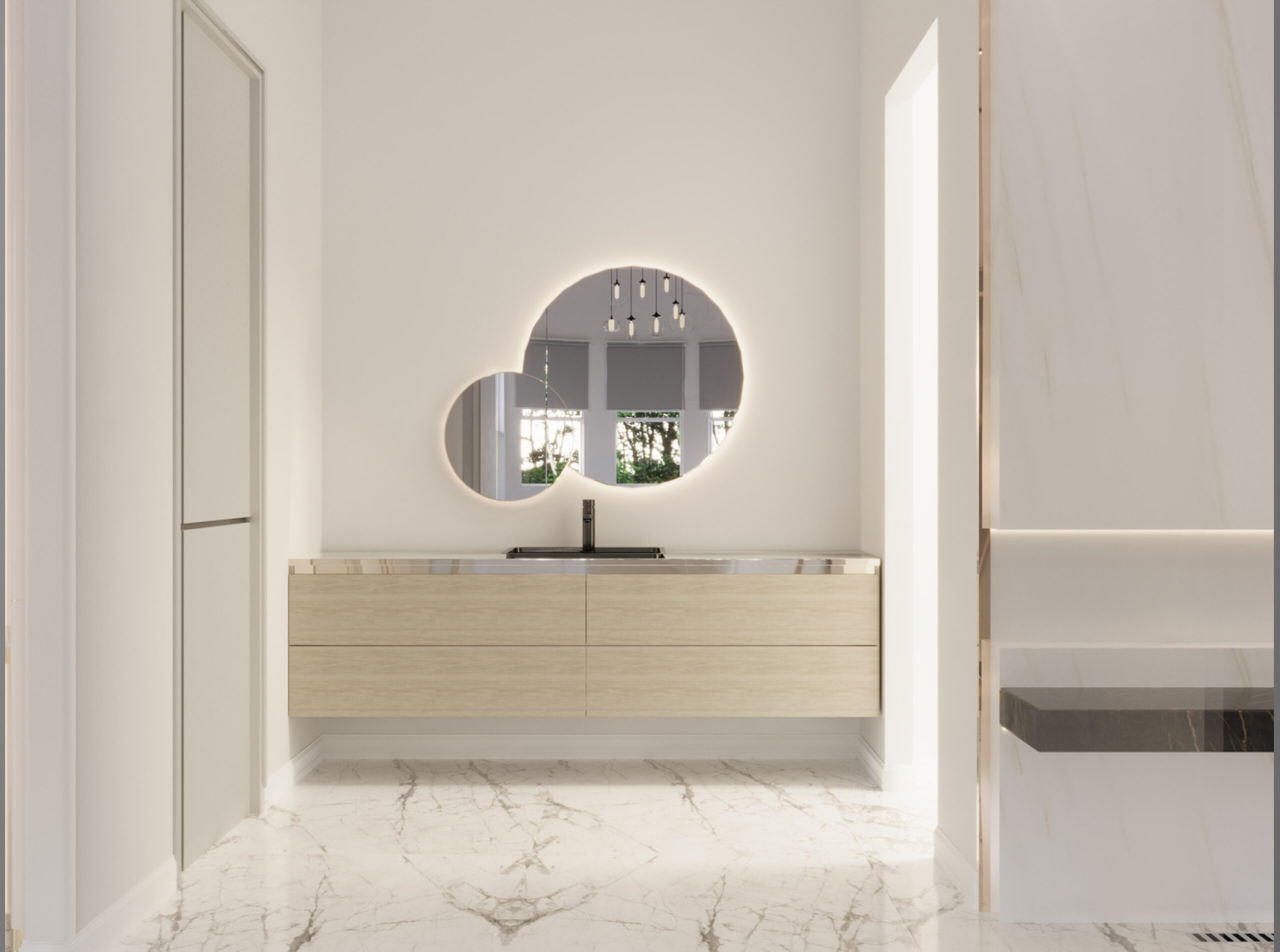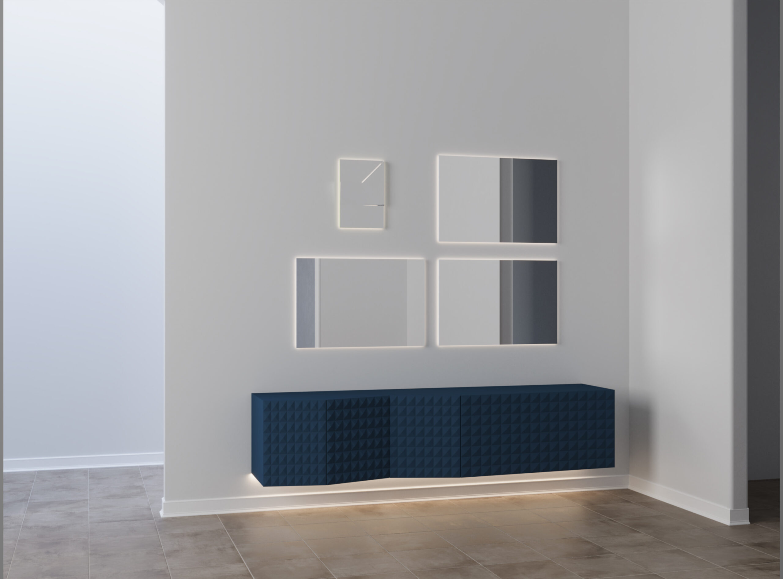 A sleek, modern bar corner featuring a rich wood finish, floating shelves, and a geometric backlit panel design that elevates any space.