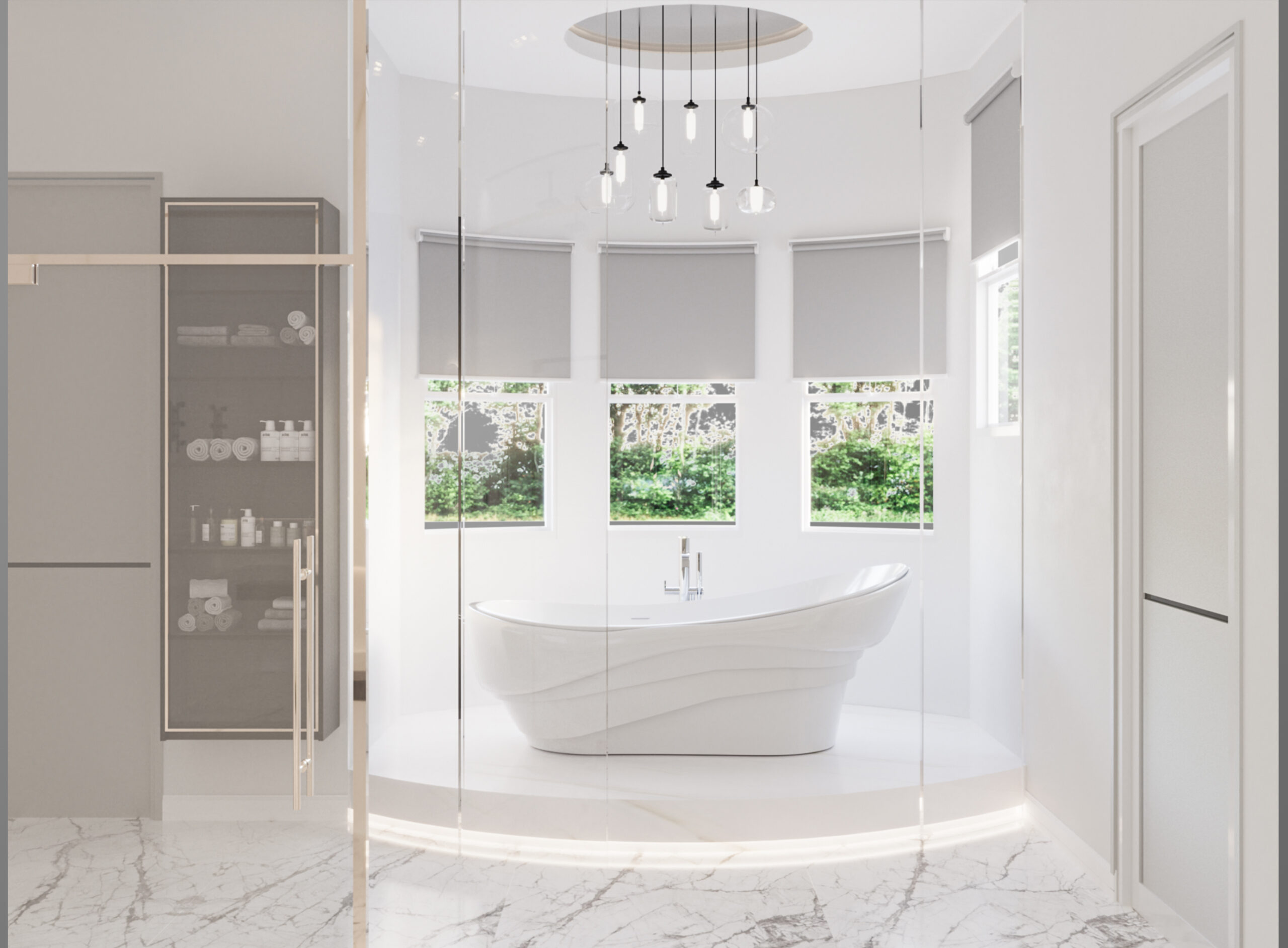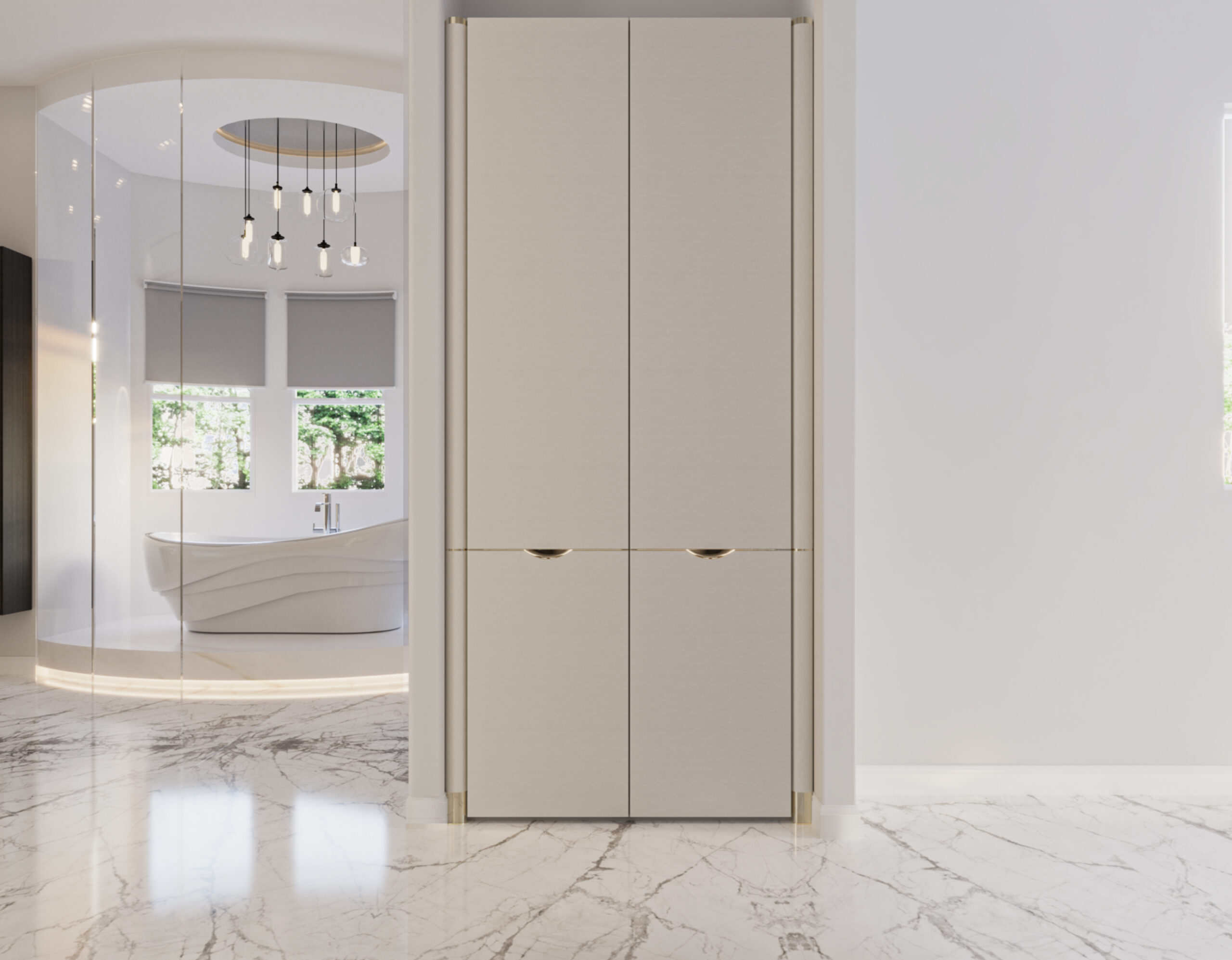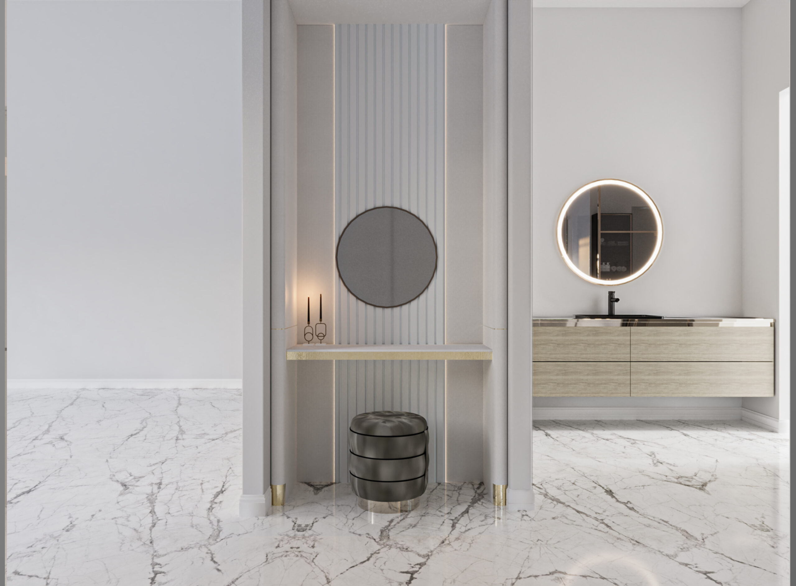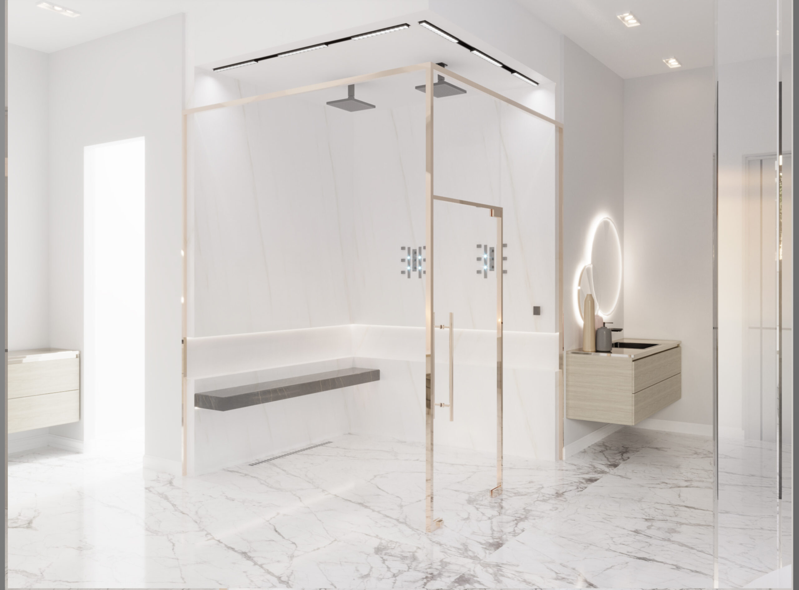 A sleek, modern bar corner featuring a rich wood finish, floating shelves, and a geometric backlit panel design that elevates any space.