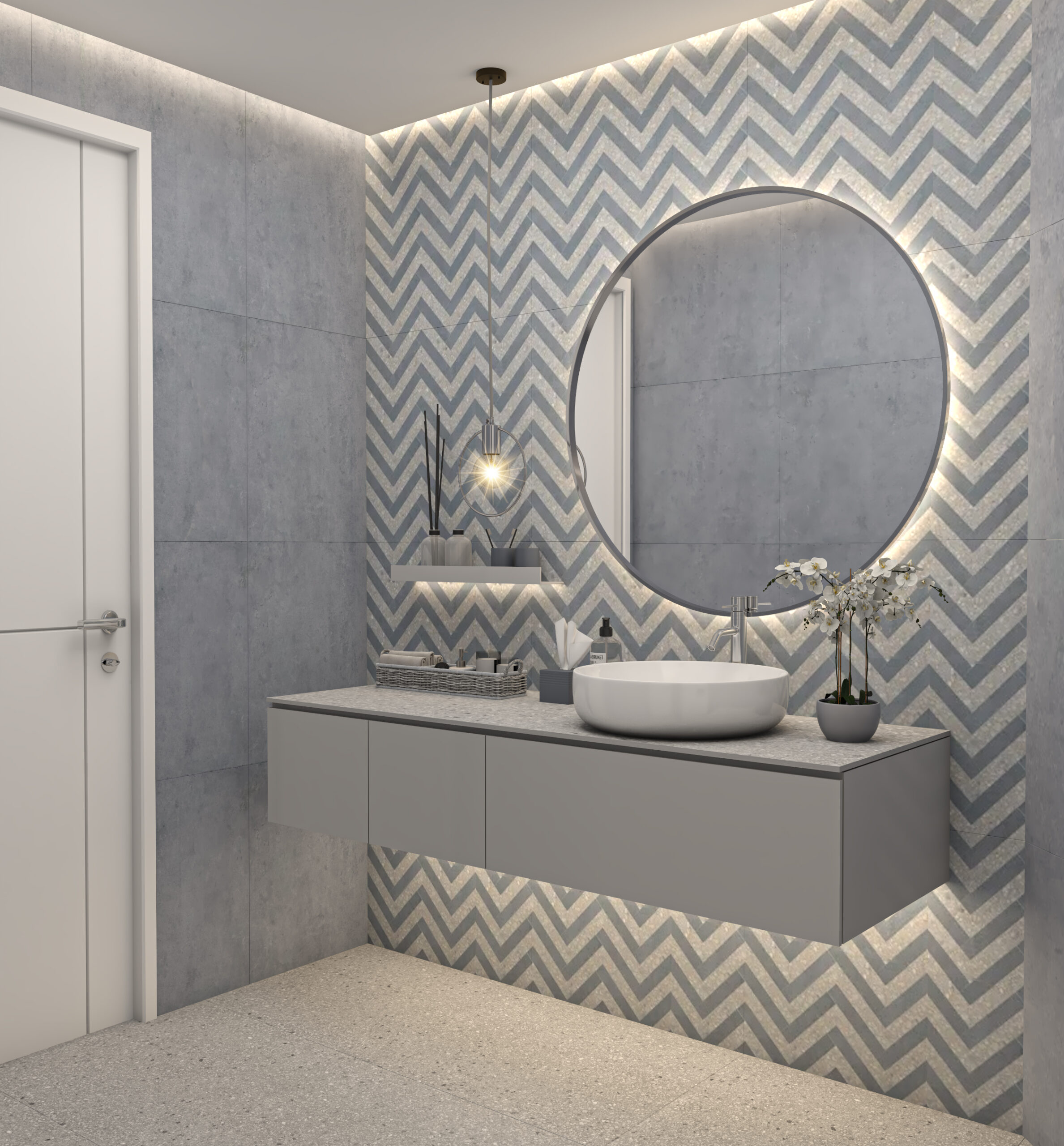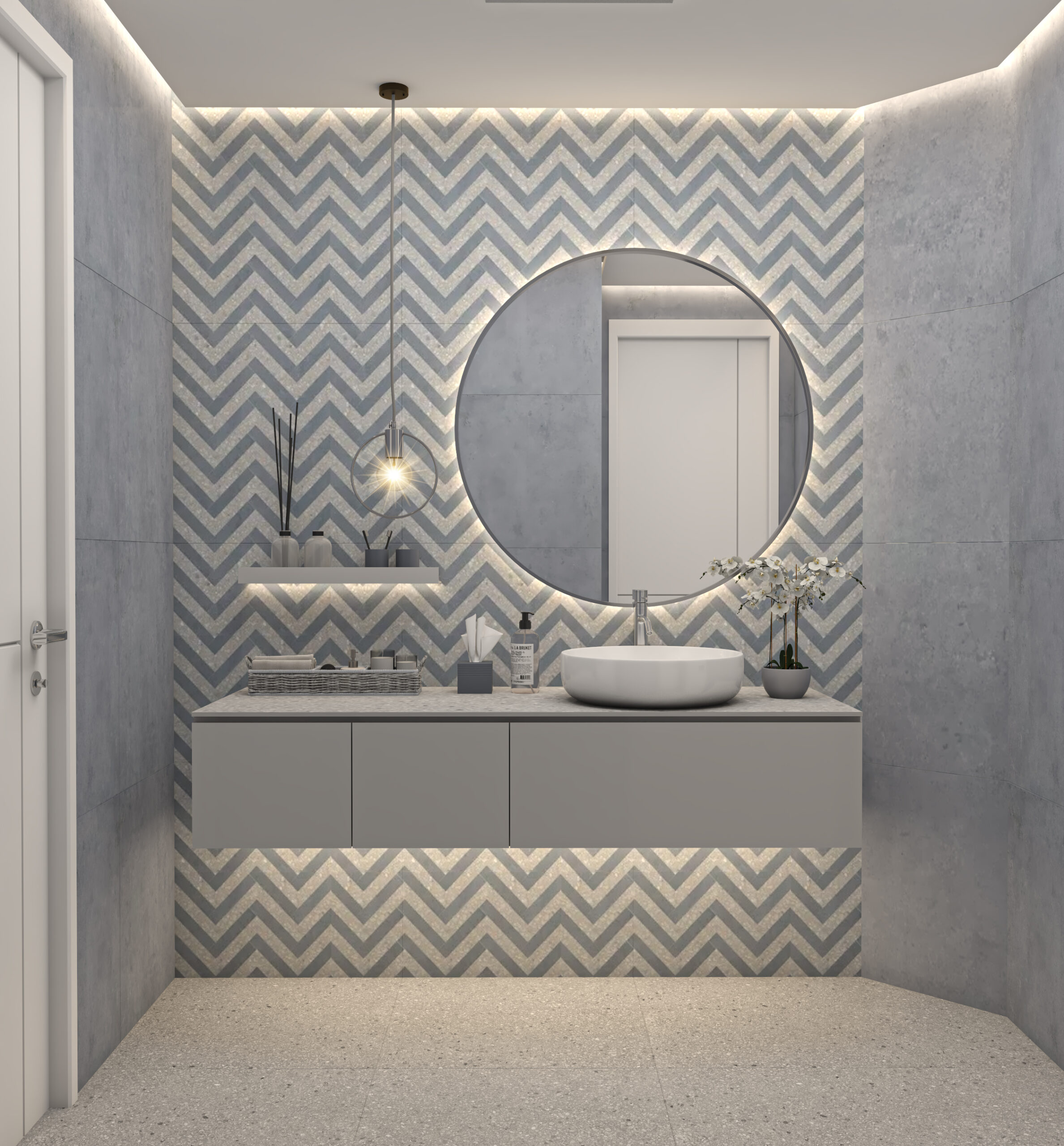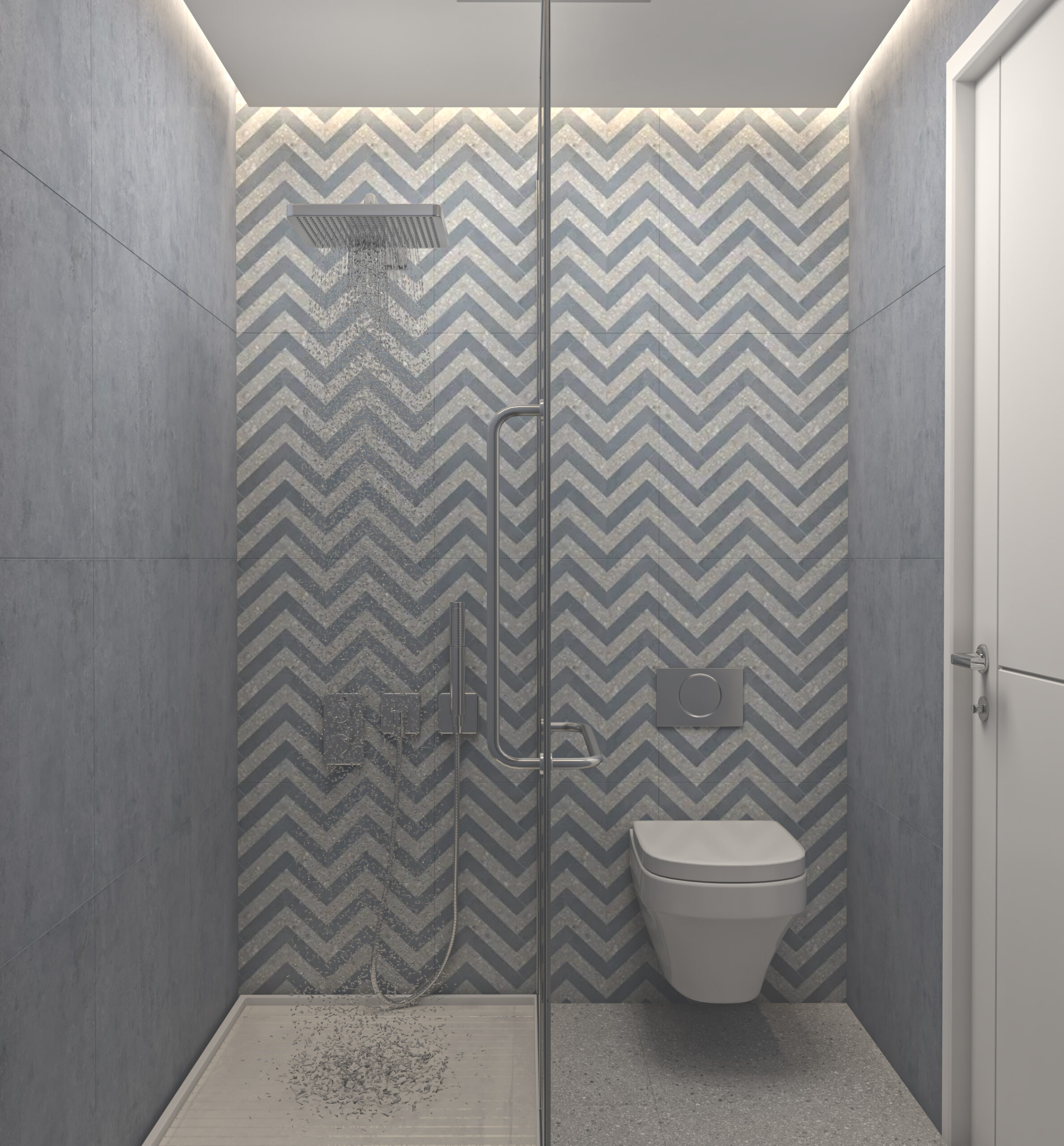 Immerse yourself in the elegance of modern minimalism with this bathroom design that artfully combines chevron patterns, soft grey tones, and integrated lighting. A blend of style and function, it transforms daily routines into refined rituals.