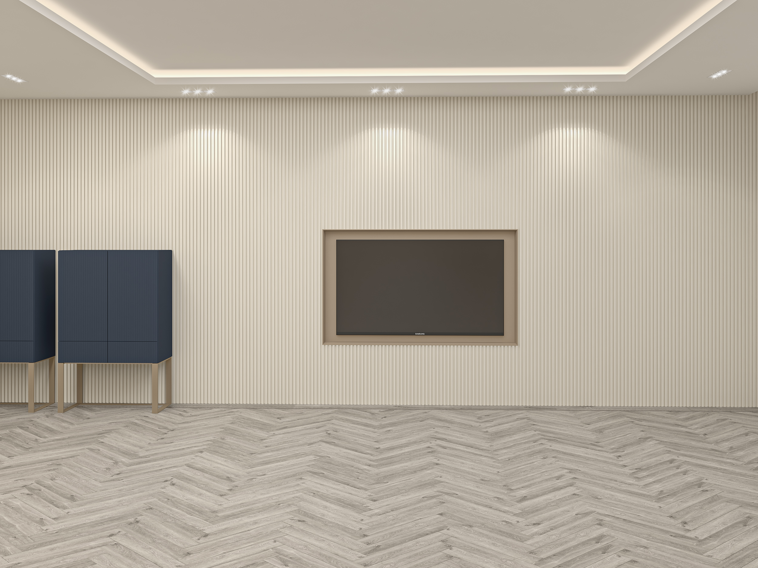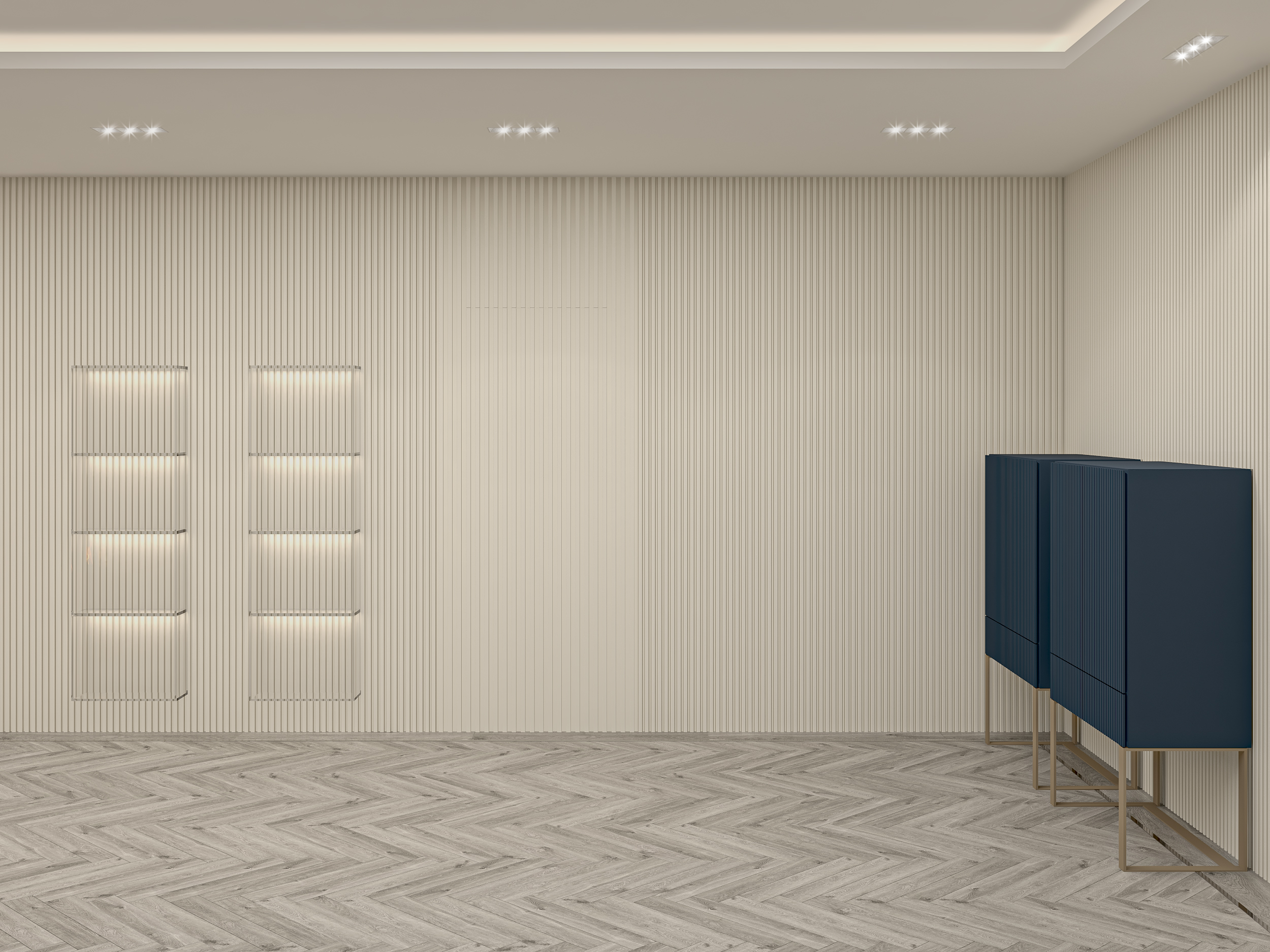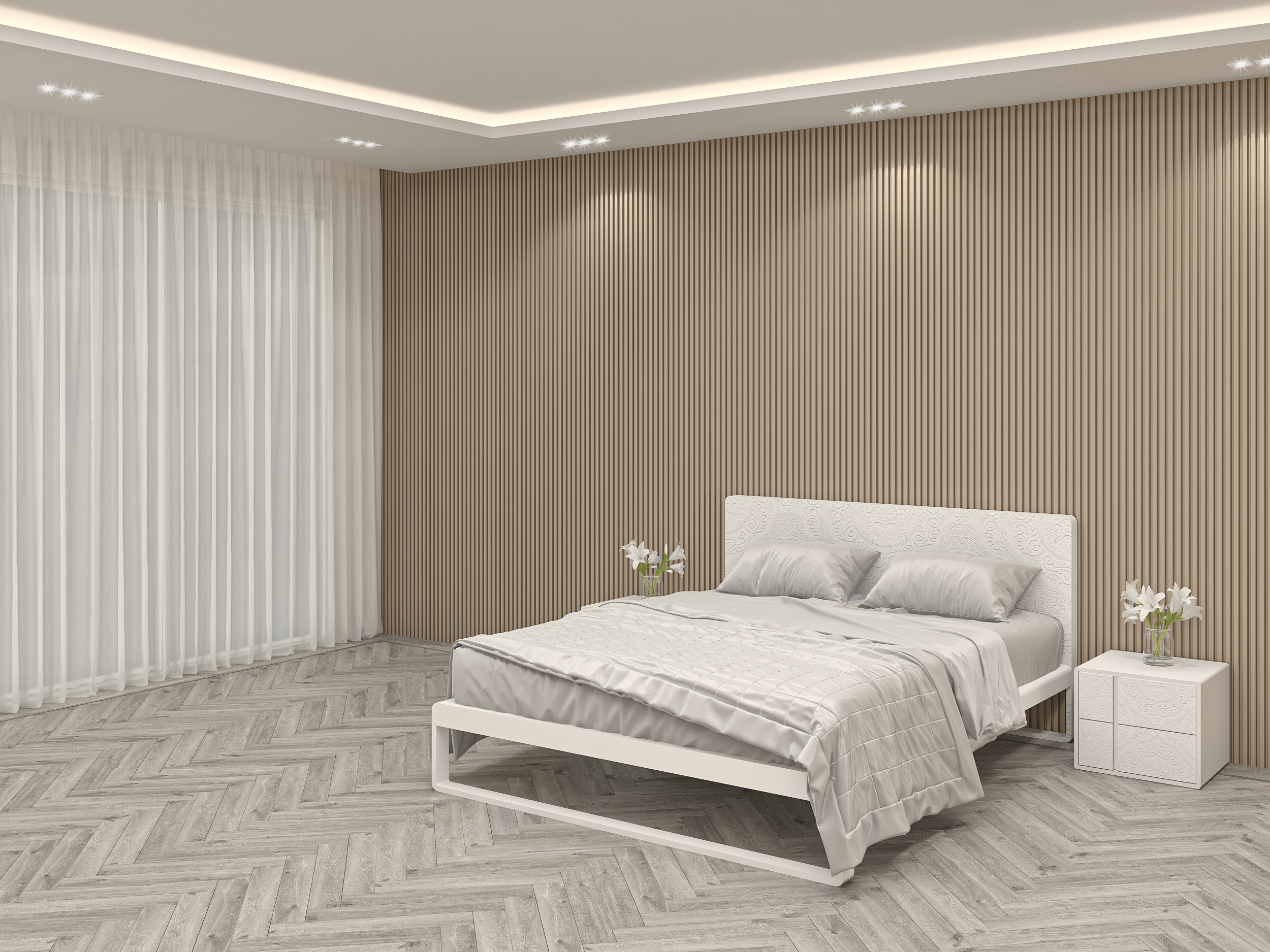- Subtle yet impactful wall textures create depth and rhythm, complementing the room’s linear symmetry.