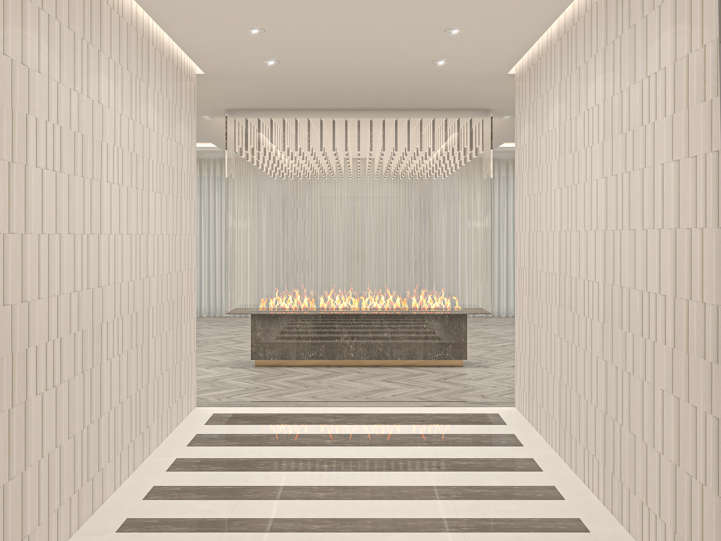 A captivating entrance hall merges geometric precision with contemporary luxury. The minimal aesthetic is enriched by warm flames, textural contrasts, and a sense of architectural rhythm.