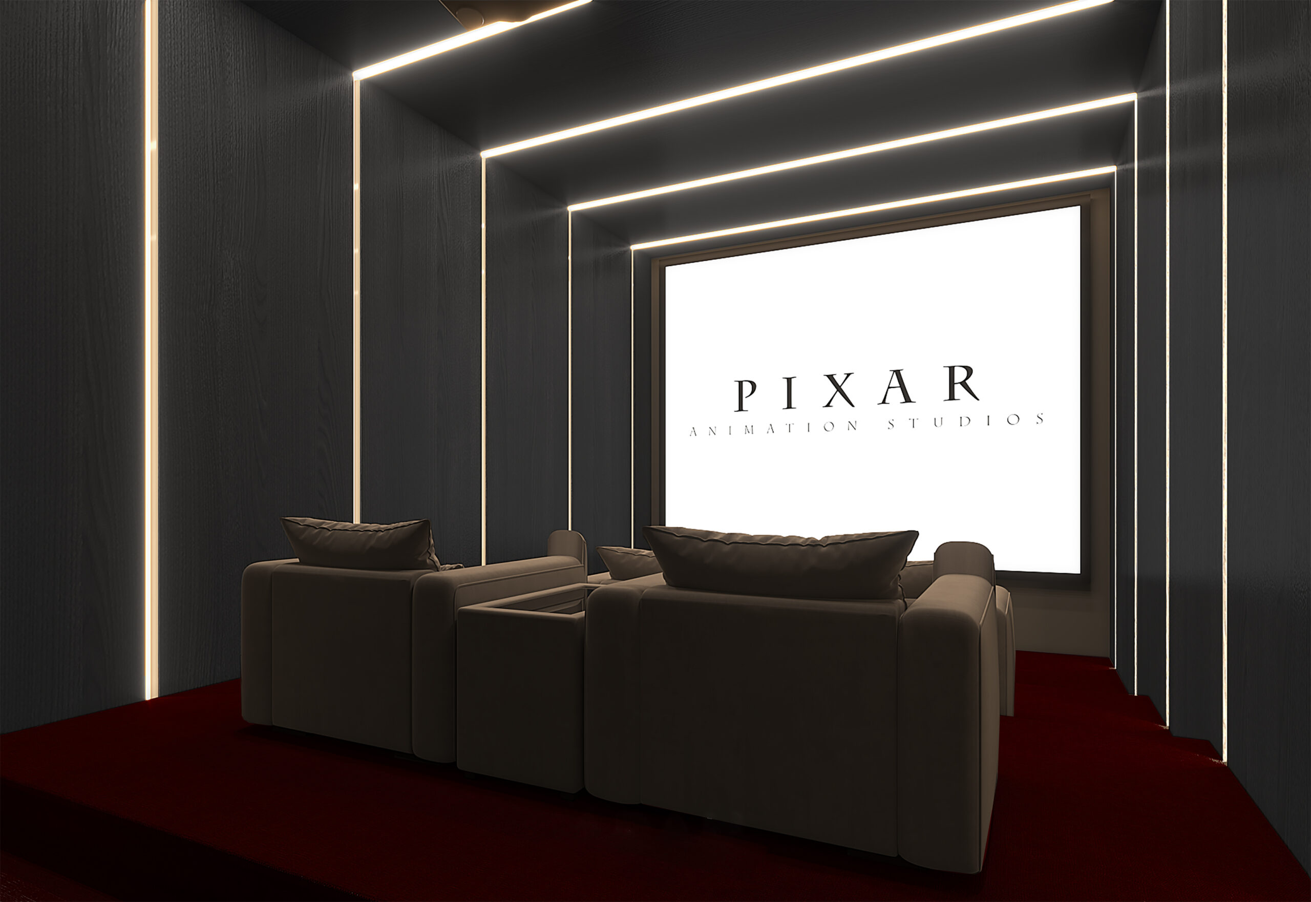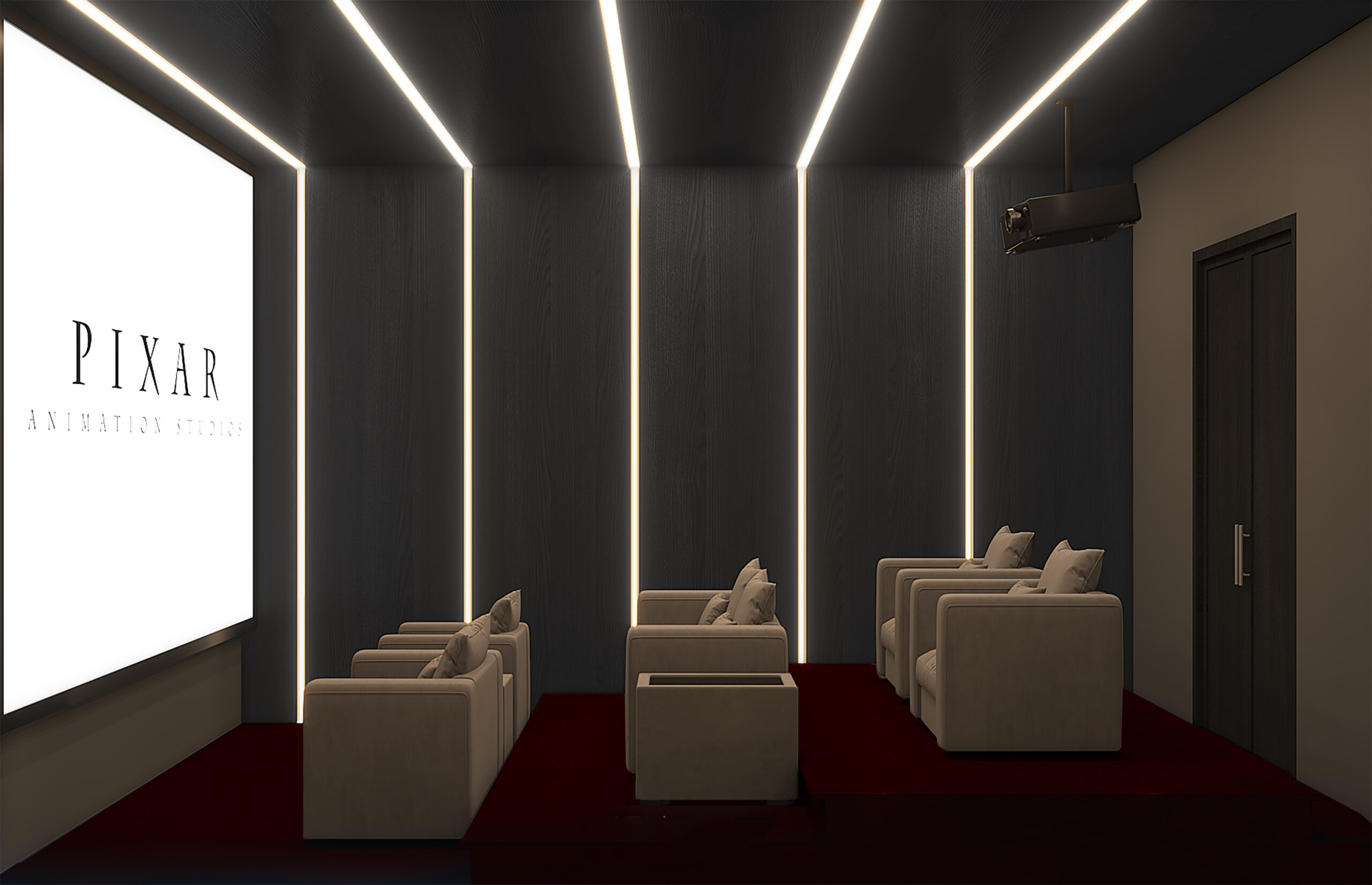 A luxurious, sound-optimized home theater designed for an immersive visual experience in a compact, stylish envelope. Plush seating and ambient strip lighting complement a clean, dark interior for true cinema vibes.