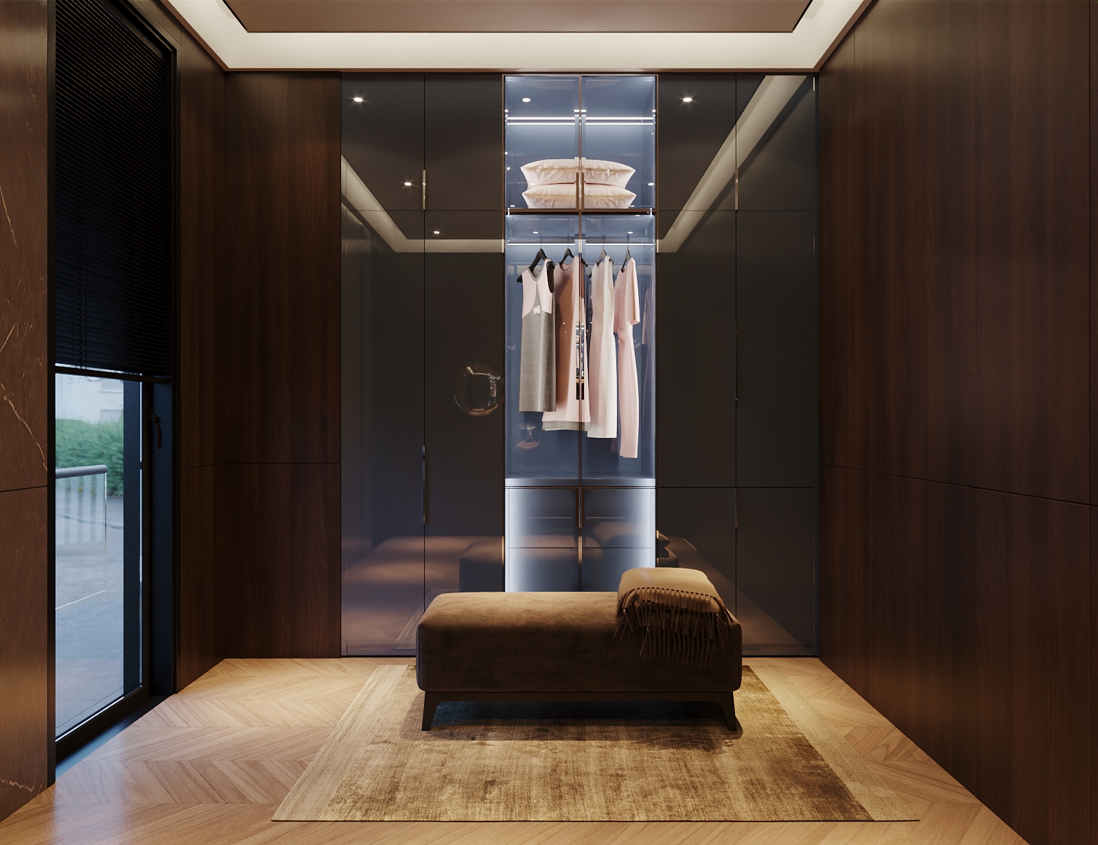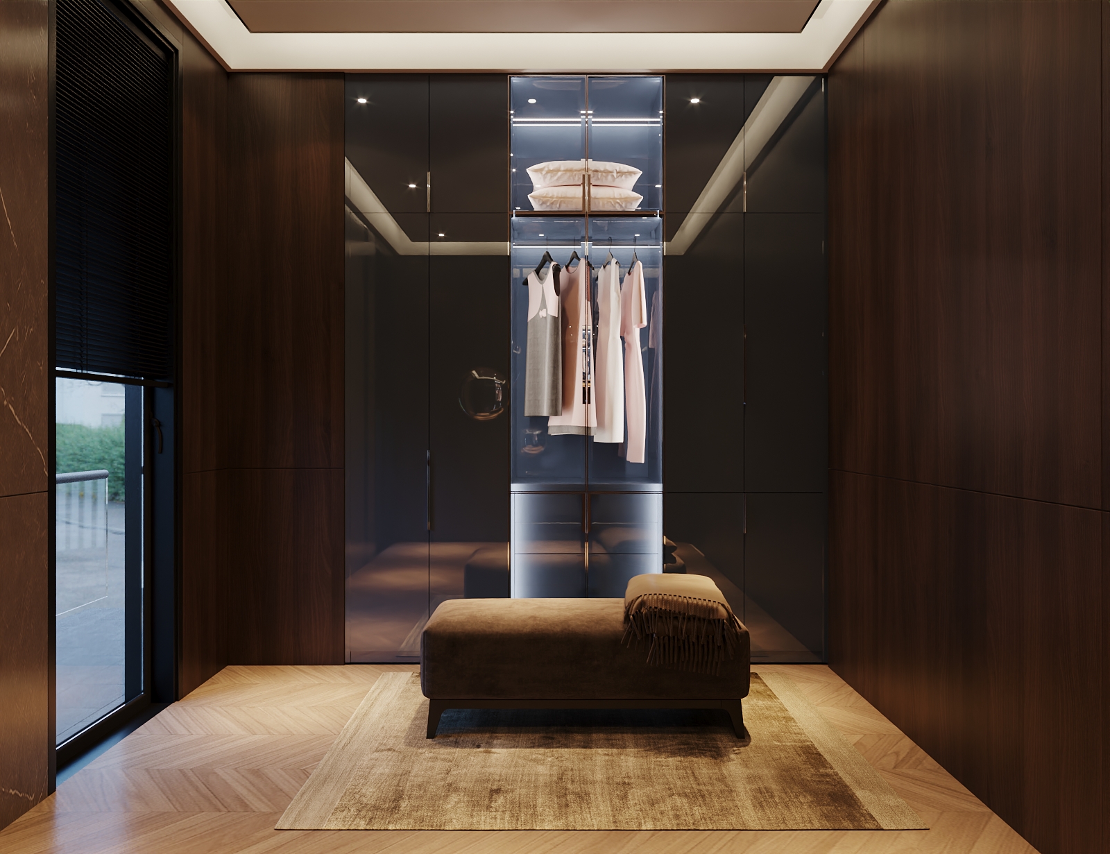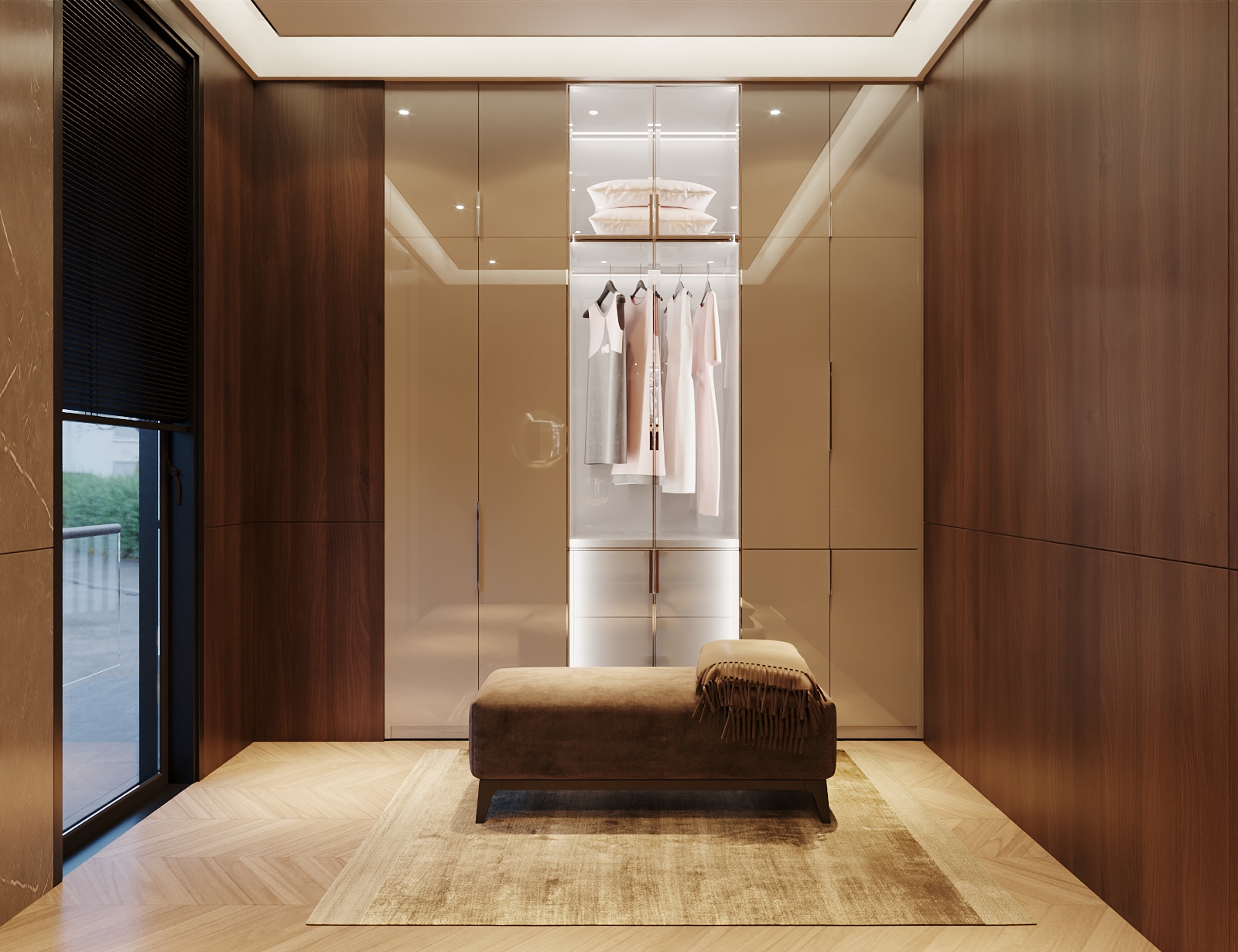 This luxurious dressing room features a refined blend of warm wood textures and sleek, reflective finishes. The thoughtful layout enhances comfort and convenience while maintaining a modern aesthetic.