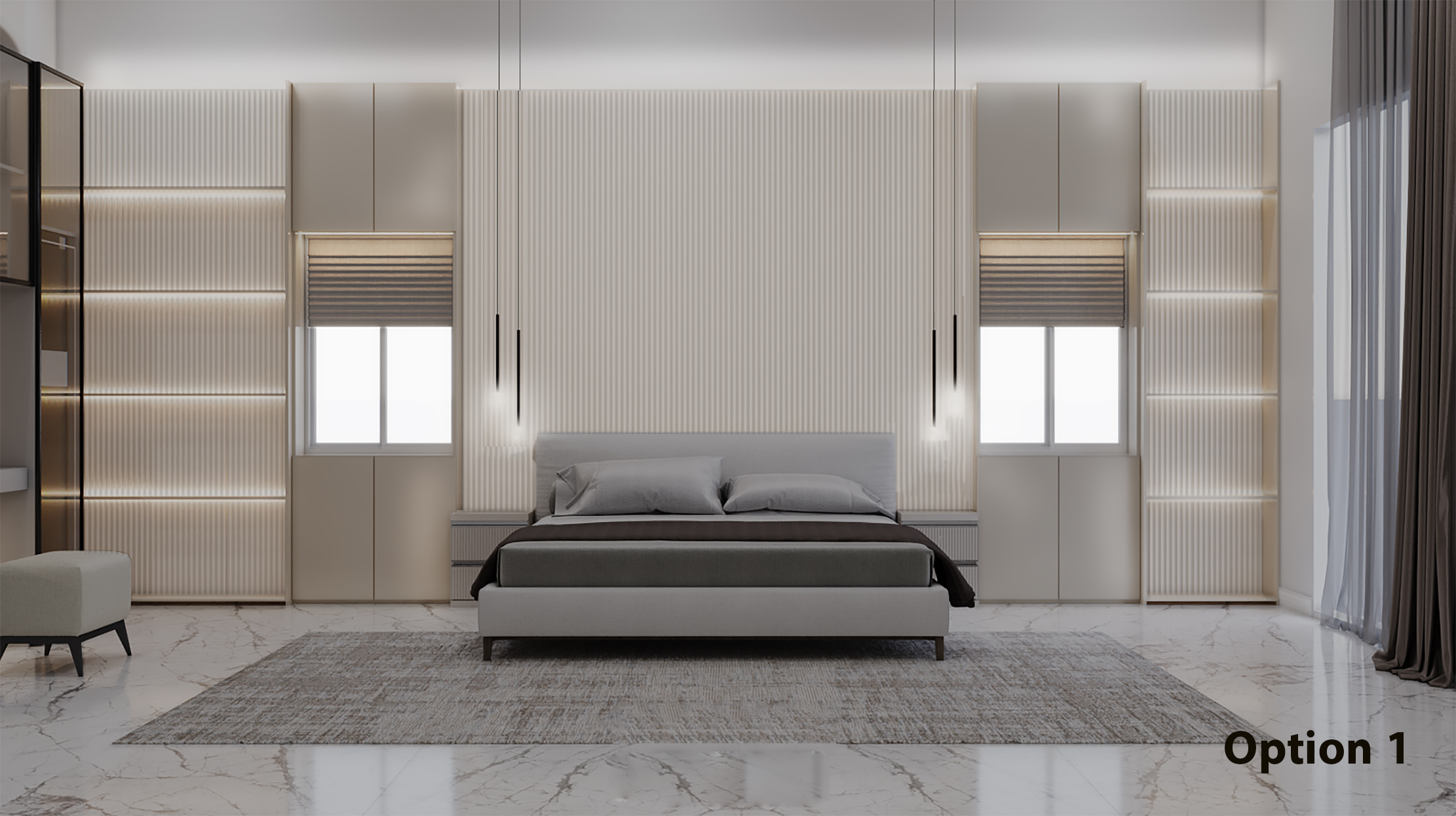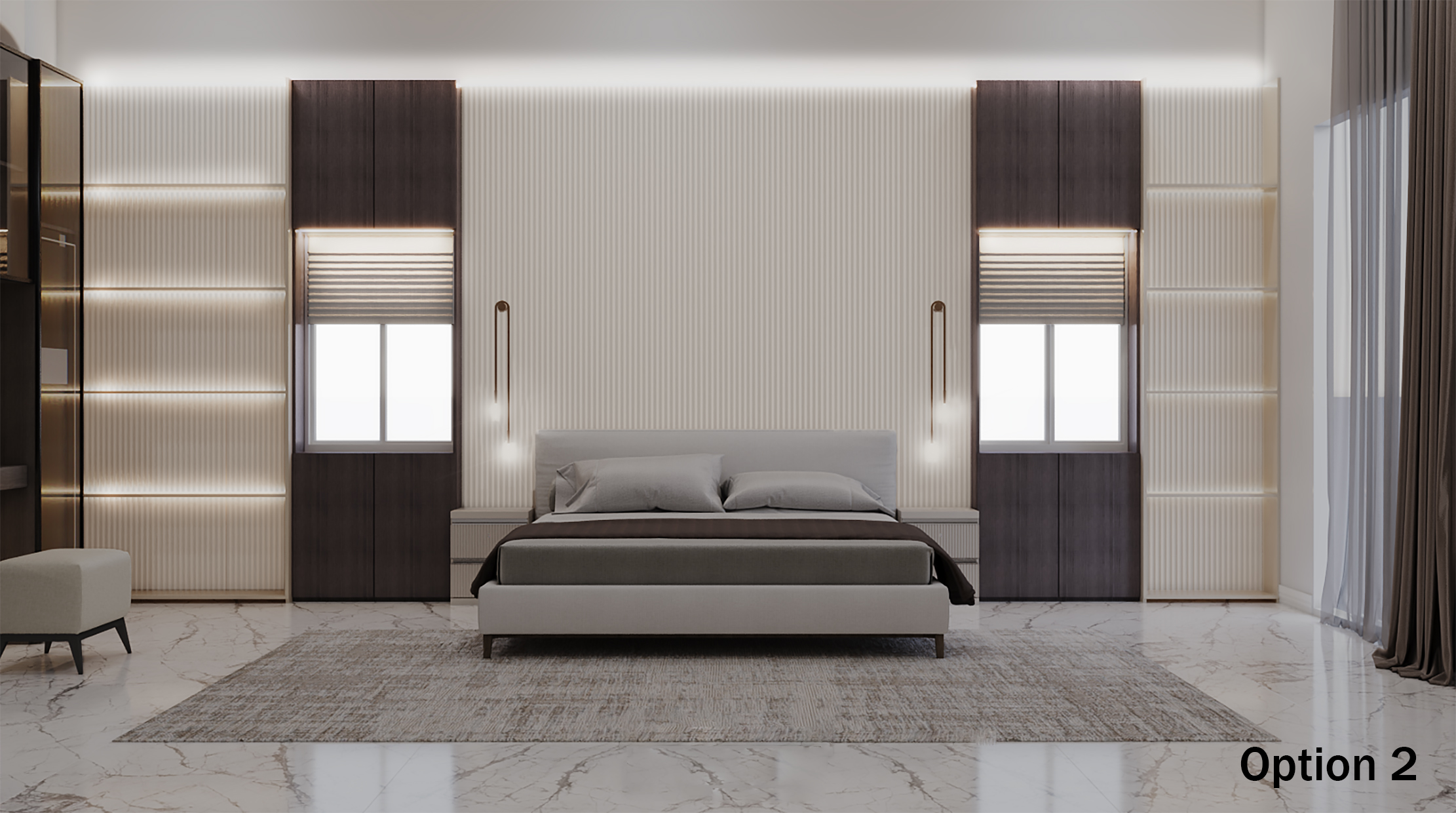 A refined blend of warm neutrals and rich dark tones brings out a modern, luxurious bedroom aesthetic with a balanced symmetry and moody lighting.