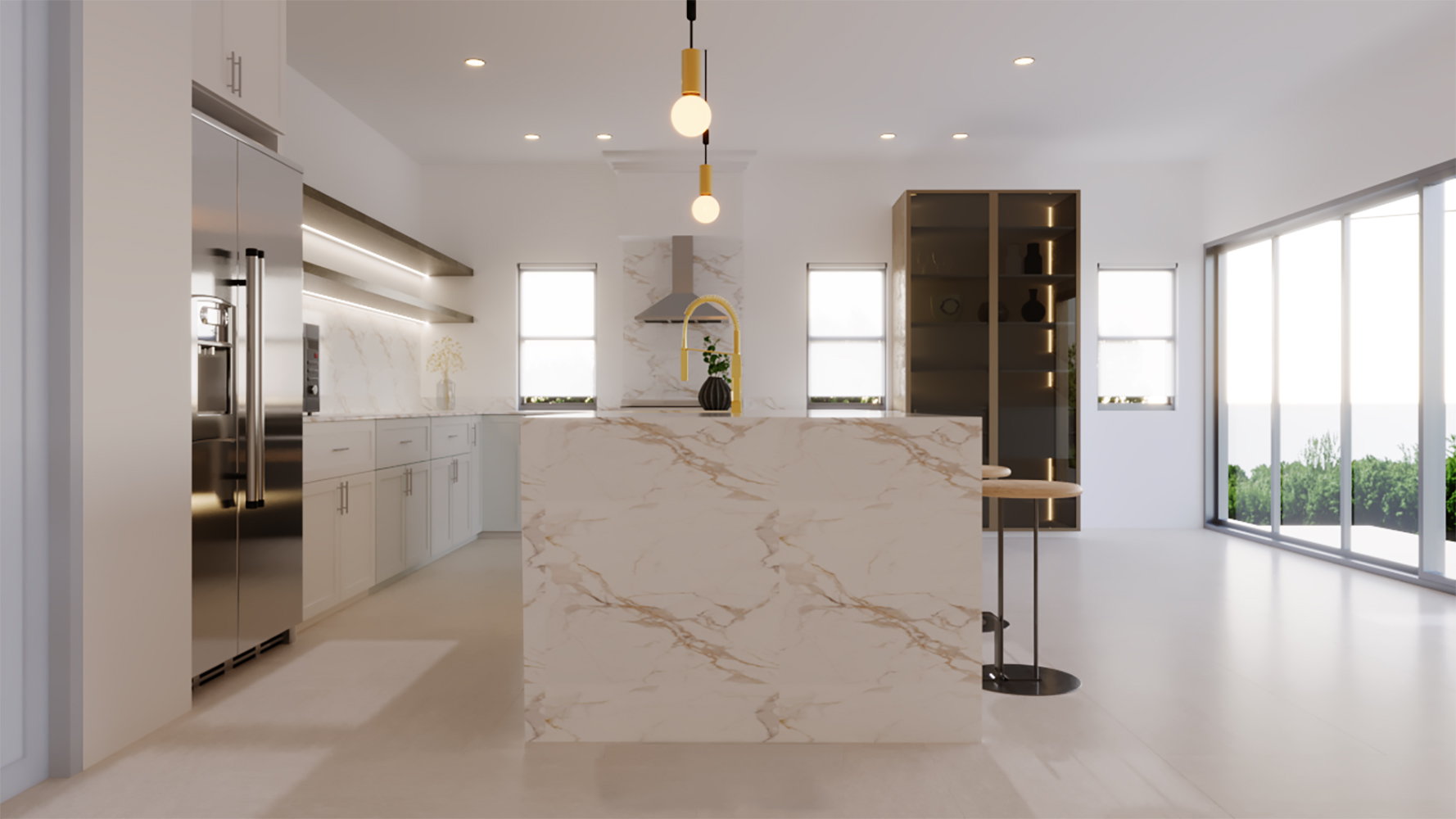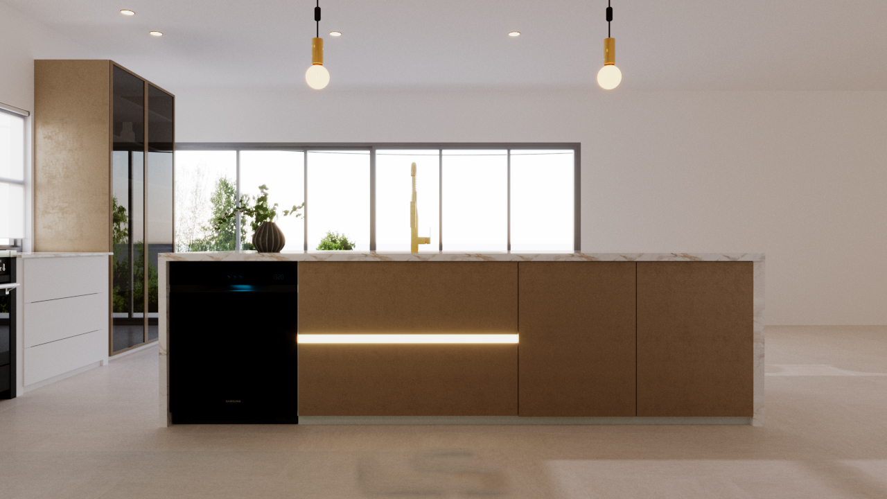 This kitchen embodies sophistication with a harmonious blend of warm tones, natural textures, and modern accents, making it ideal for both culinary creation and social gatherings.
