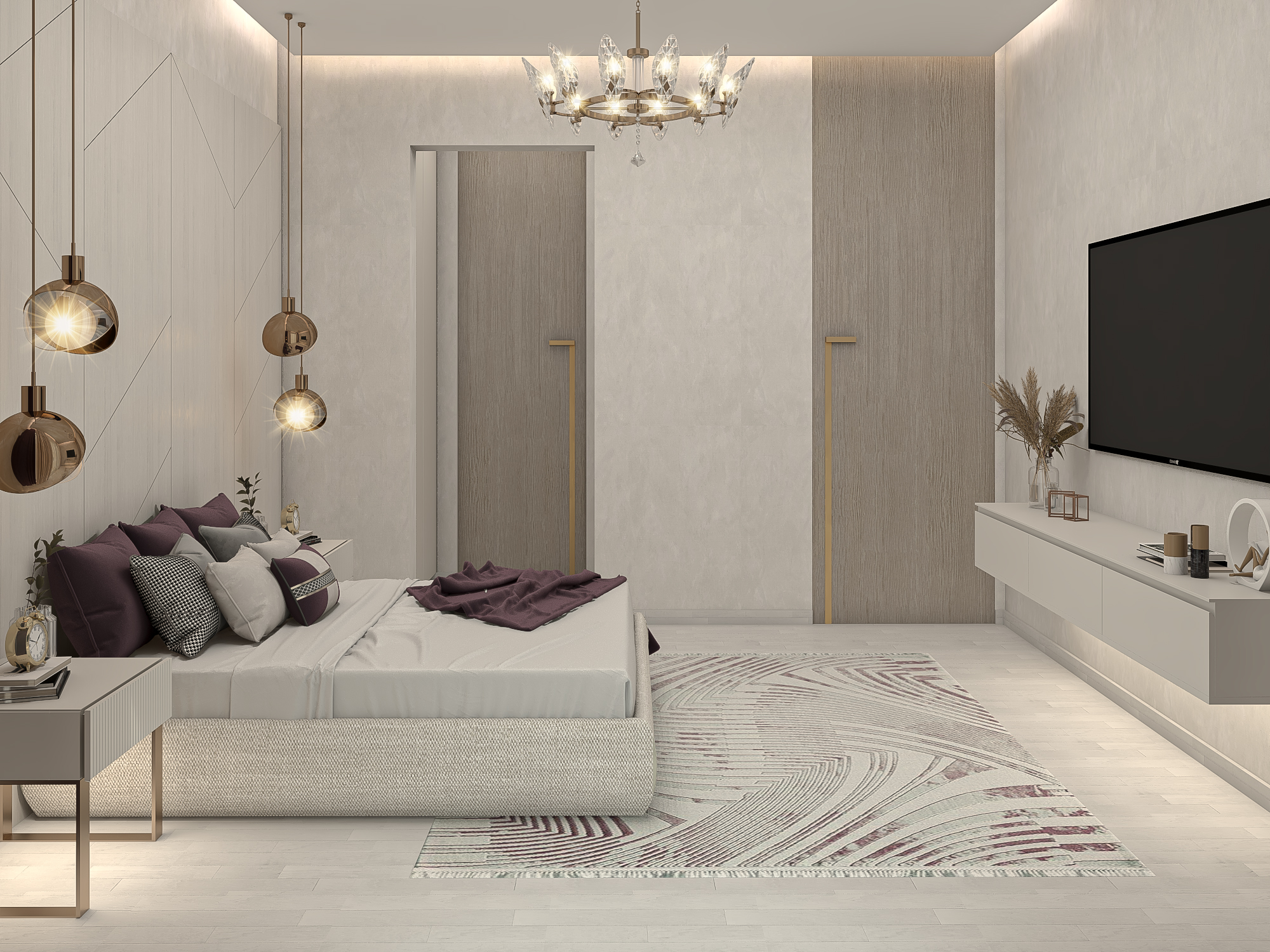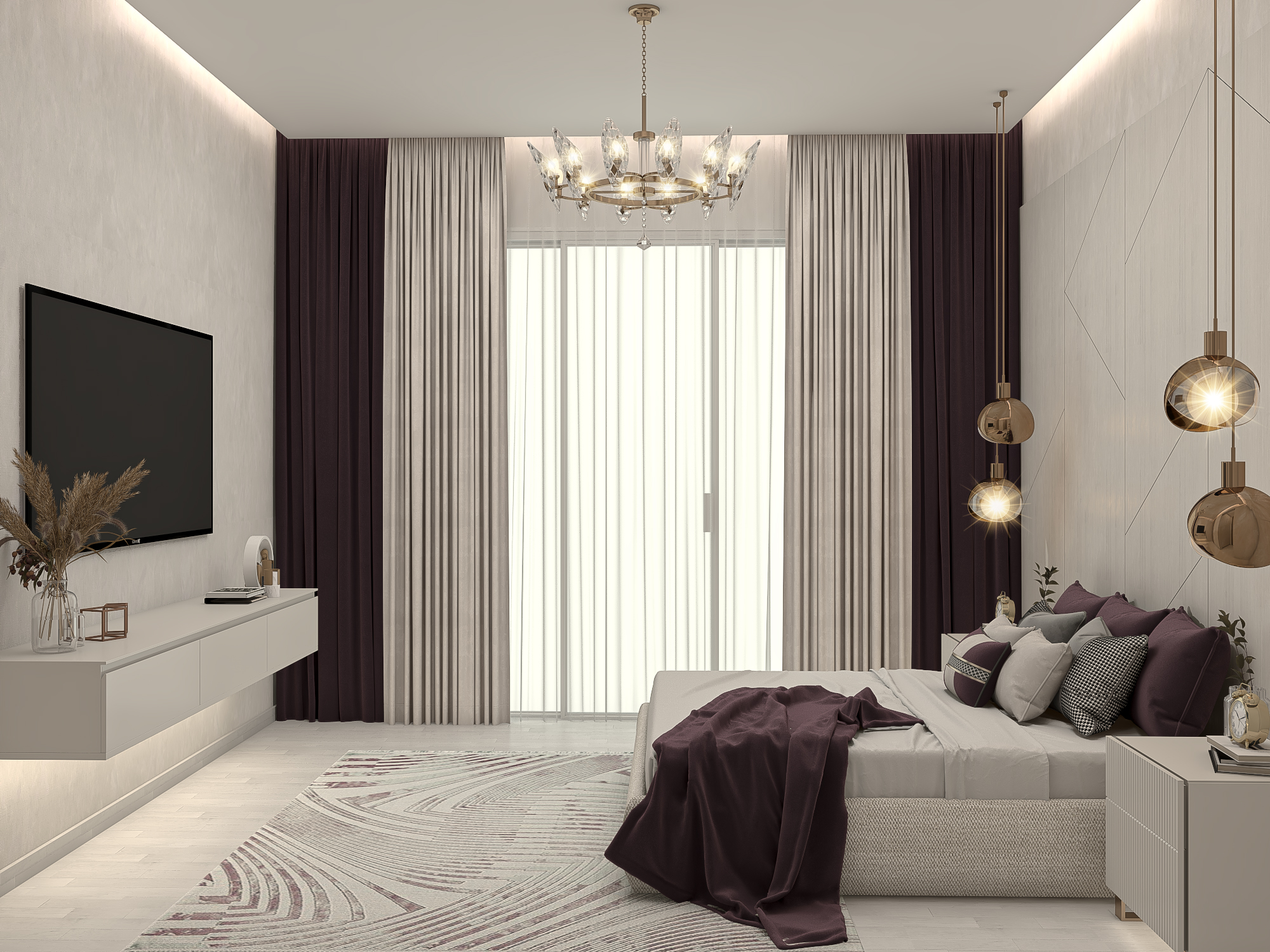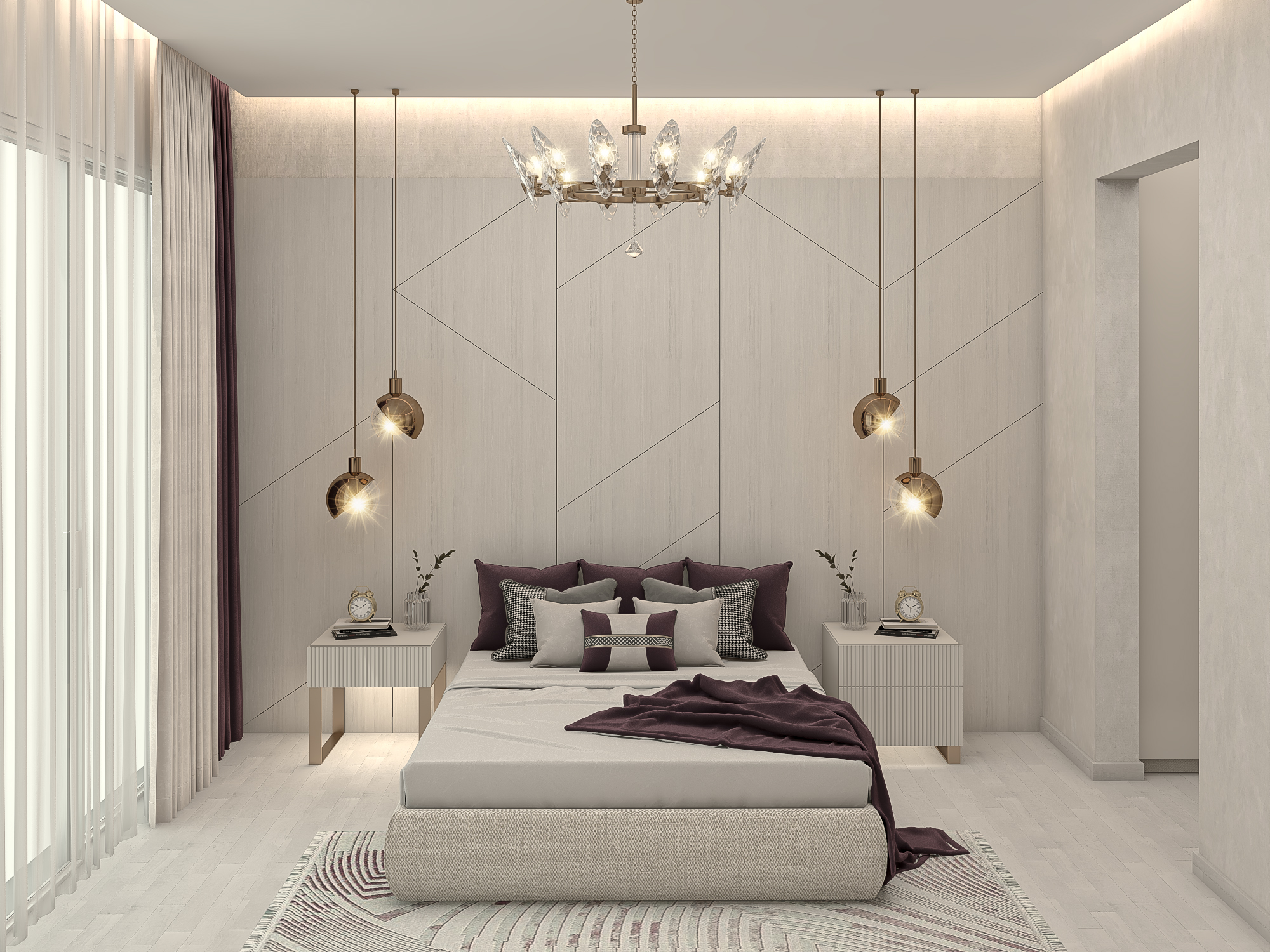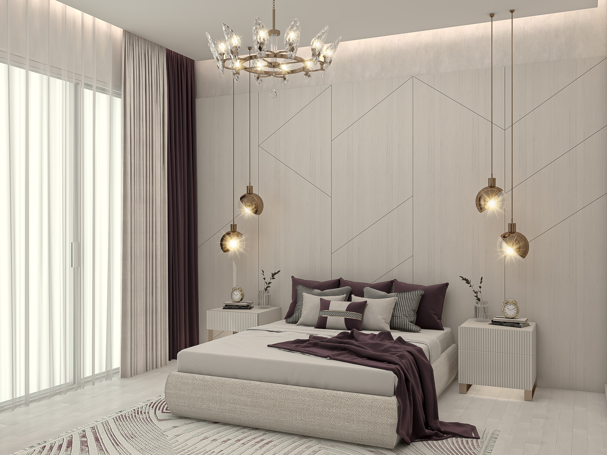 This bedroom features a soothing neutral palette accented with deep plum tones, creating a luxurious yet calming atmosphere. Thoughtfully layered lighting and textures enhance the refined aesthetic.