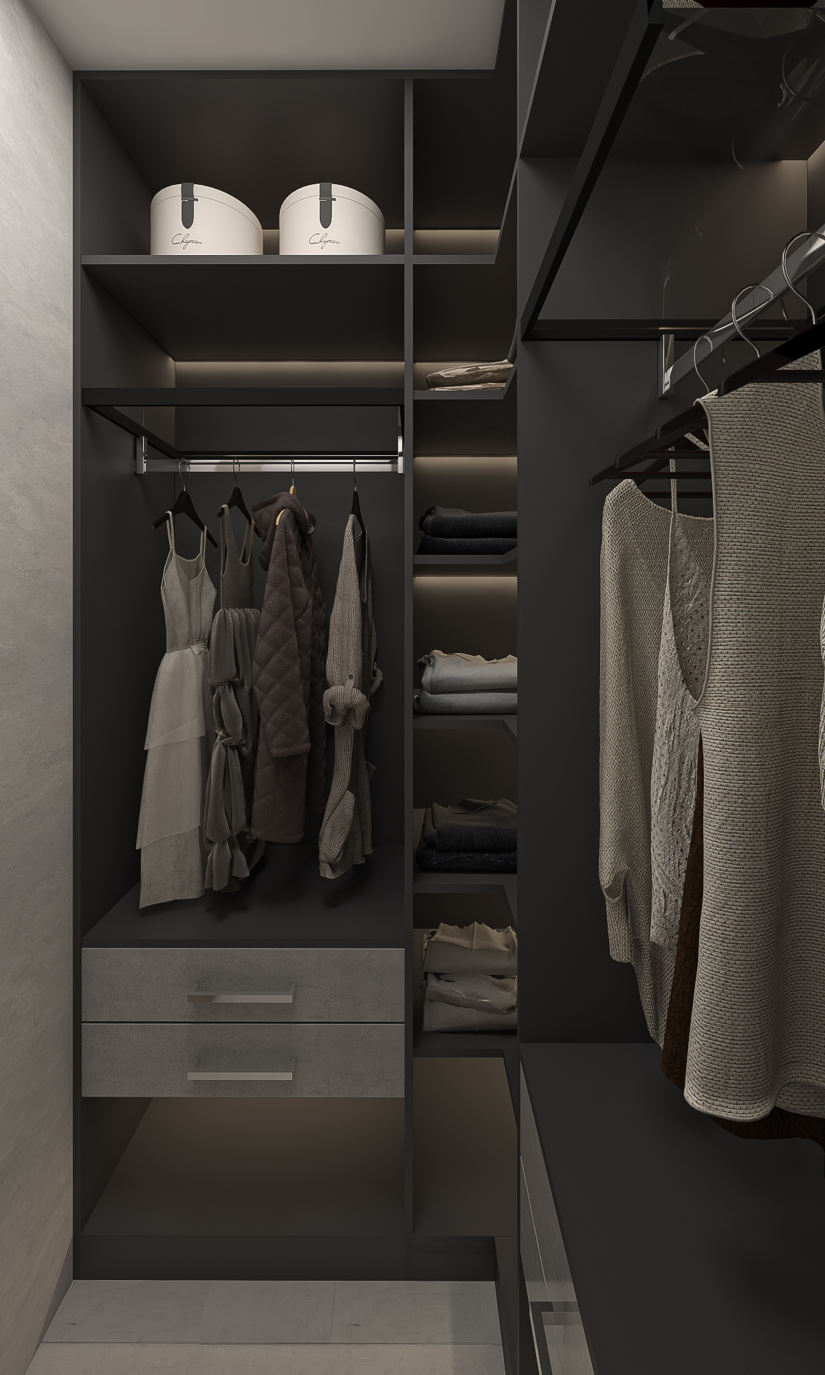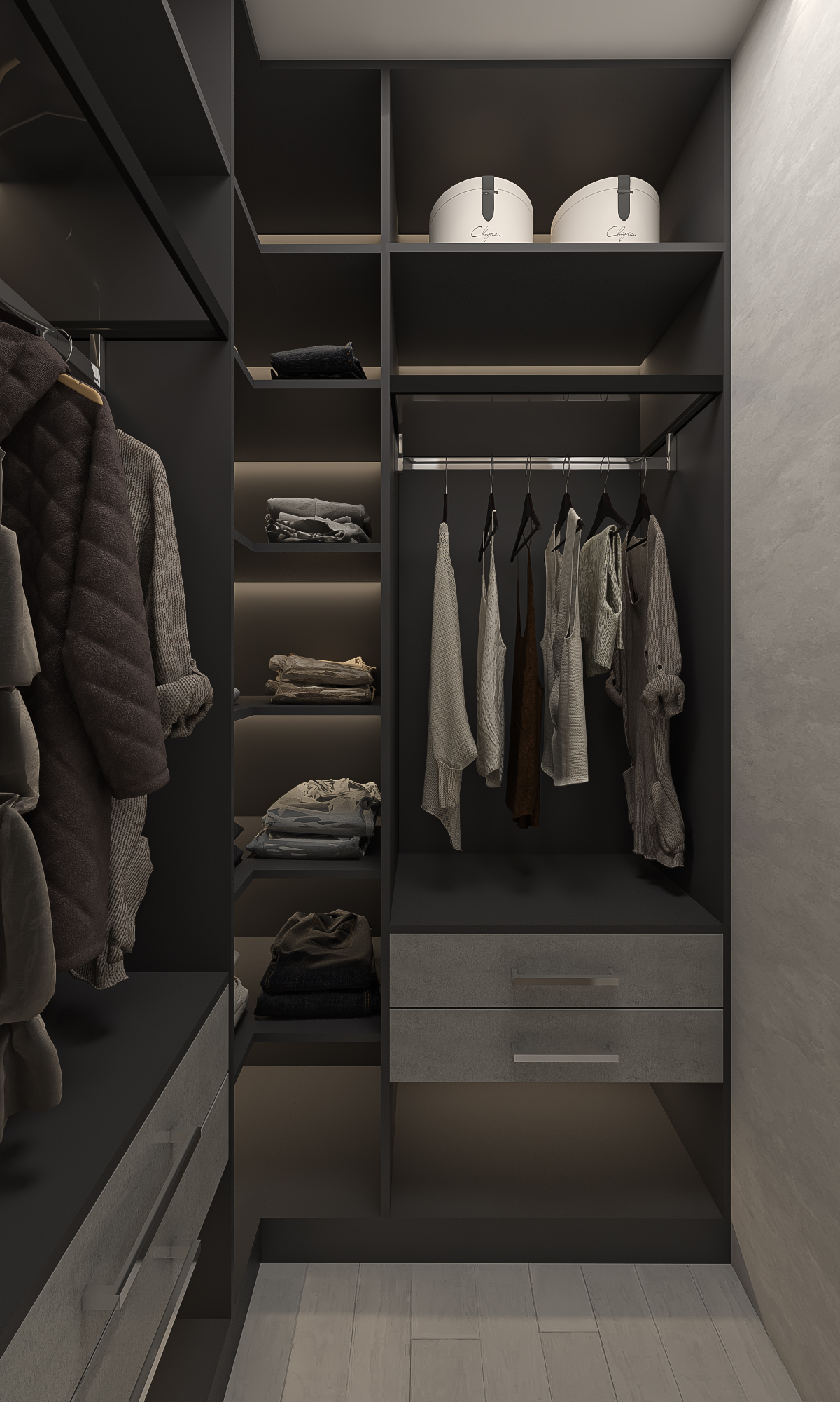 A sleek and functional walk-in closet that combines dark-toned cabinetry with ambient lighting for a luxurious dressing experience. The layout maximizes storage while maintaining a stylish, high-end feel.