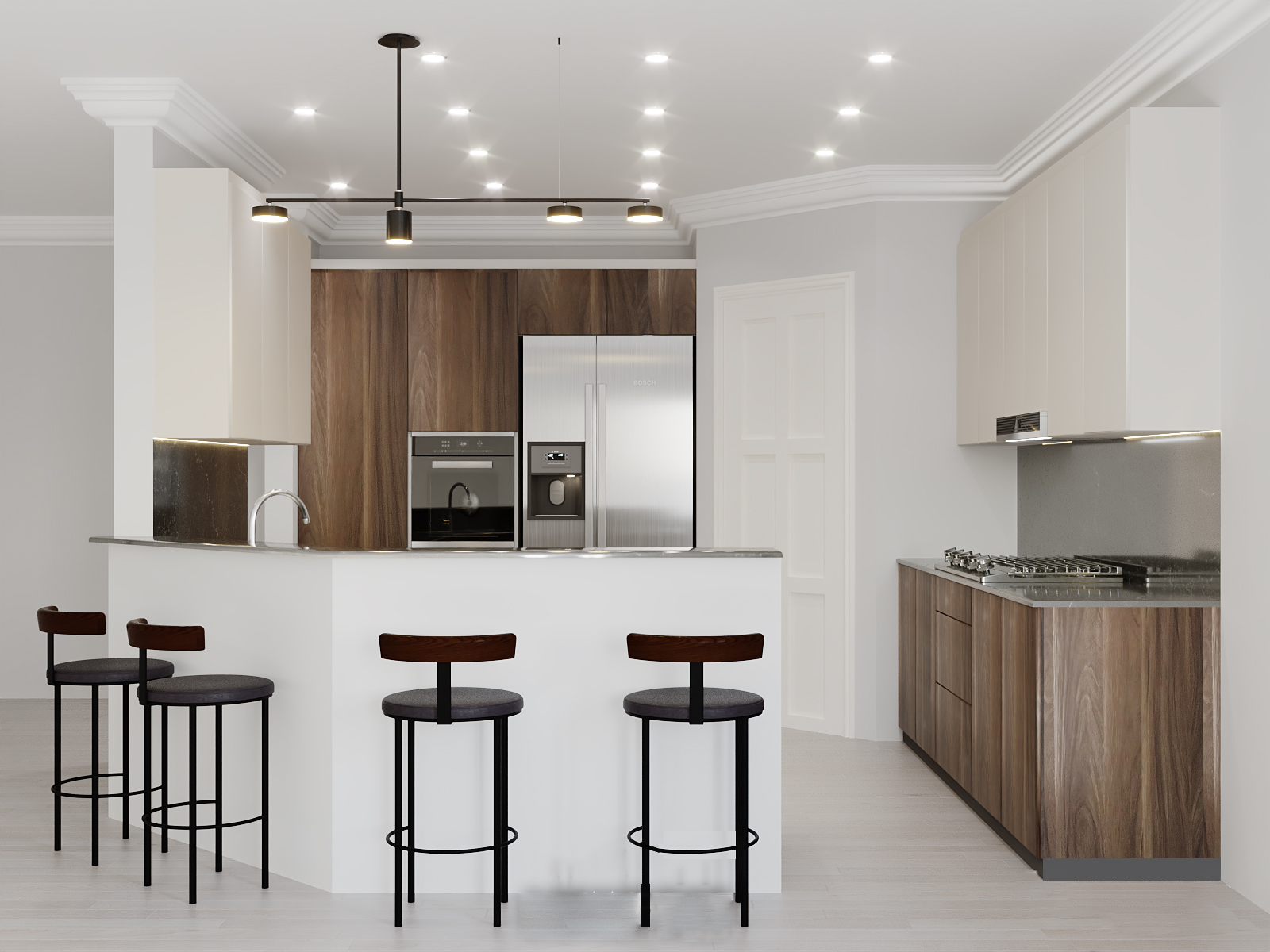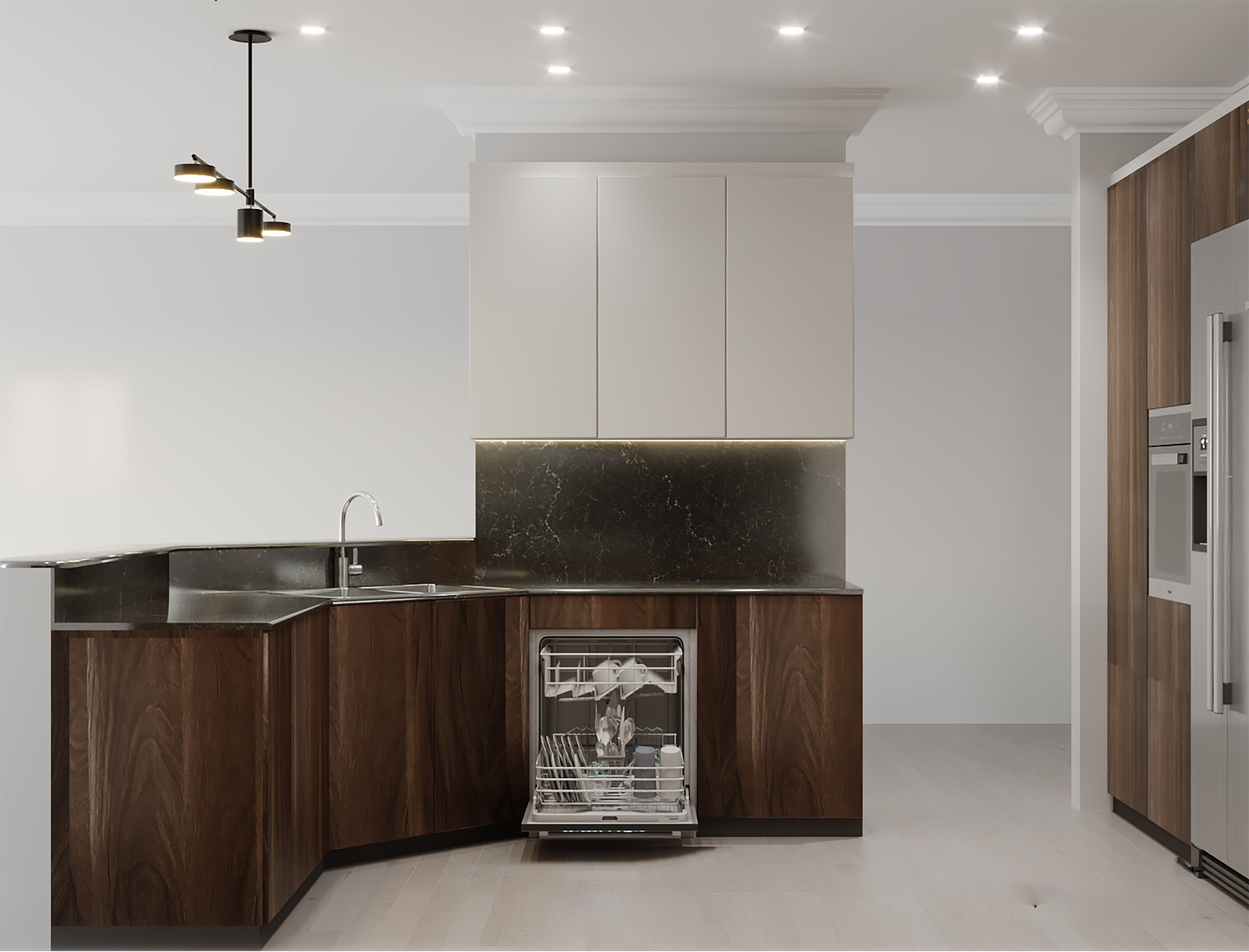 A harmonious blend of classic cabinetry and contemporary finishes, this kitchen delivers warmth, function, and elegance. Premium appliances and cozy lighting complete the sophisticated look.