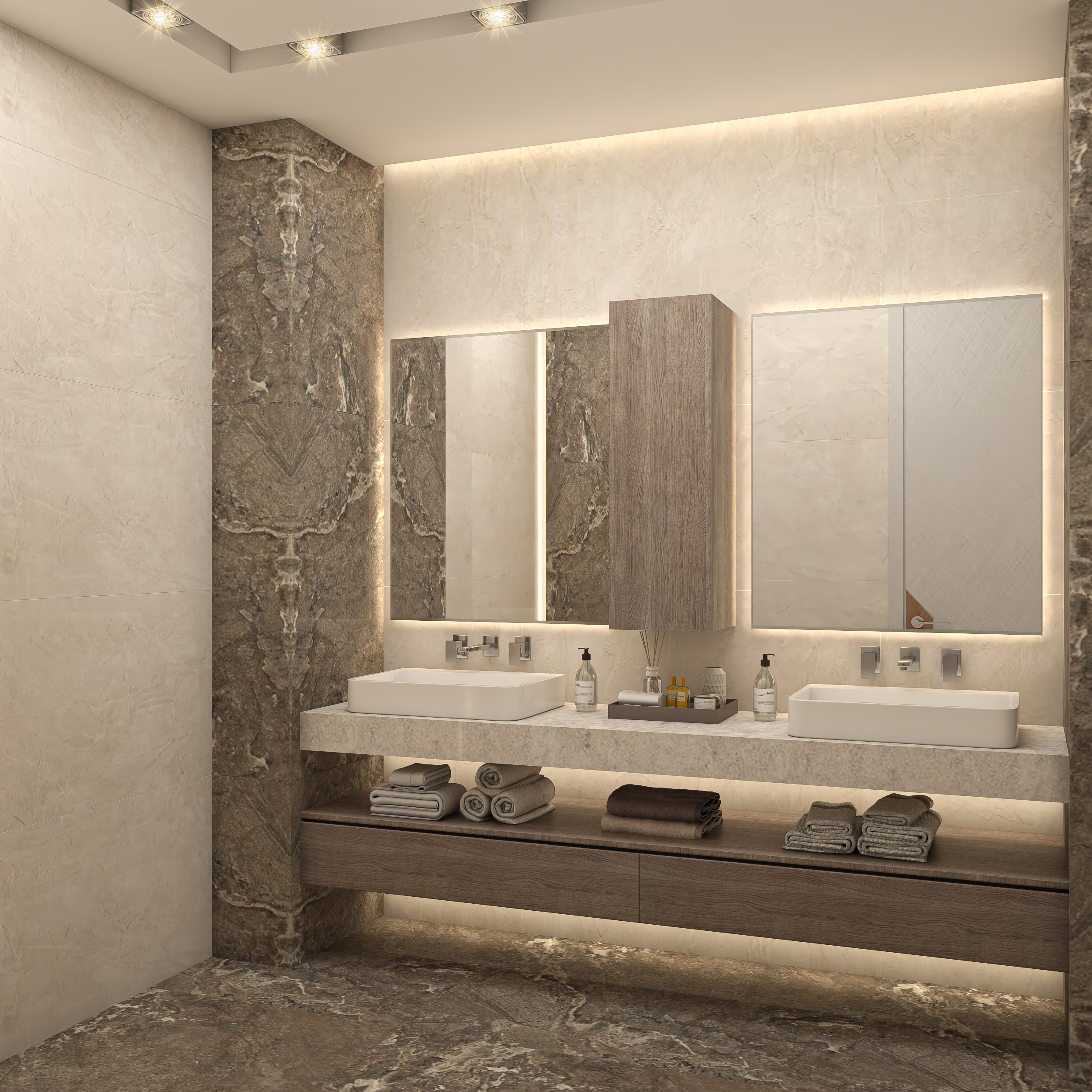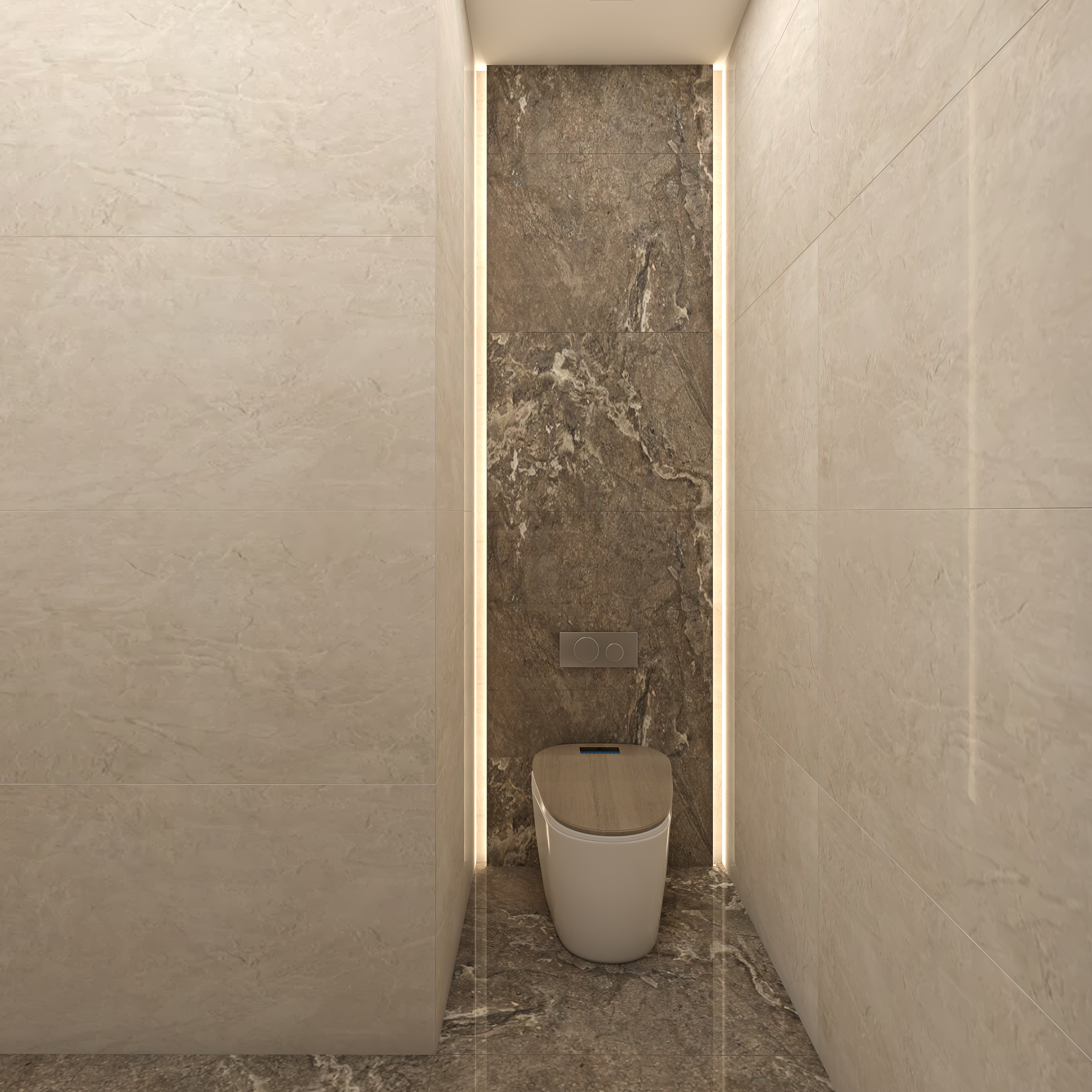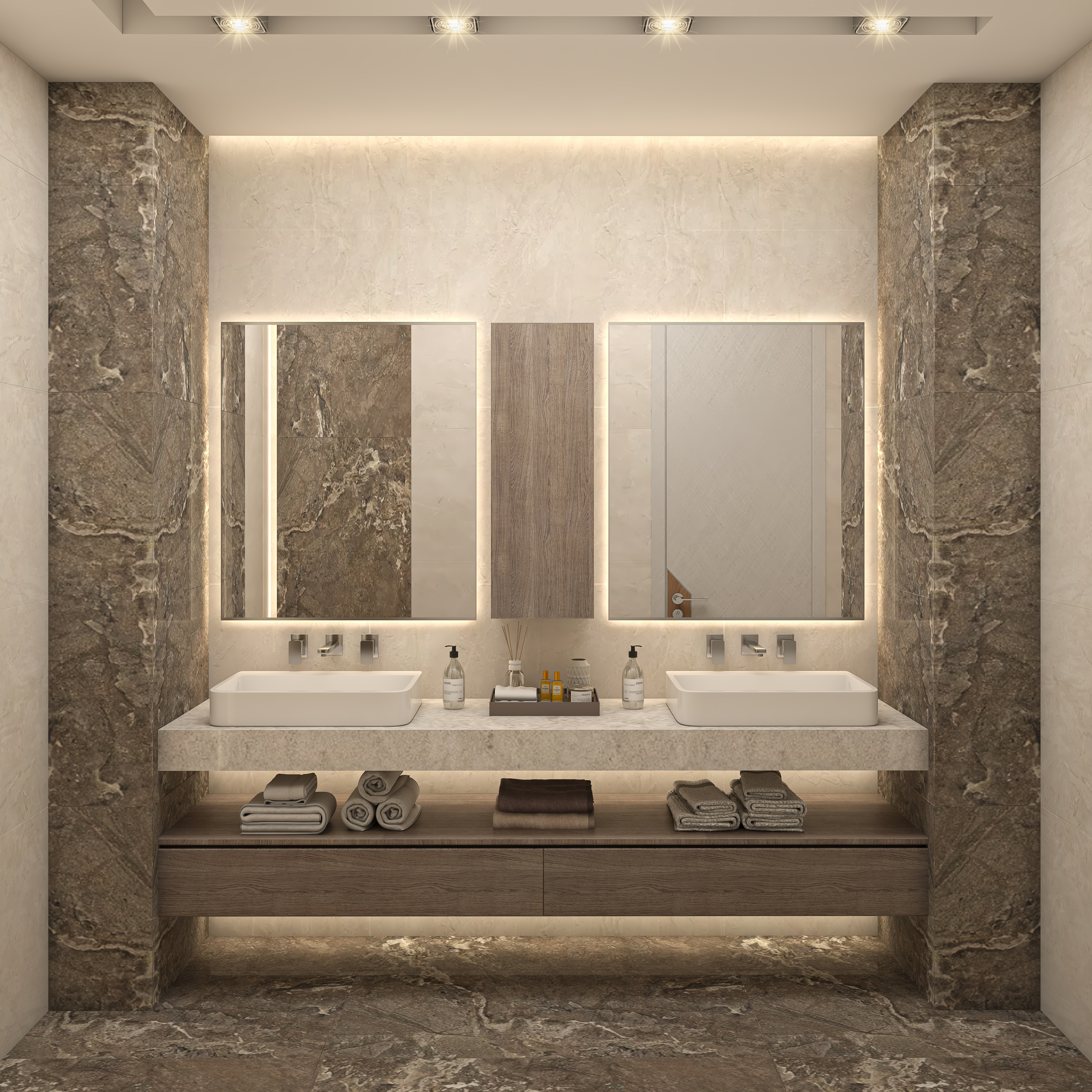 With a rich palette of taupe stone and warm wood tones, this bathroom is the epitome of quiet sophistication. Carefully curated textures and concealed lighting enhance the minimalistic layout, offering a grounded yet elegant atmosphere.