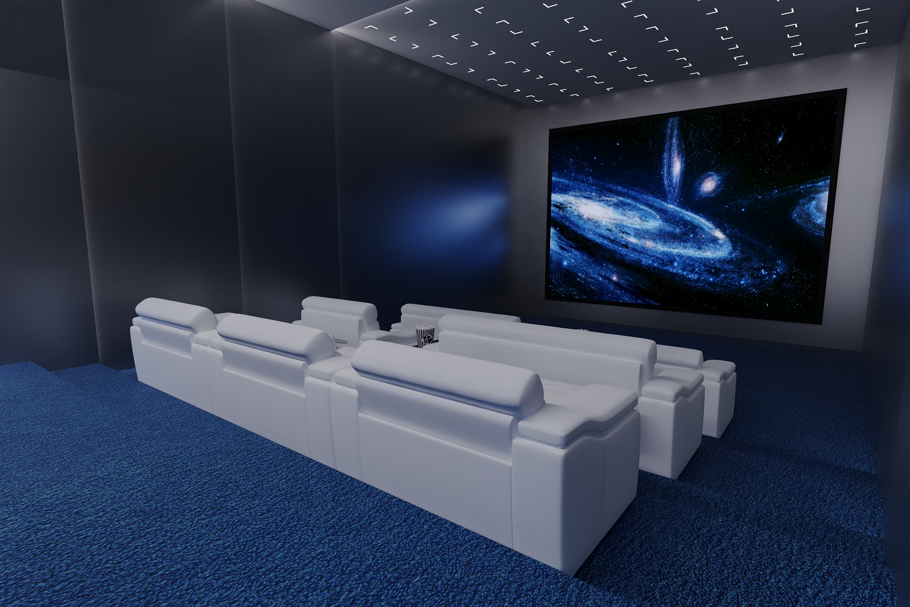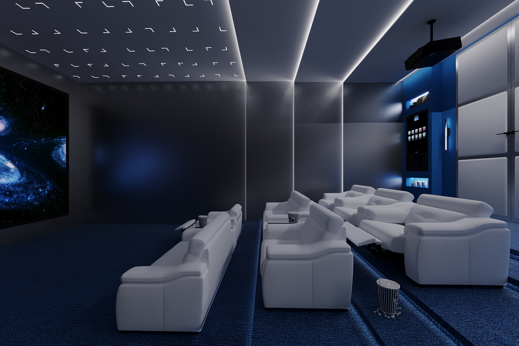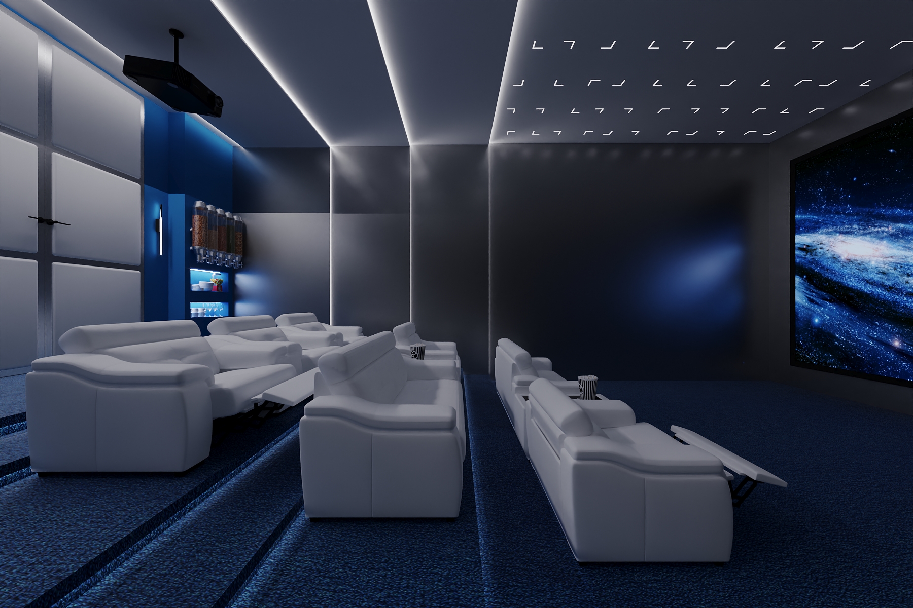 A sleek and immersive home theater designed for luxury viewing experiences. Featuring ambient lighting, plush recliners, and cutting-edge audiovisuals, it delivers both comfort and spectacle.