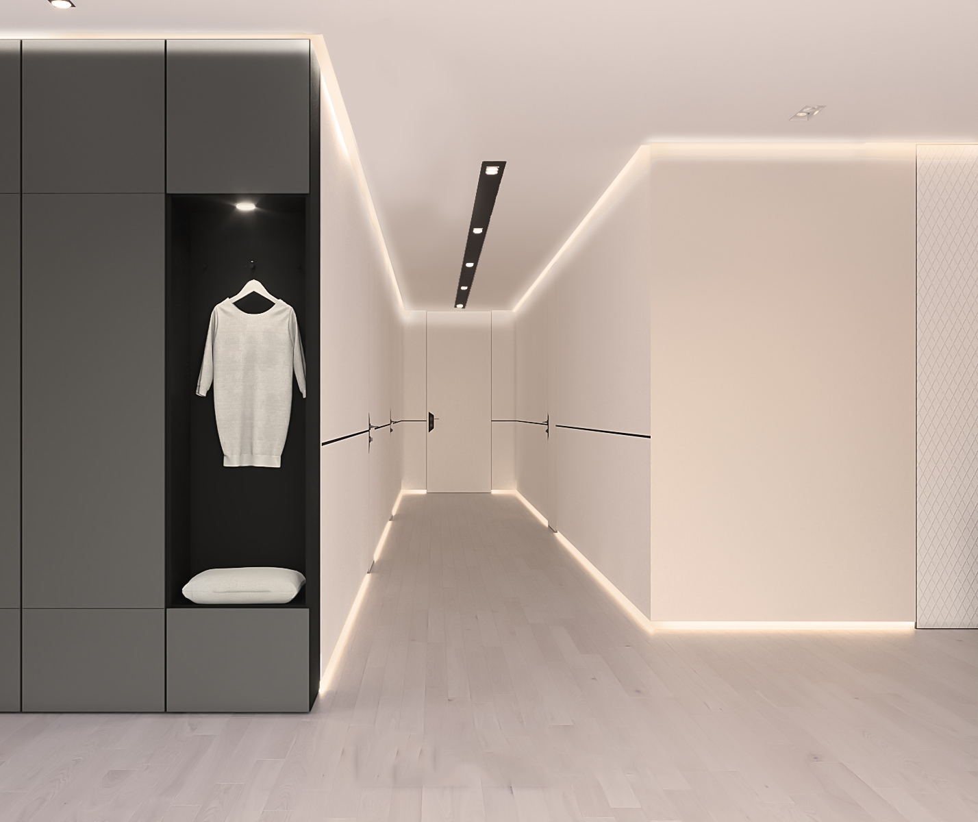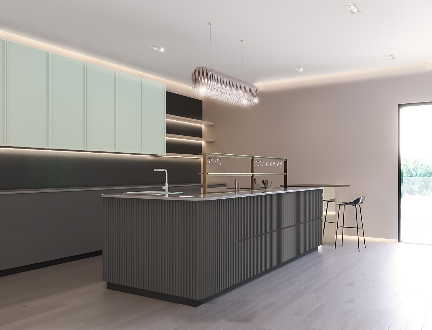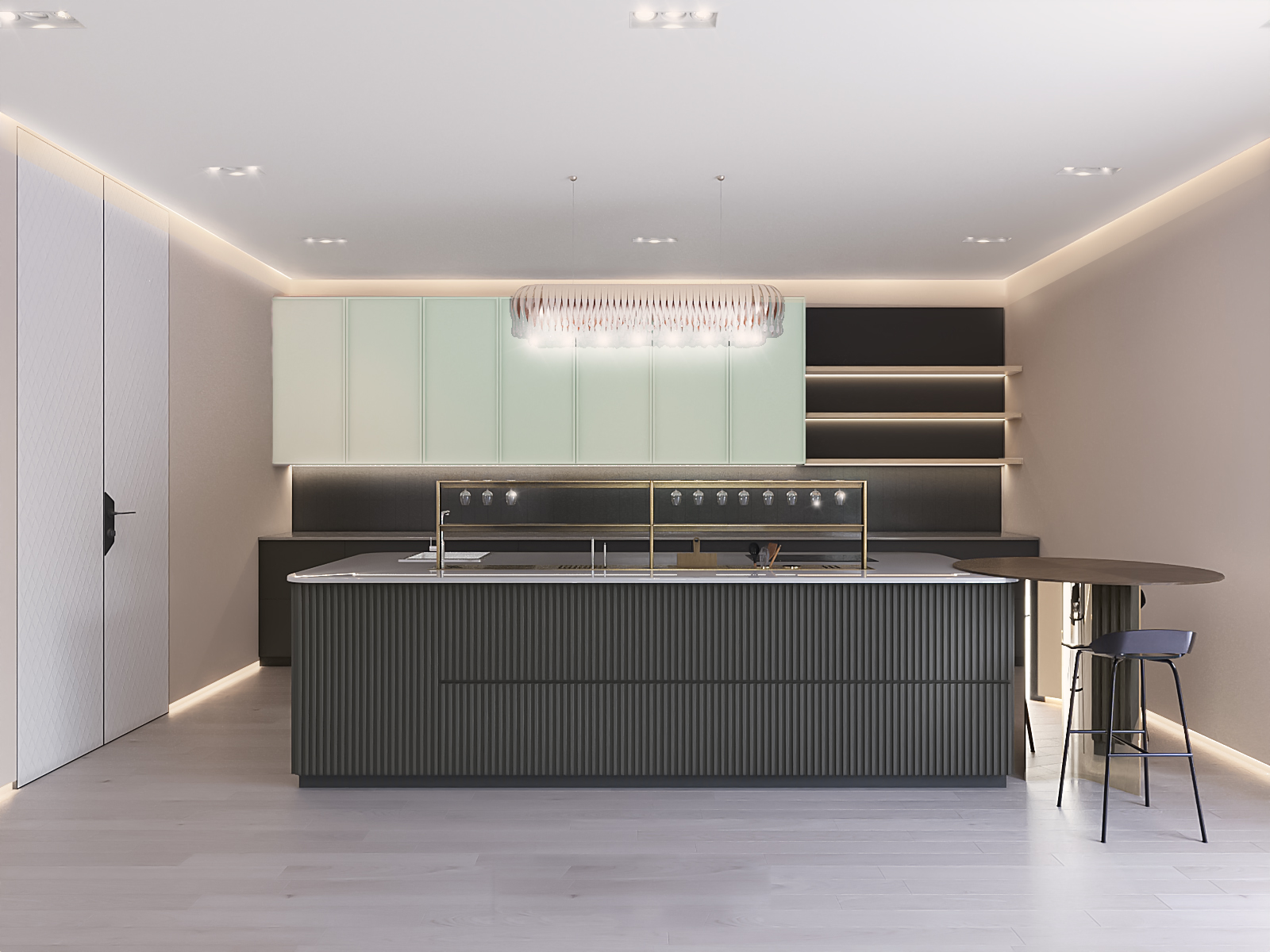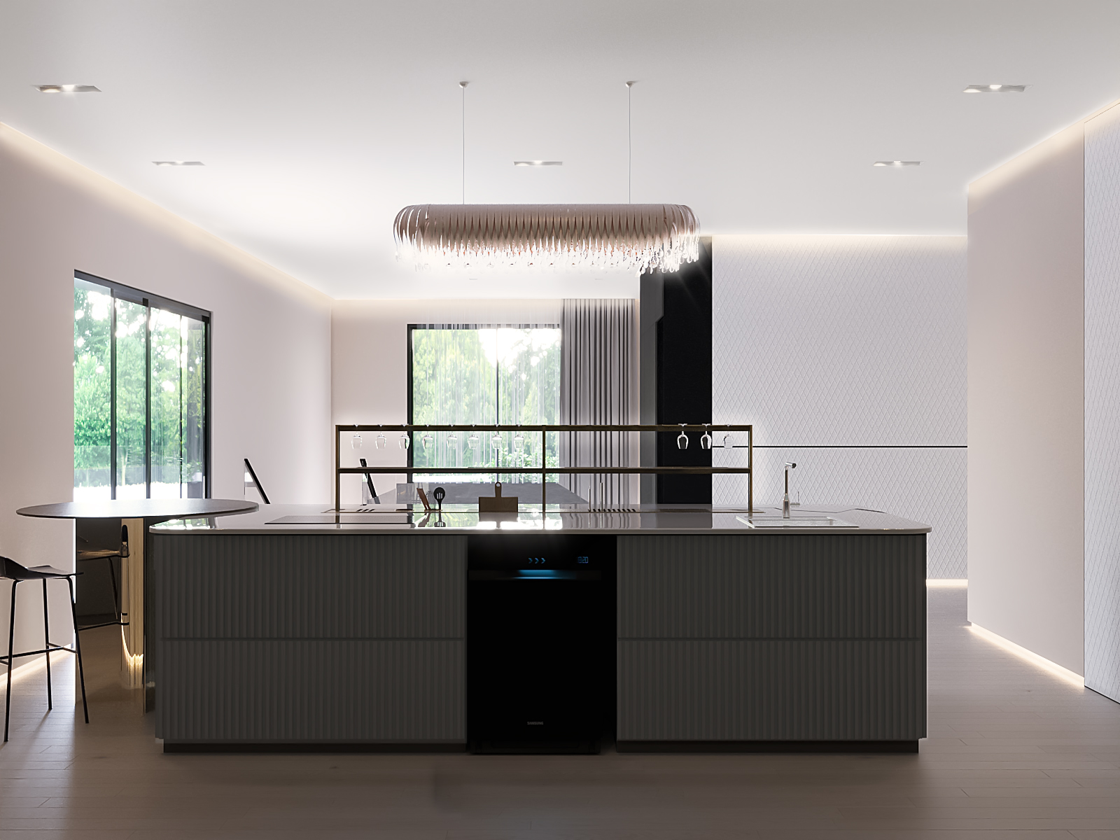 A sleek and modern kitchen design blending elegance with functionality, perfect for open-plan living. Minimalist finishes, clean lines, and ambient lighting define the aesthetic.