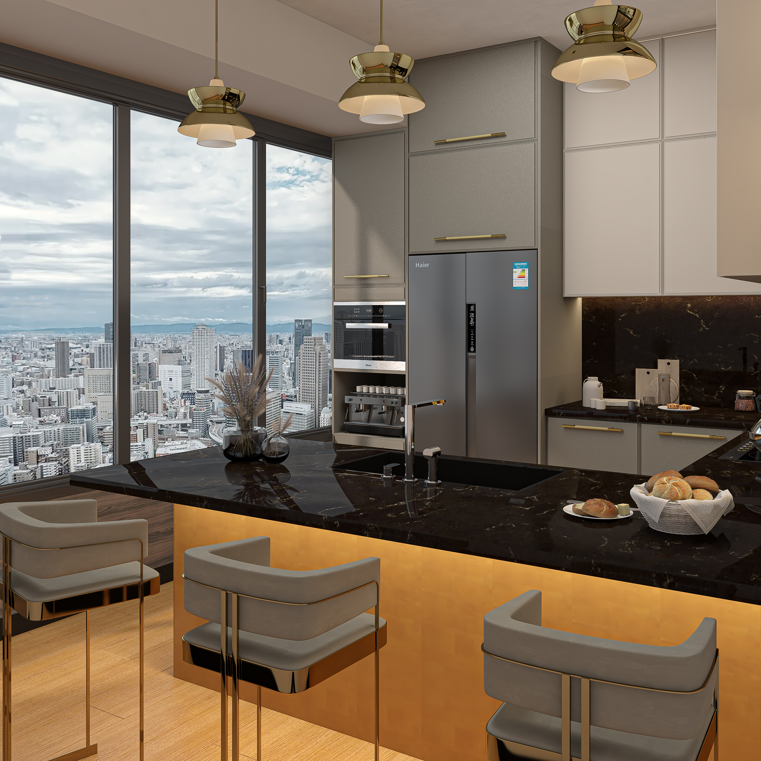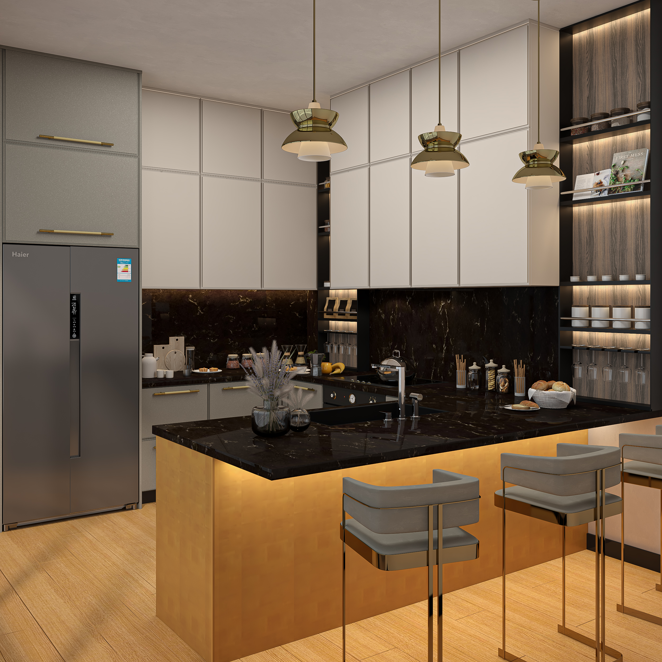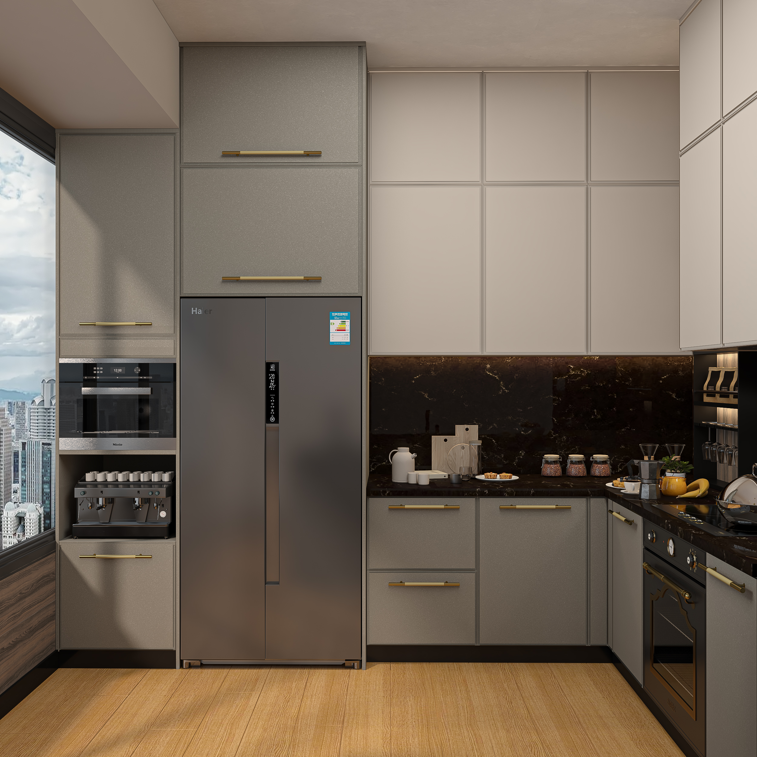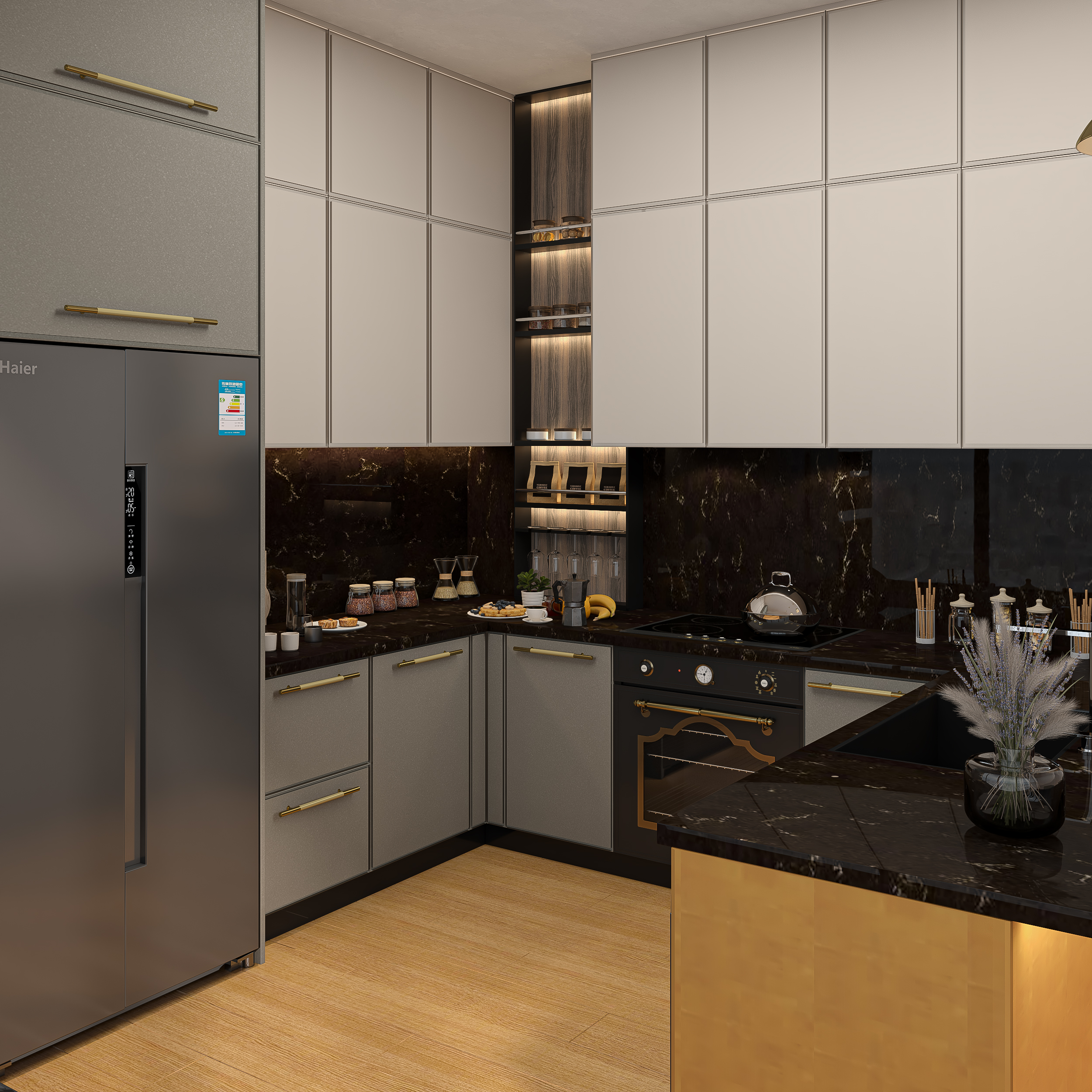 A contemporary kitchen blending matte grey and cream cabinetry with rich gold accents and marble textures. Perfectly balanced between elegance and functionality.