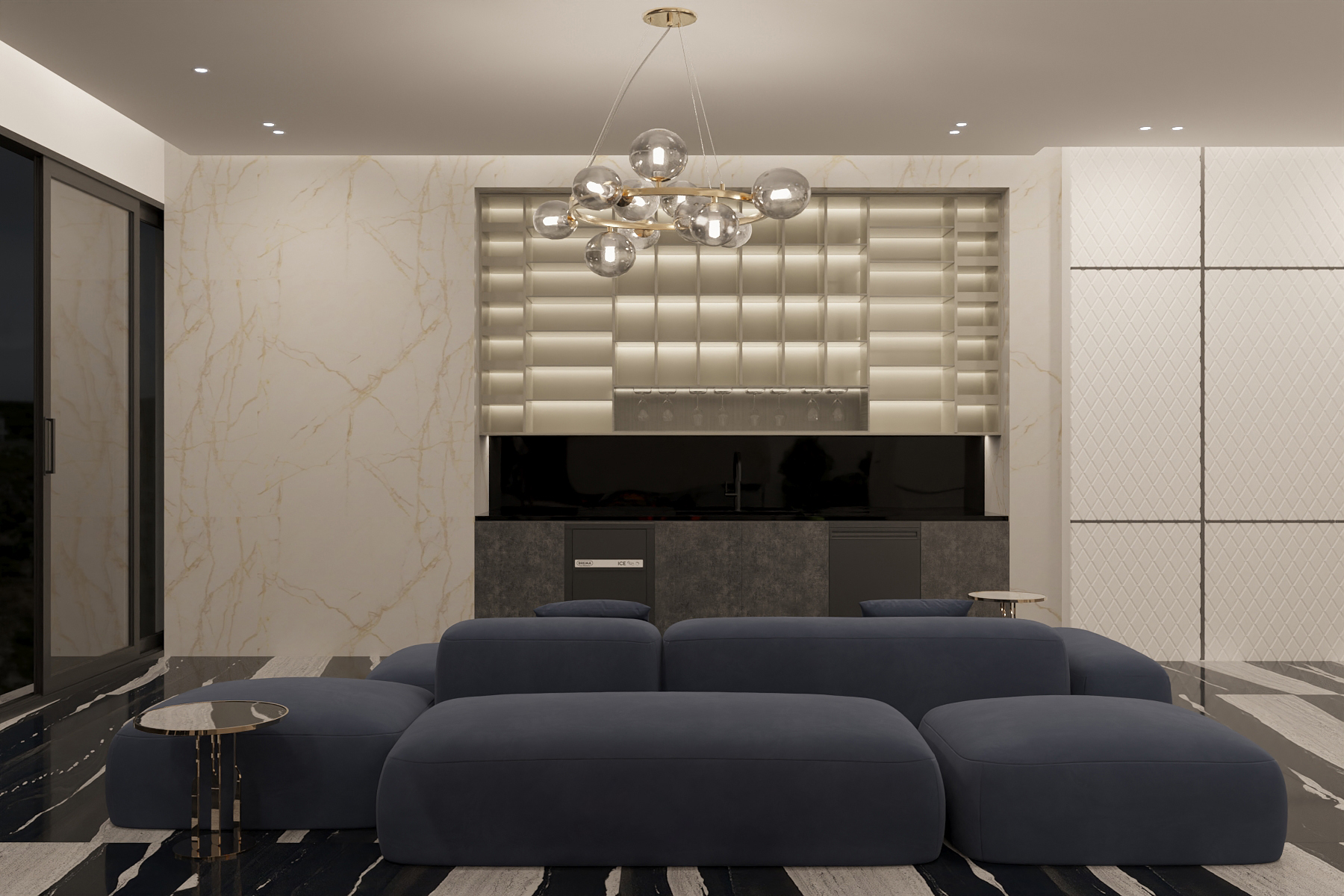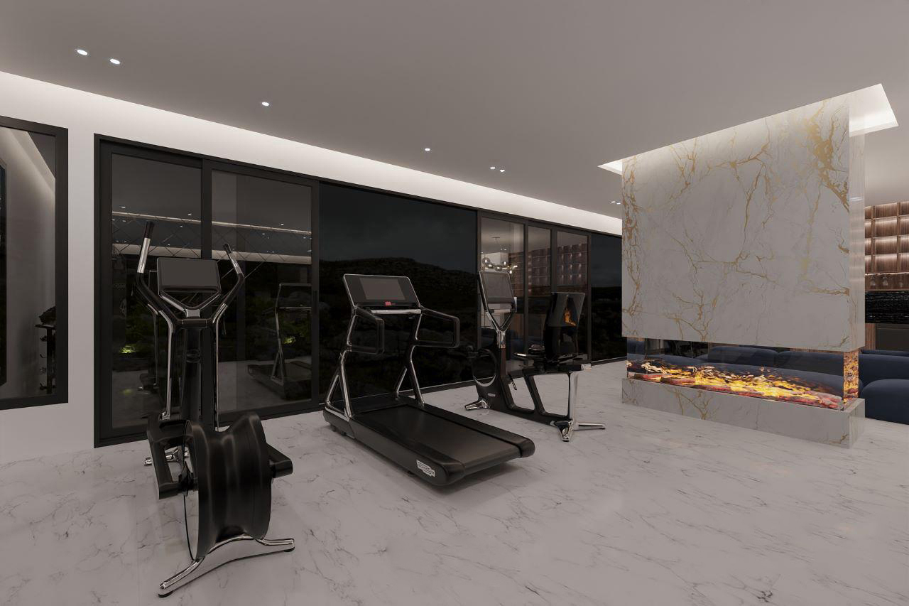 A sleek fusion of fitness and leisure, this modern space features premium gym equipment, elegant finishes, and a cozy lounge with a double-sided marble fireplace.
