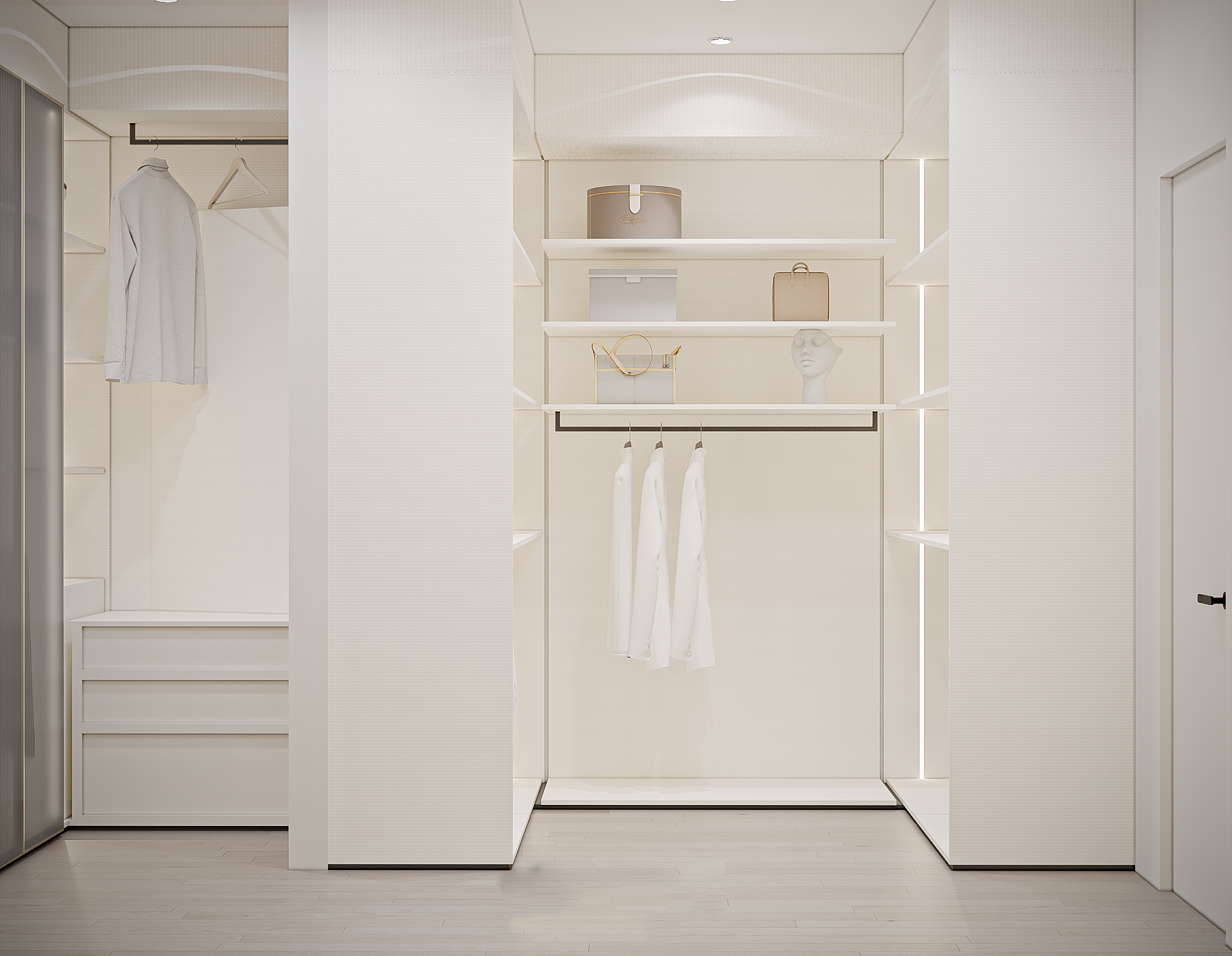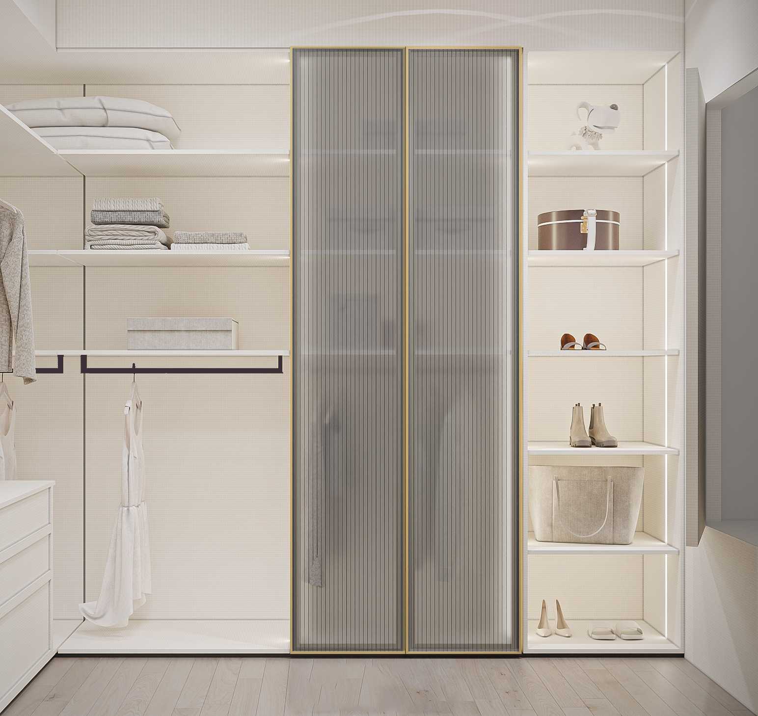 A refined walk-in wardrobe featuring soft white tones, gold-framed fluted glass doors, and ambient lighting. Designed for elegance, clarity, and highly organized storage.