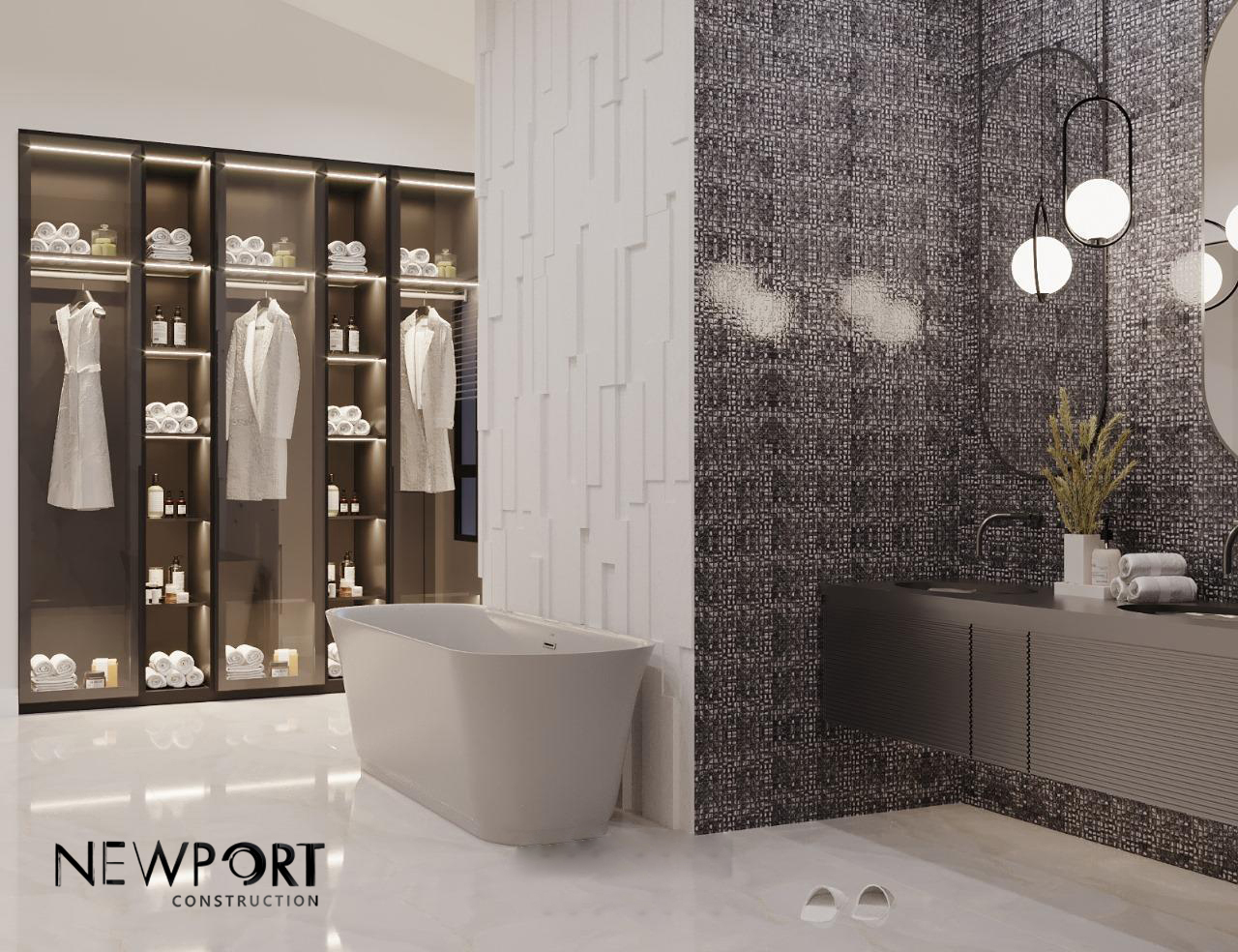 This bathroom exemplifies sleek, modern elegance with its monochrome palette, textural contrasts, and open layout that seamlessly combines style with functionality. Every element is designed to elevate comfort while maintaining high-end aesthetics.