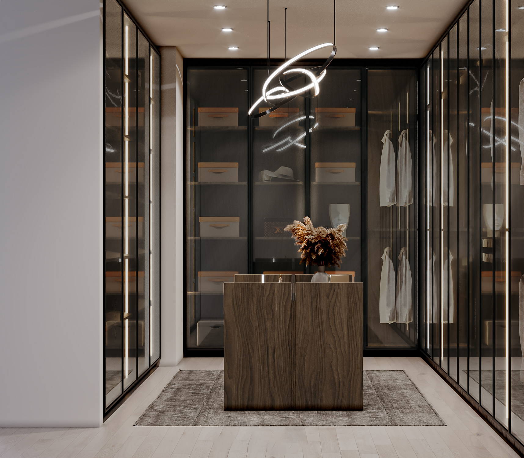 A sleek and sophisticated walk-in wardrobe designed with glass-front cabinets, ambient lighting, and minimalist aesthetics to deliver high-end fashion storage with hotel-suite luxury.