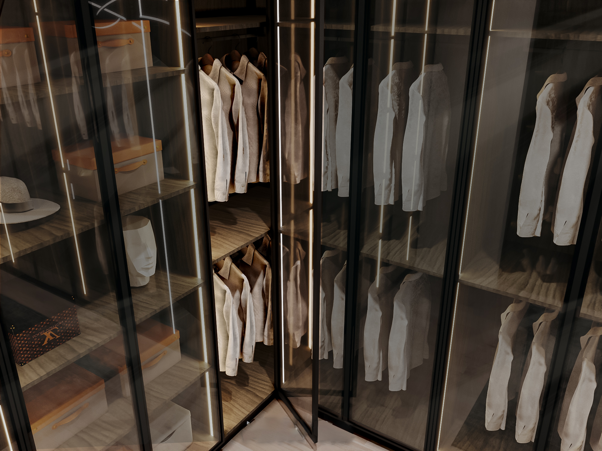 - Transparent glass doors with internal lighting offer a clean display of garments and accessories.