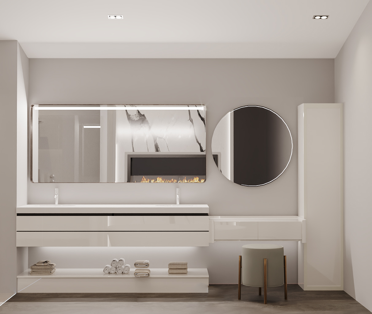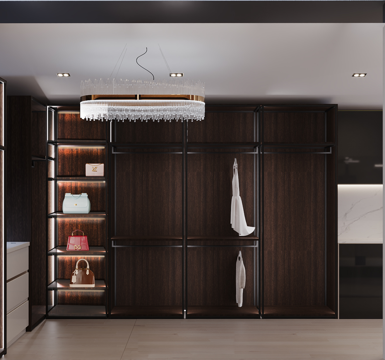 A seamless blend of functionality and elegance, this space combines laundry, wardrobe, and vanity areas into a unified luxury experience. Designed with rich materials and ambient lighting, it enhances daily routines with sophistication.