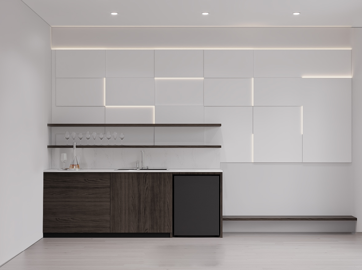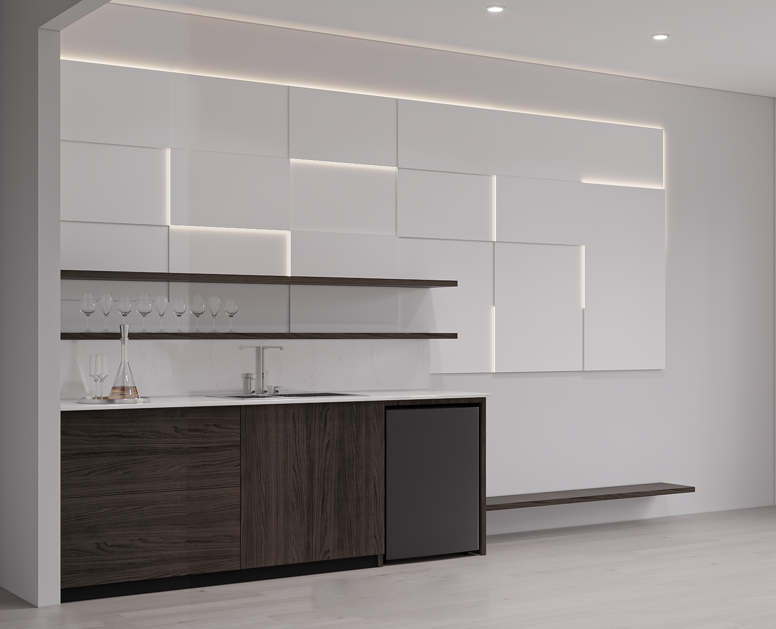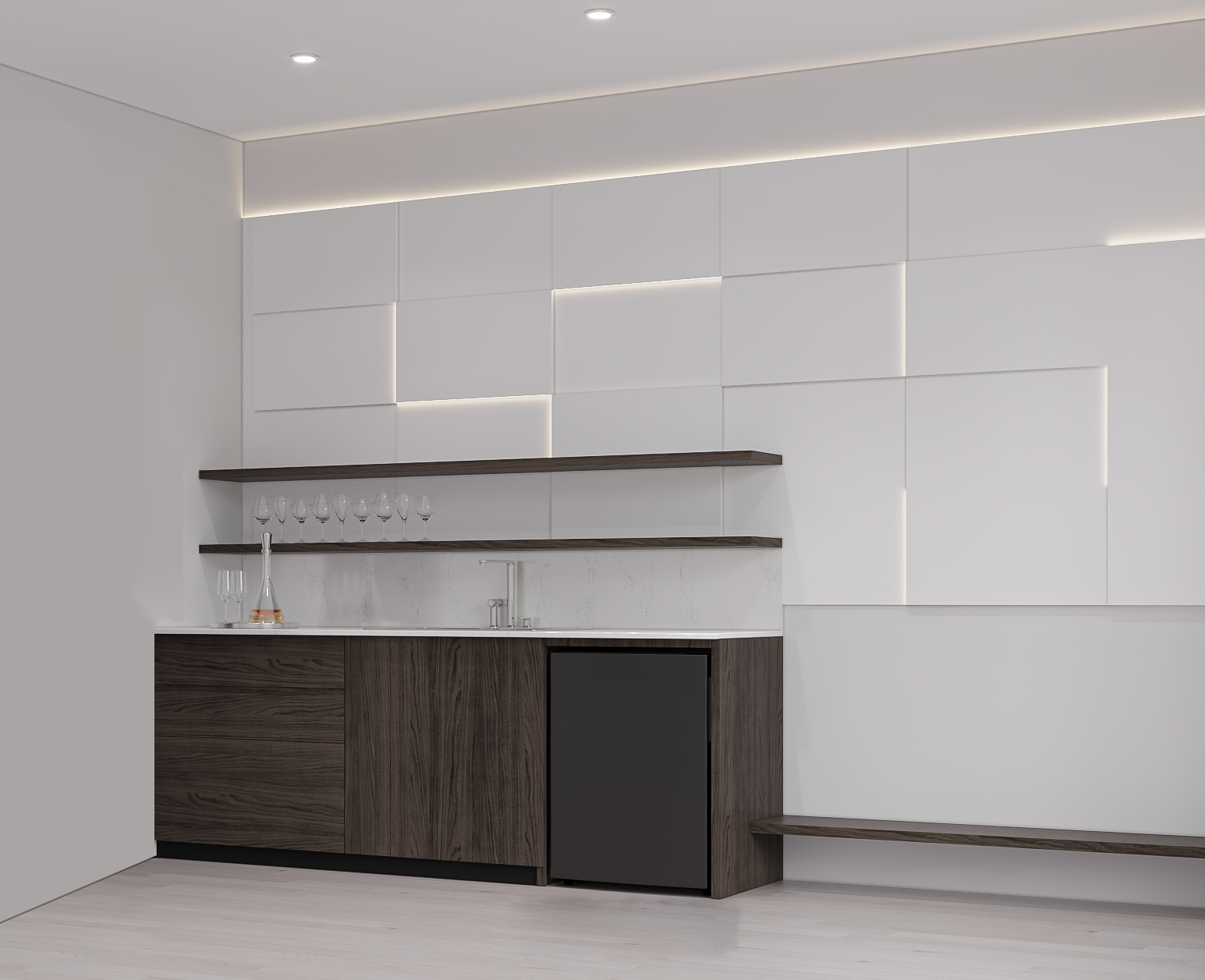 A sleek and modern wet bar that blends dark wood textures with crisp white surfaces and ambient backlit panels. This setup creates a functional yet visually striking space for casual hosting or quiet luxury.