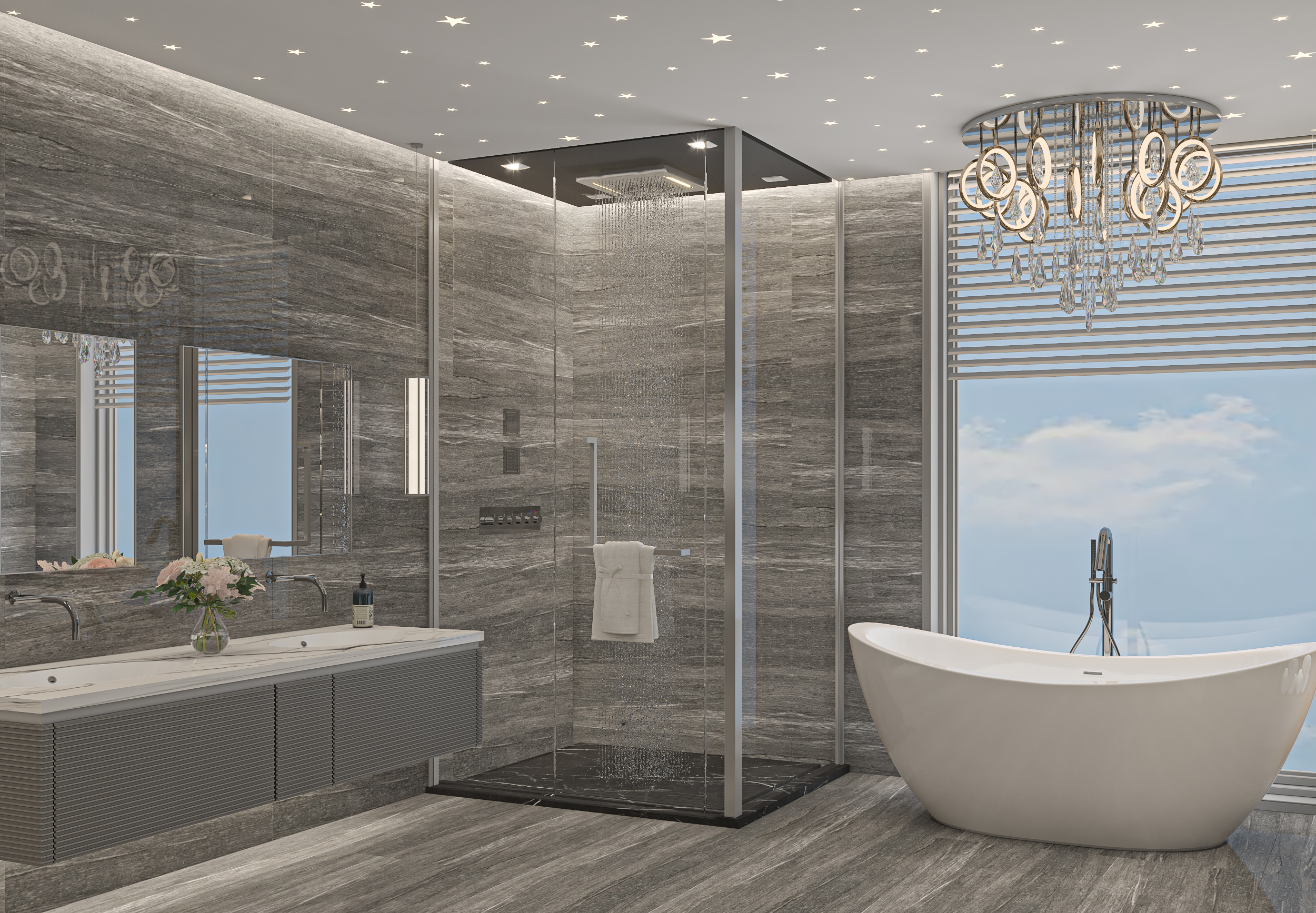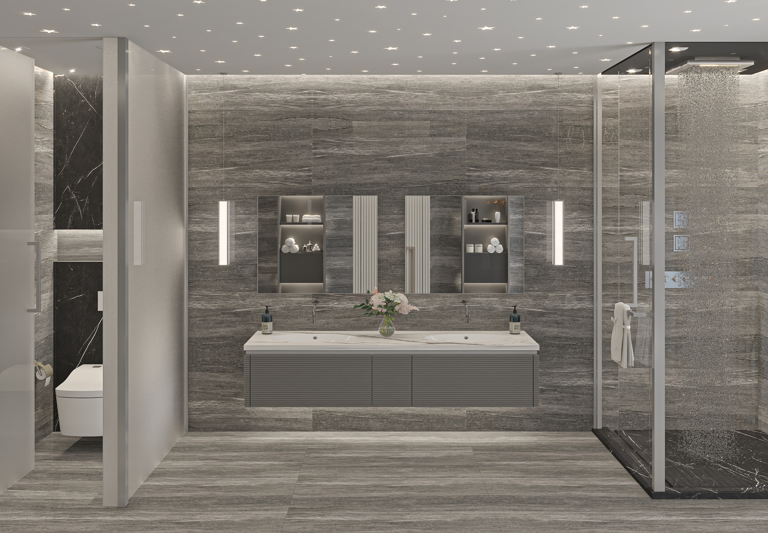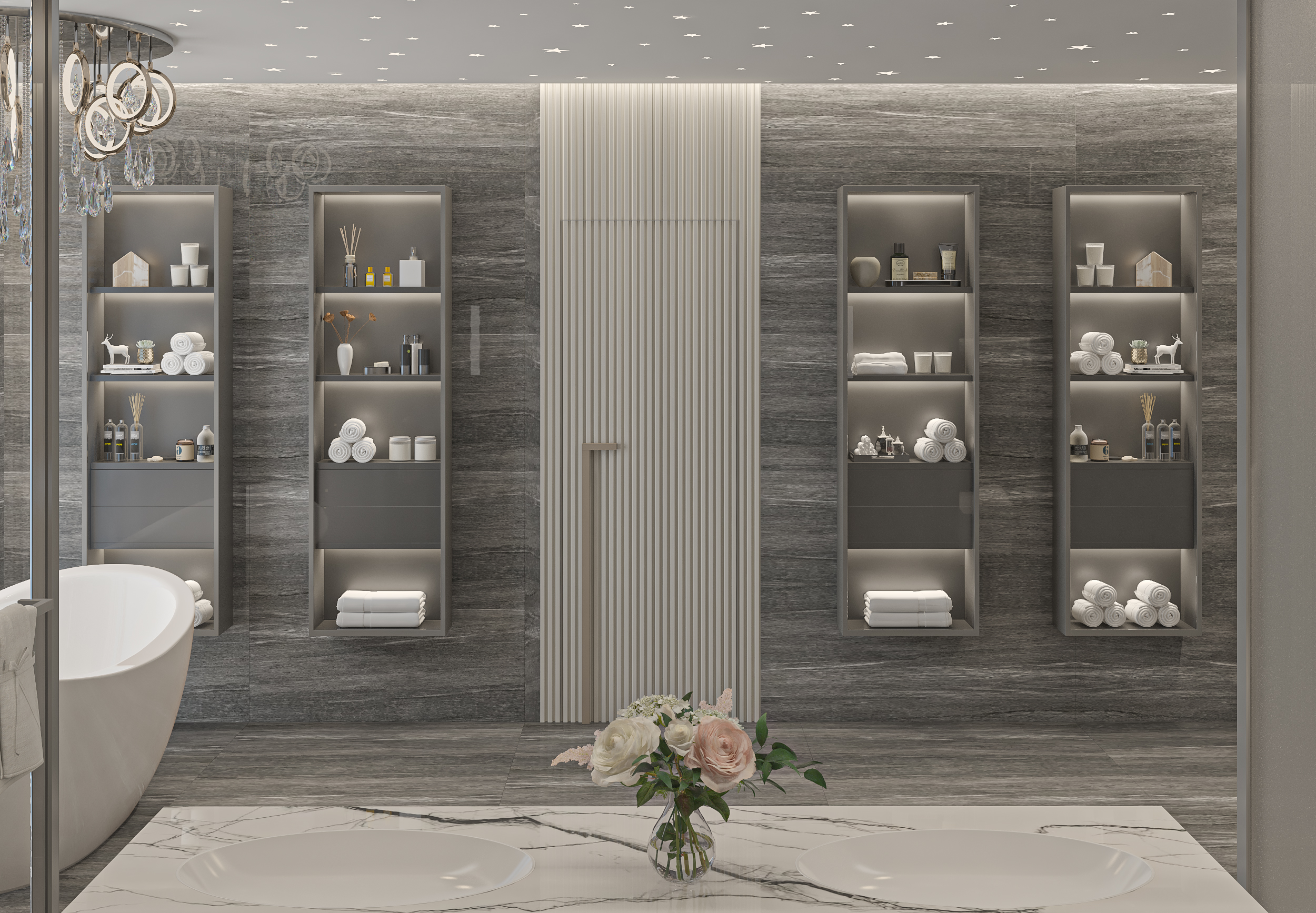 This stunning bathroom blends modern design with serene luxury, creating a spa-like experience at home. The use of natural stone textures, ambient lighting, and refined fixtures makes it an ideal retreat for daily relaxation.