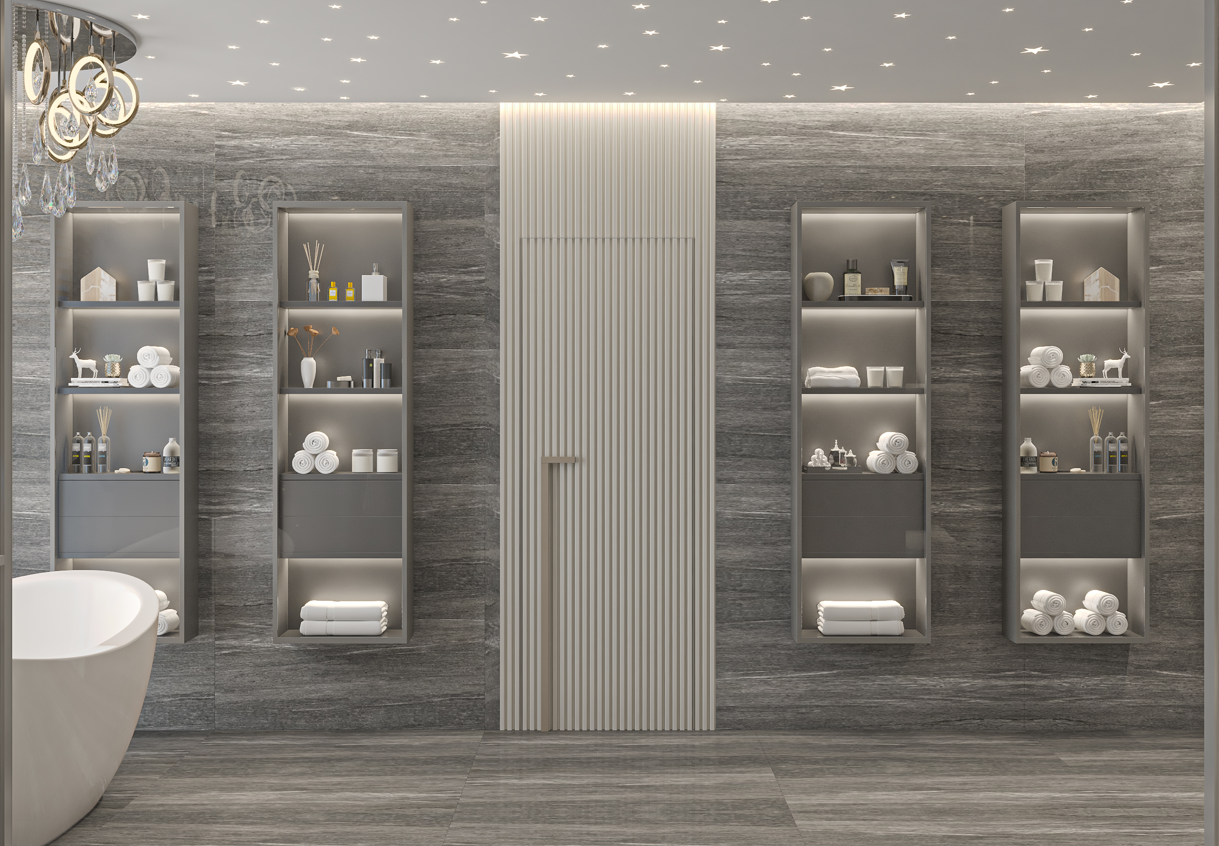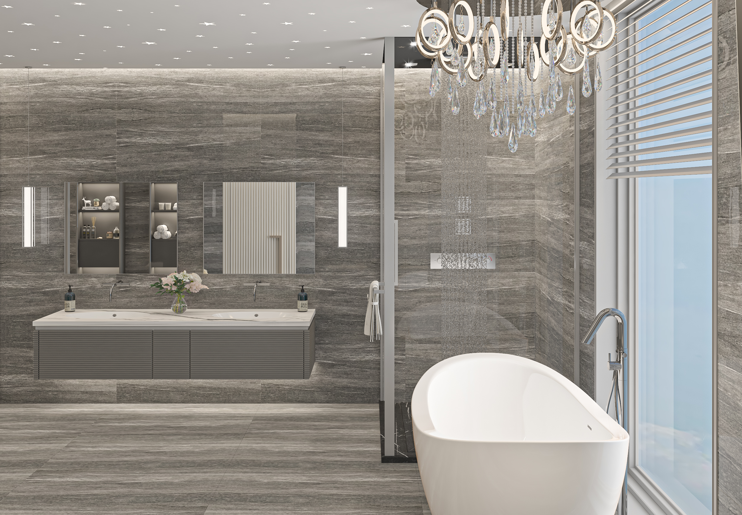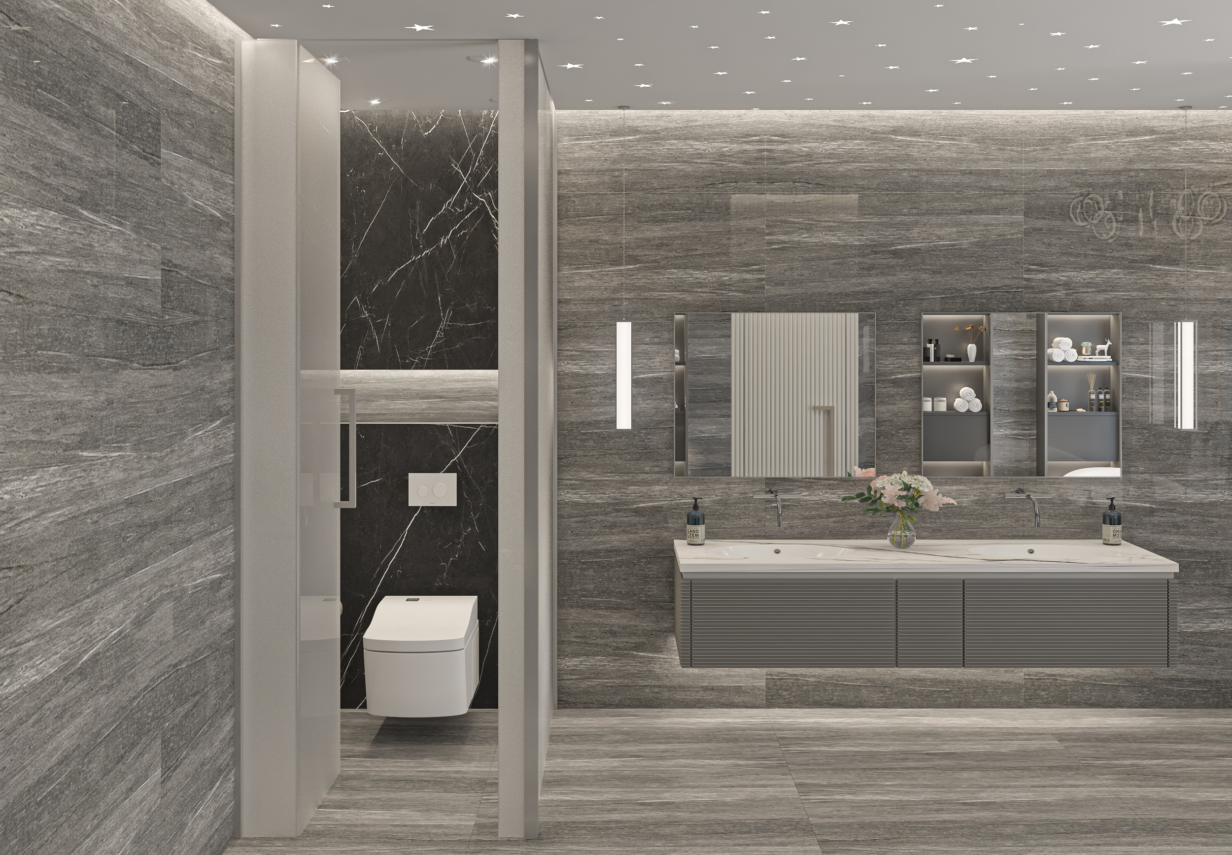 This stunning bathroom blends modern design with serene luxury, creating a spa-like experience at home. The use of natural stone textures, ambient lighting, and refined fixtures makes it an ideal retreat for daily relaxation.