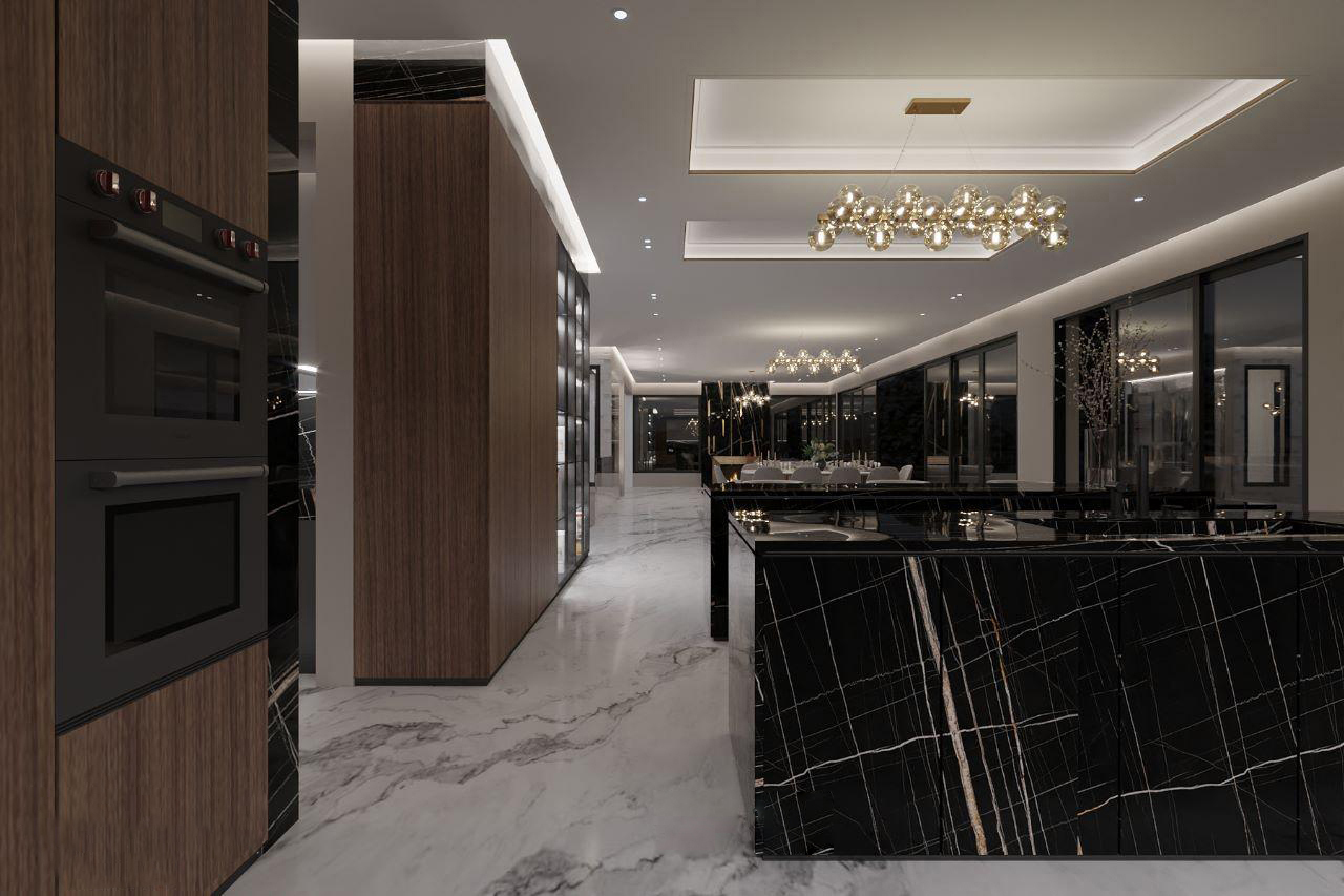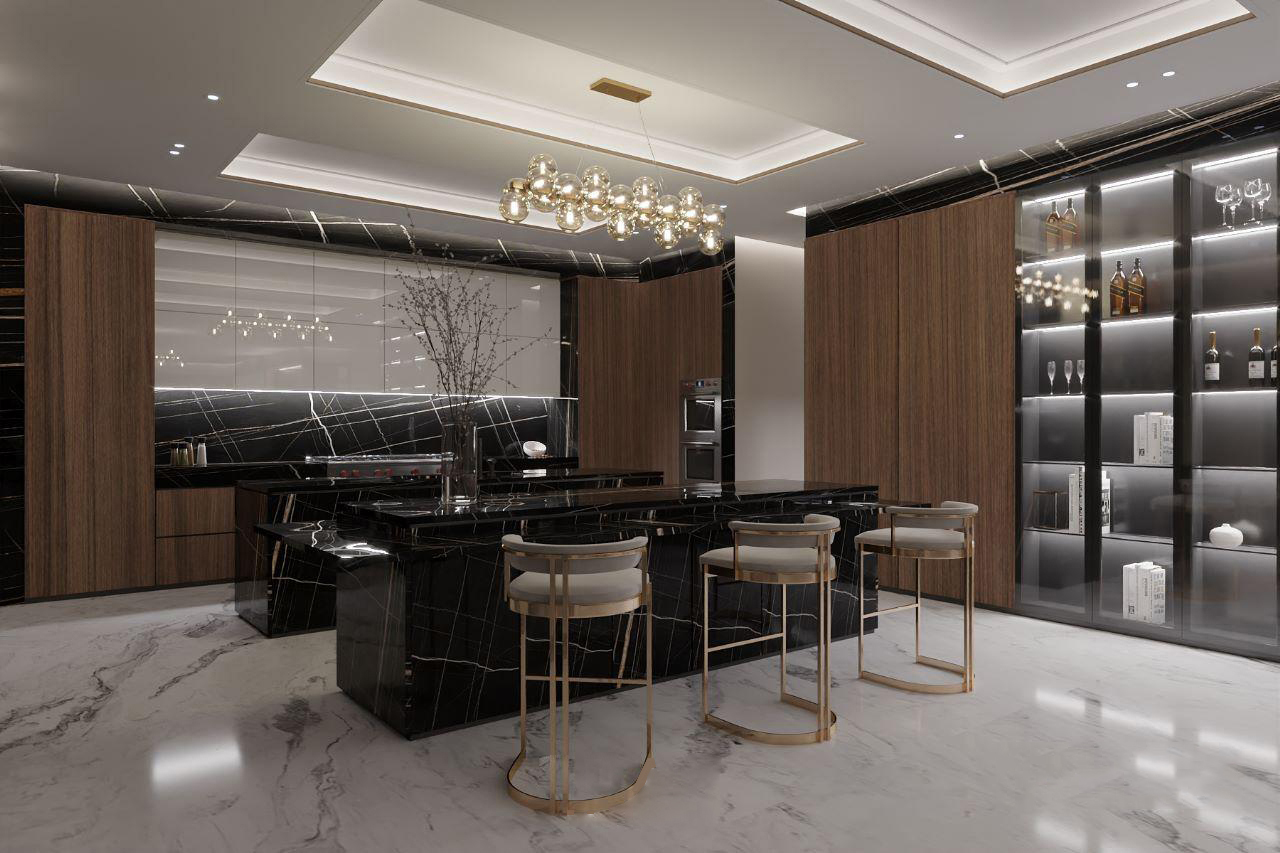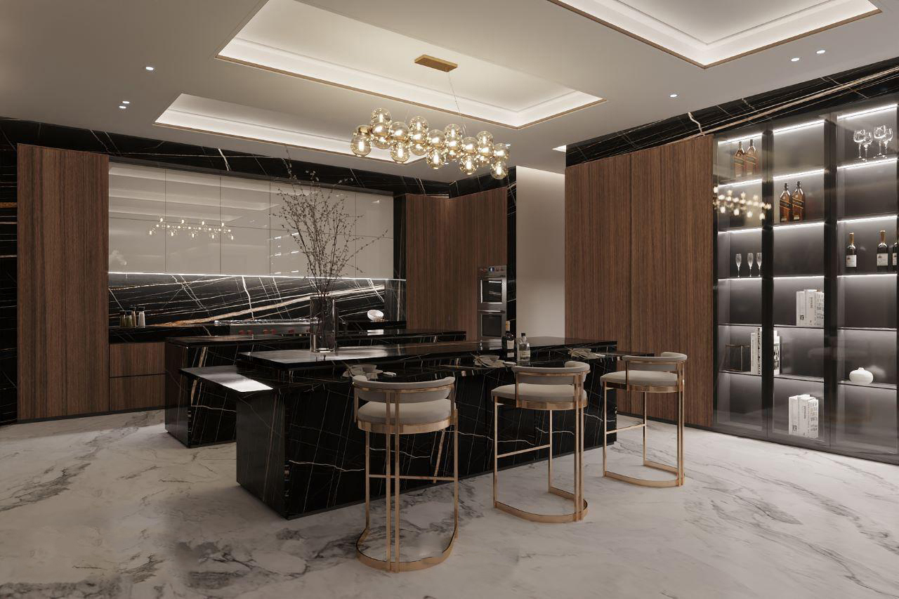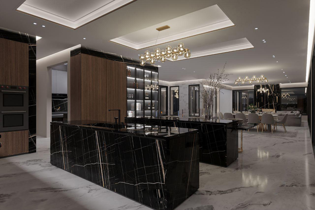This luxurious open-plan kitchen and living area blends sleek wood finishes, black marble accents, and warm lighting to create a contemporary and inviting space. It’s a perfect balance of functionality and style.