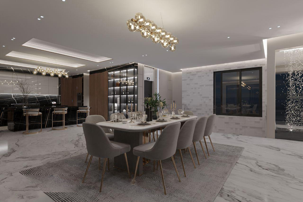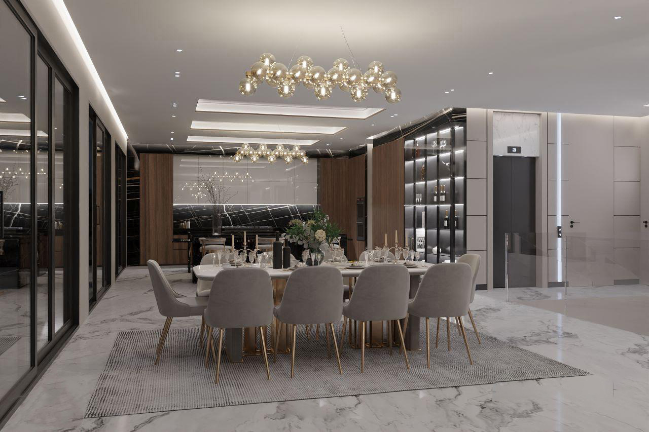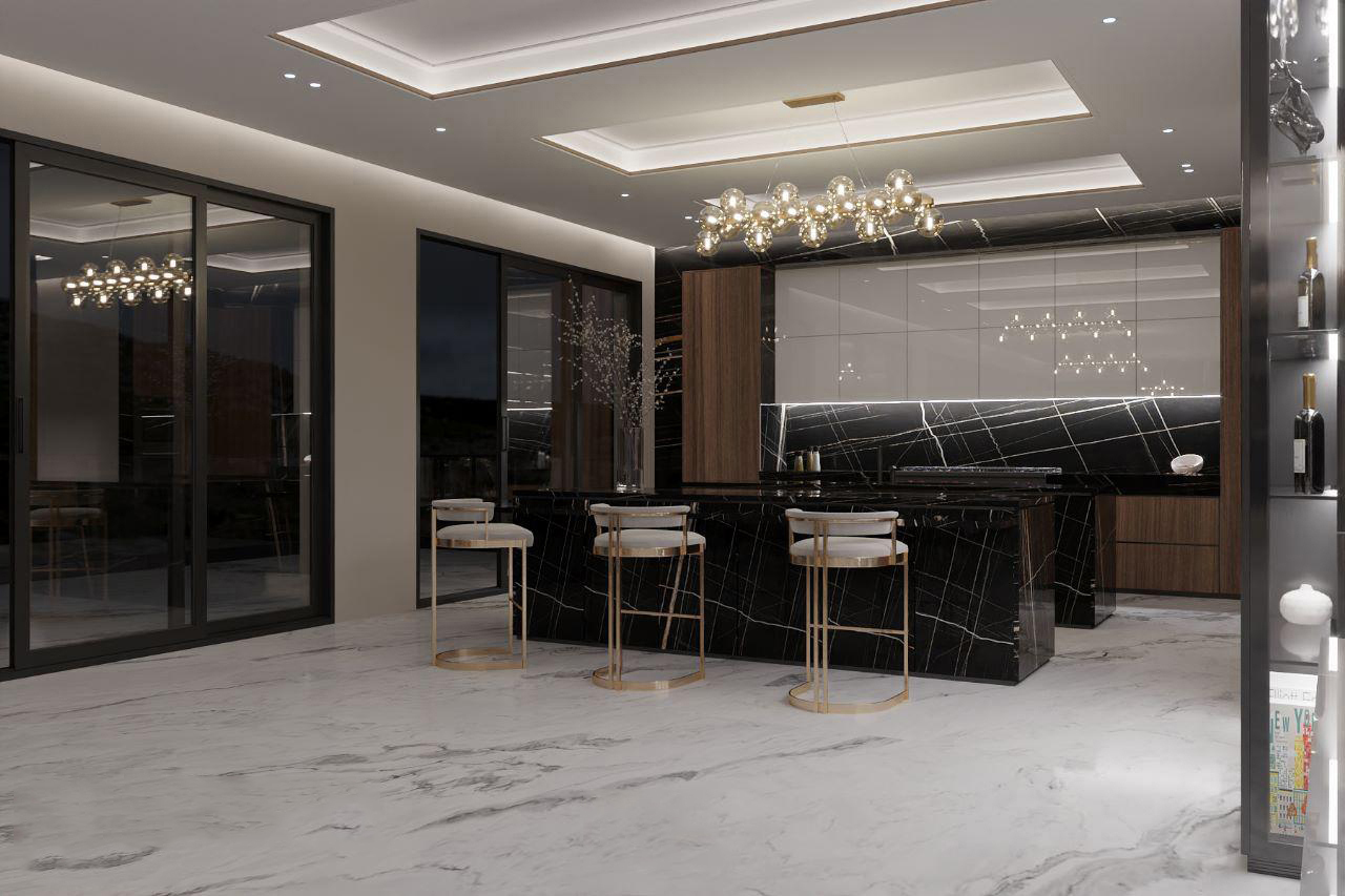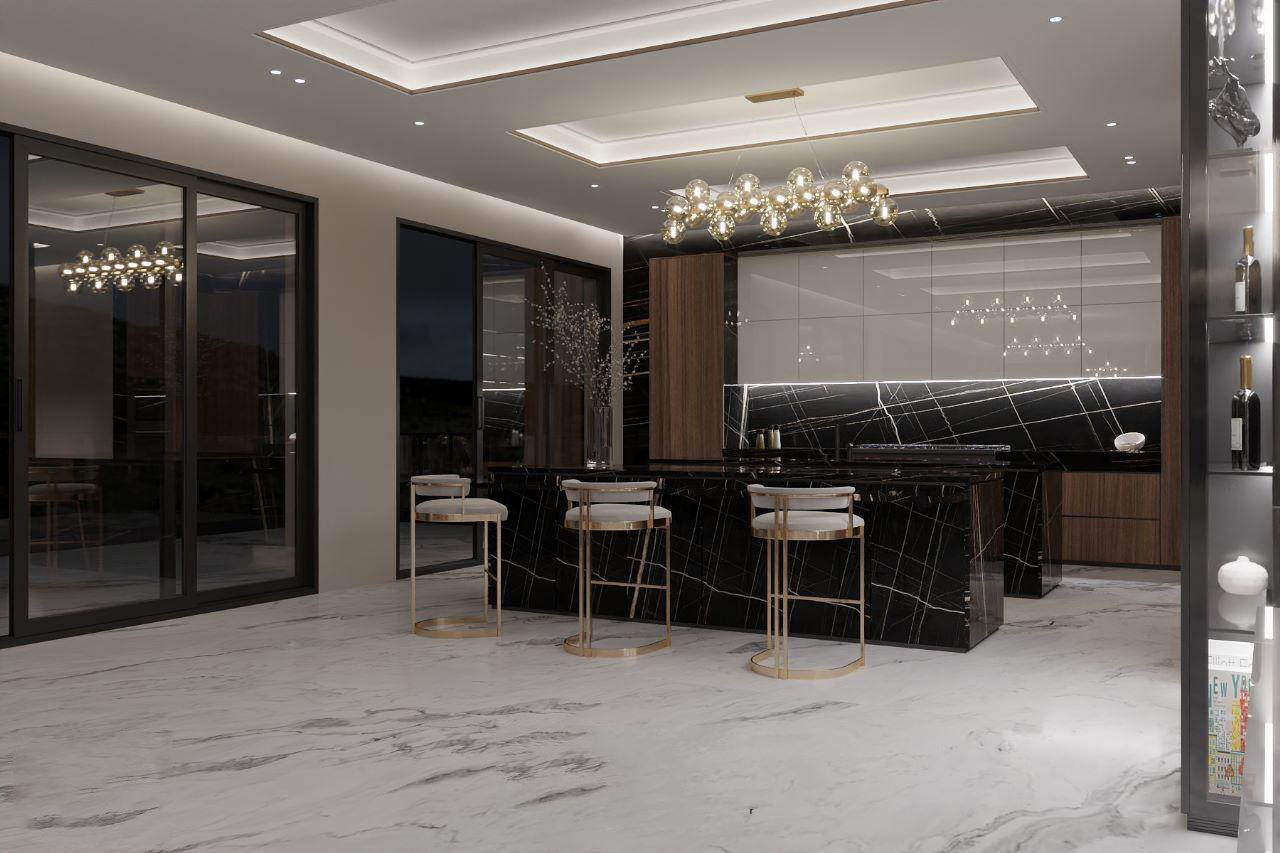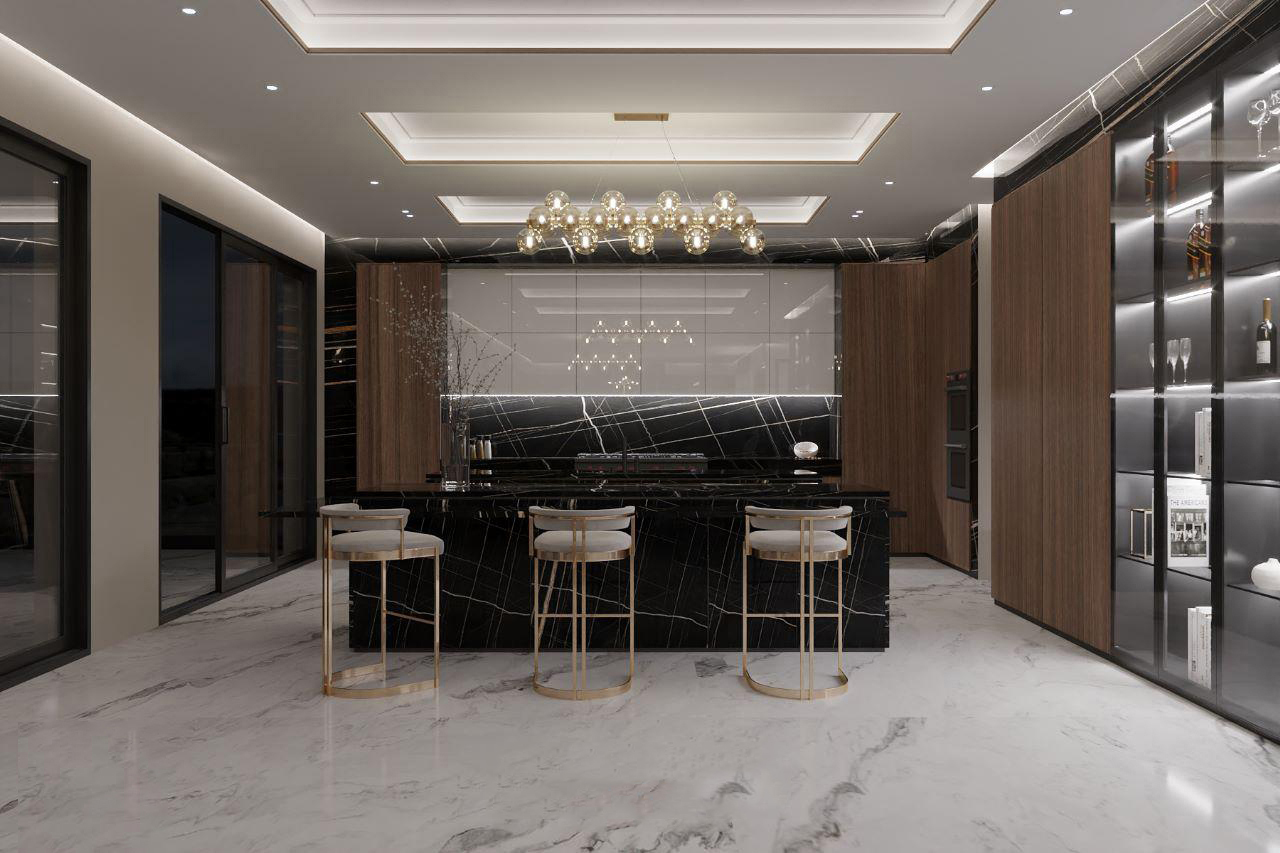 This luxurious open-plan kitchen and living area blends sleek wood finishes, black marble accents, and warm lighting to create a contemporary and inviting space. It’s a perfect balance of functionality and style.