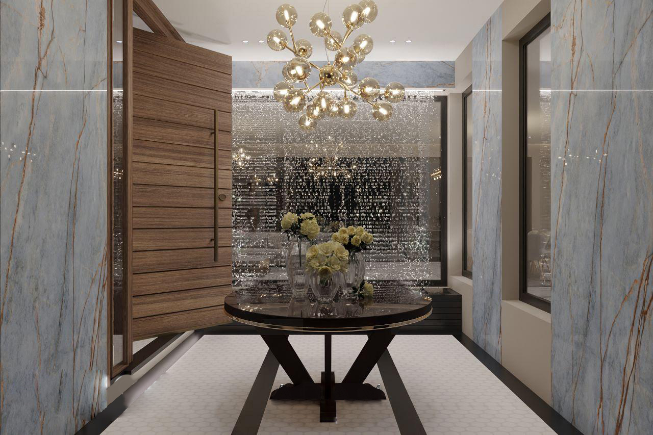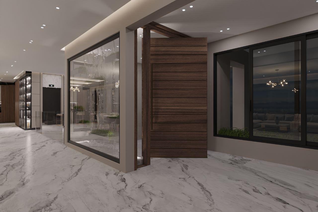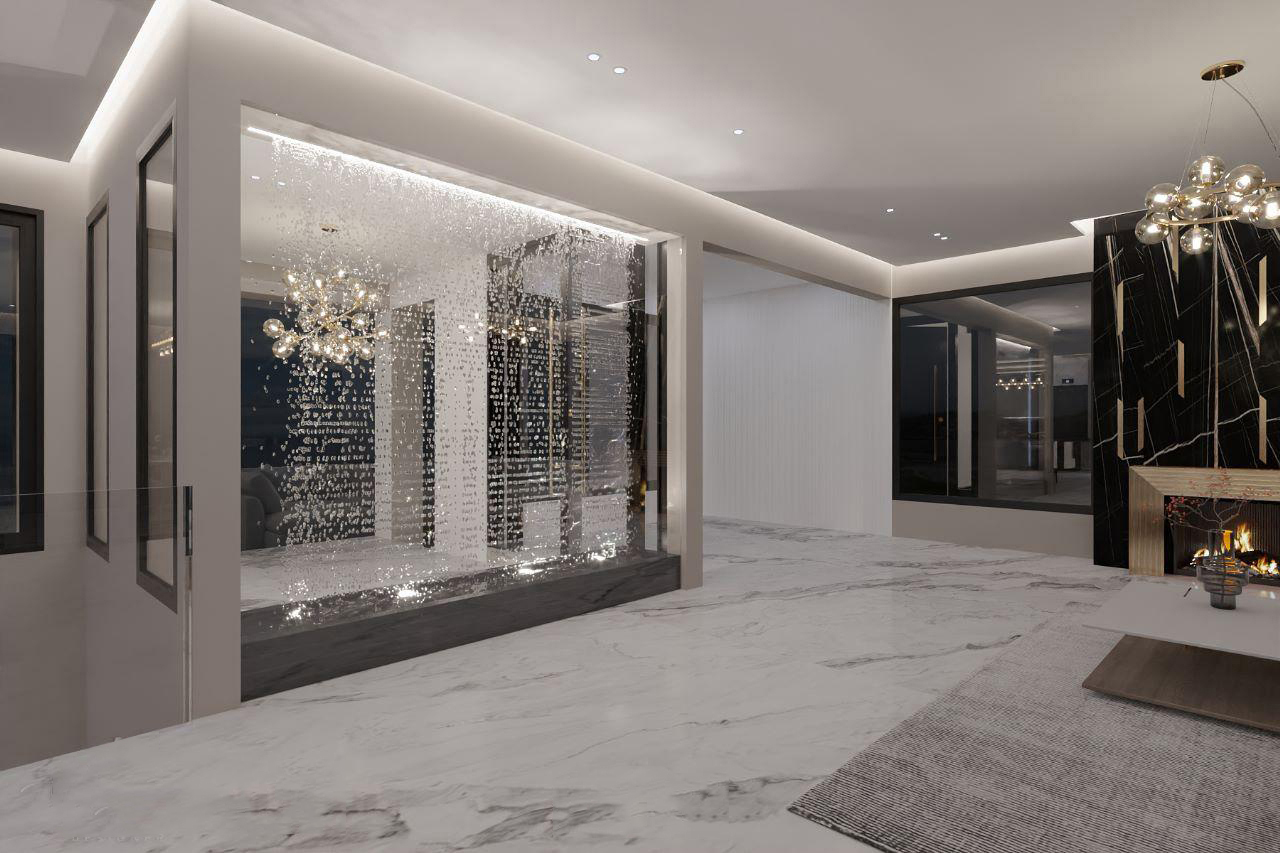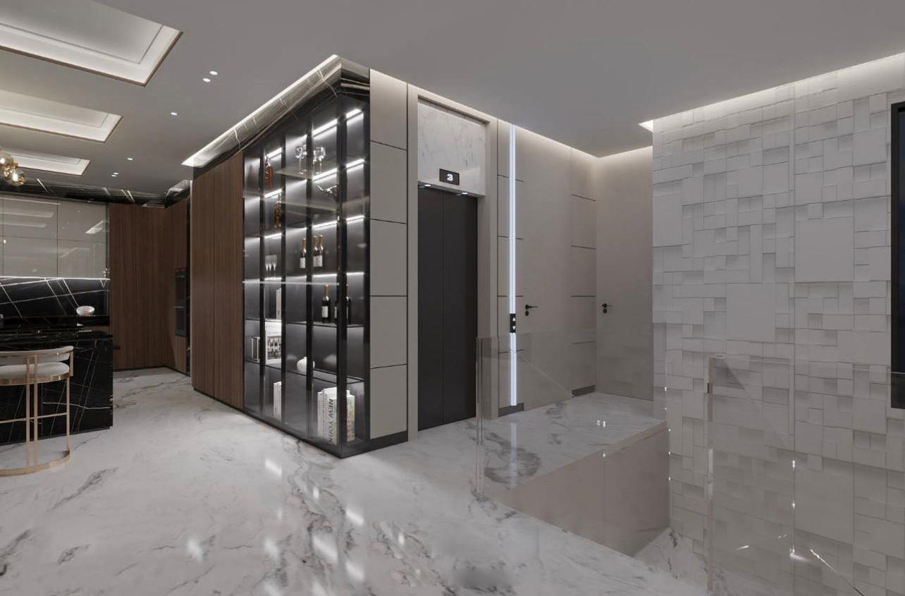 This luxurious open-plan kitchen and living area blends sleek wood finishes, black marble accents, and warm lighting to create a contemporary and inviting space. It’s a perfect balance of functionality and style.