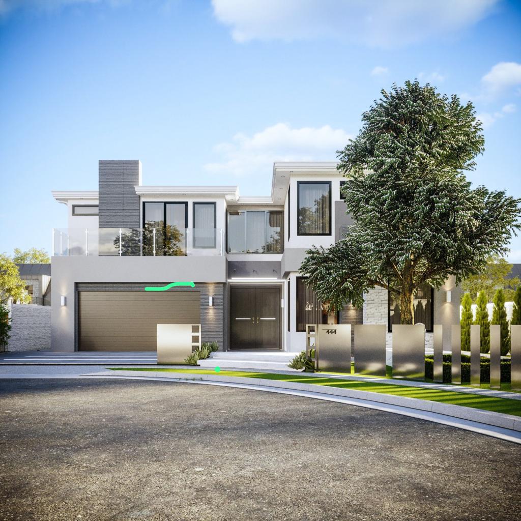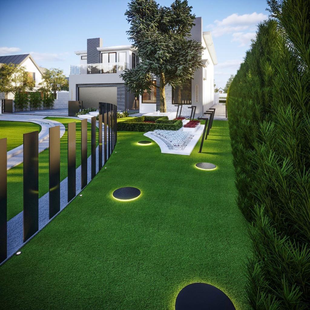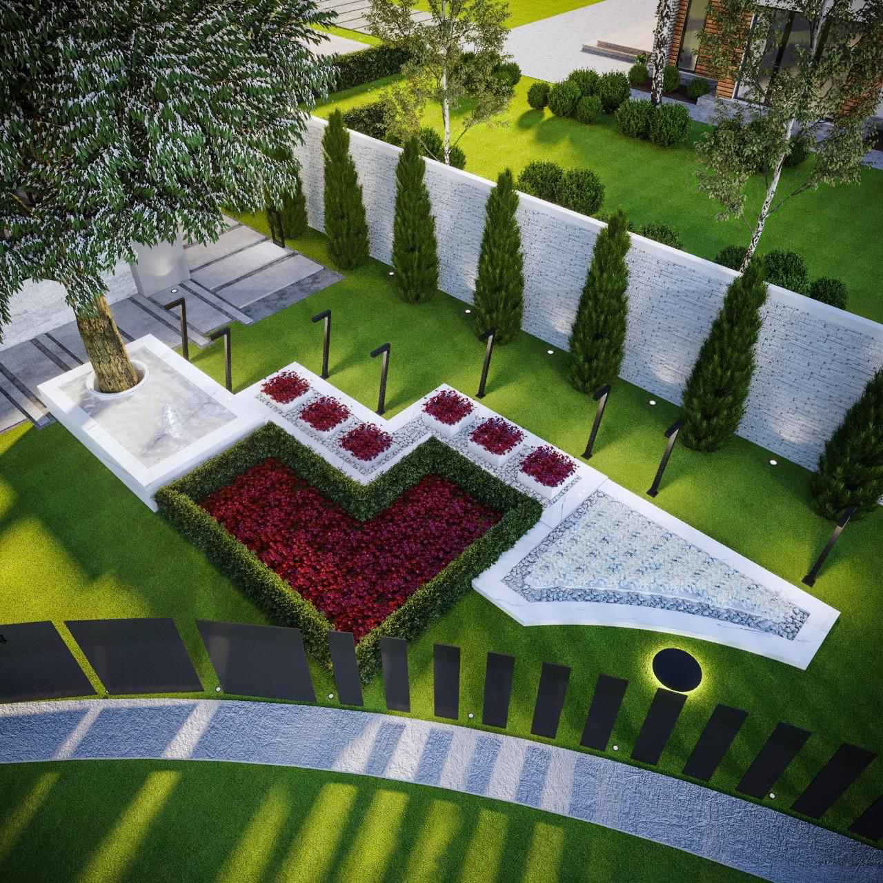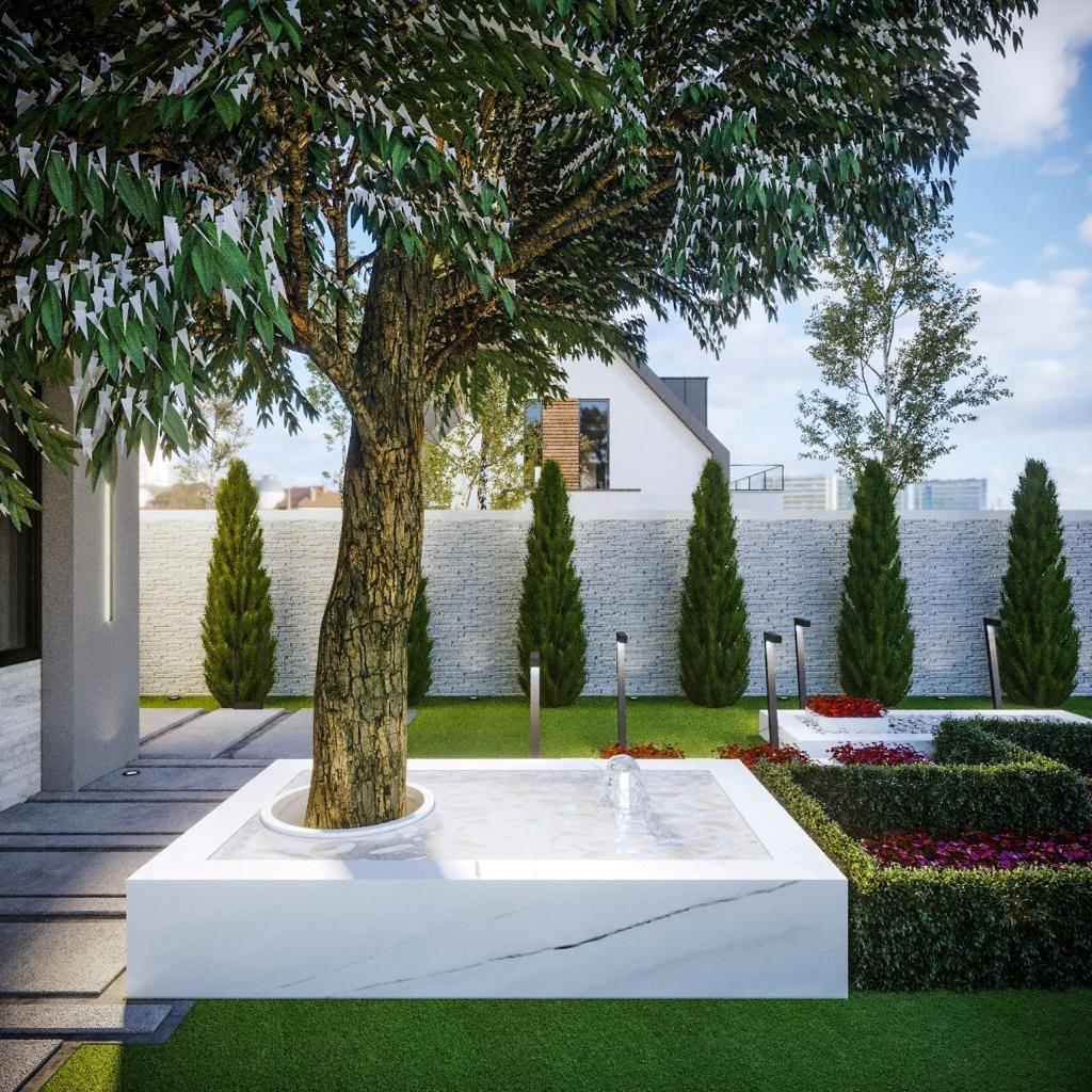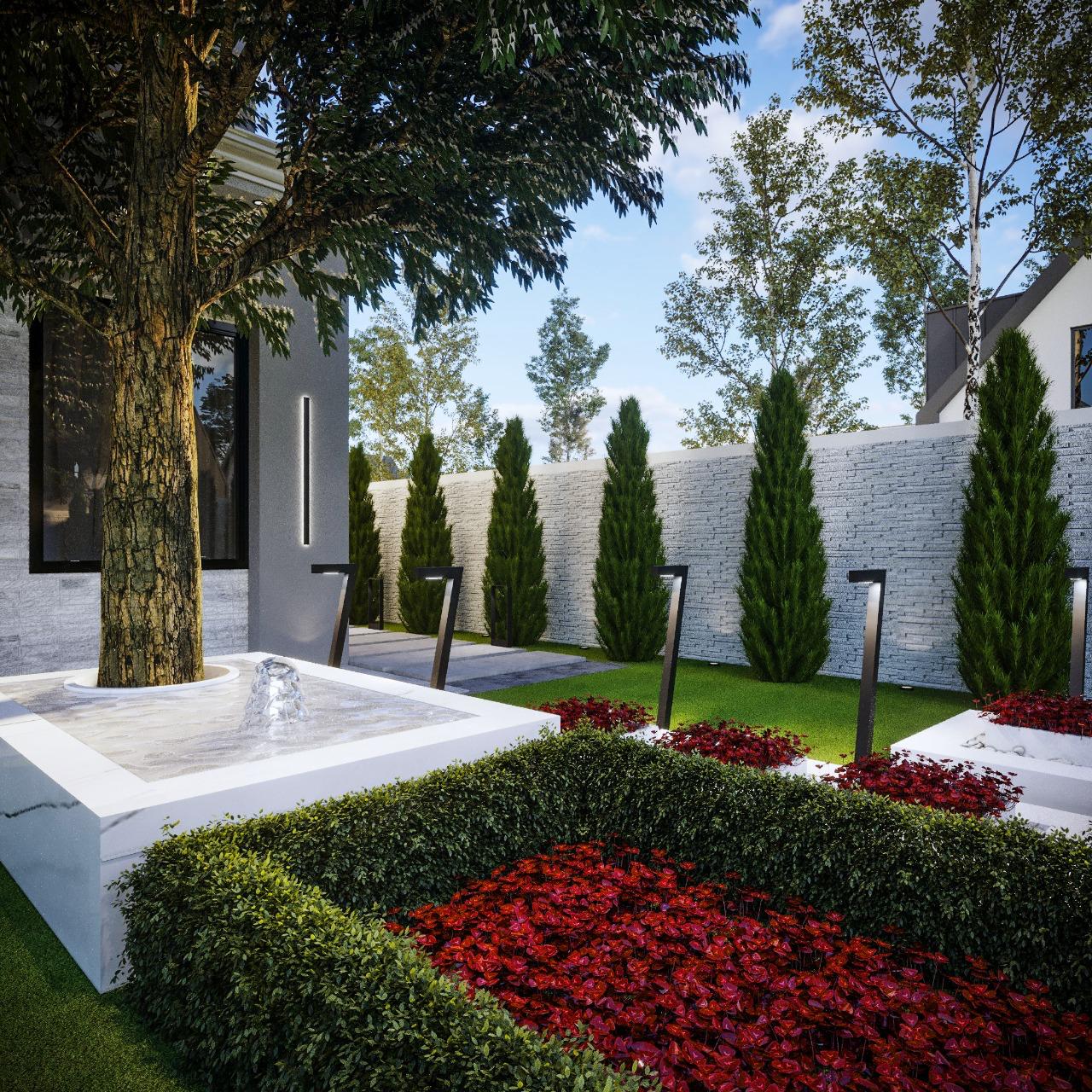 A tranquil garden corner featuring structured hedges, vivid flowers, and a tree emerging from a marble fountain base.A beautifully crafted contemporary home entrance that blends architecture and landscaping with elegant precision.