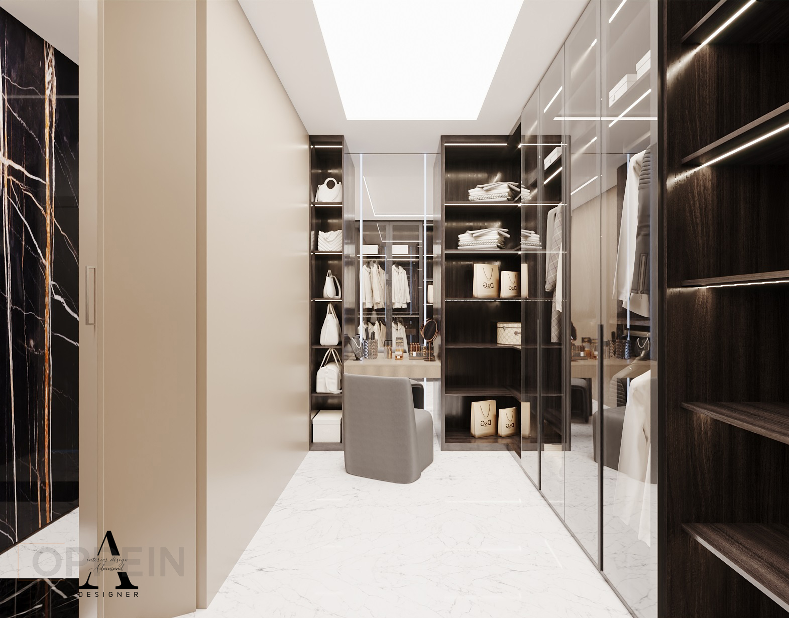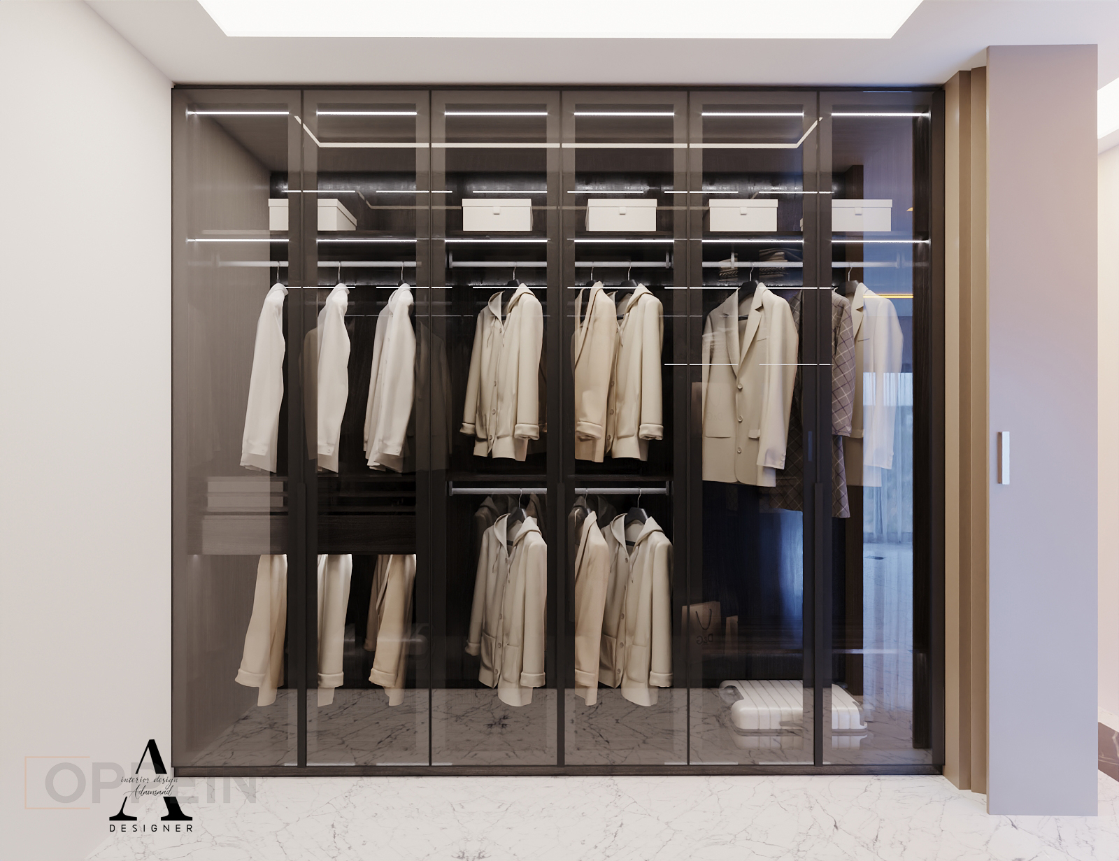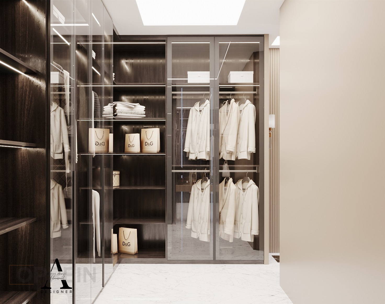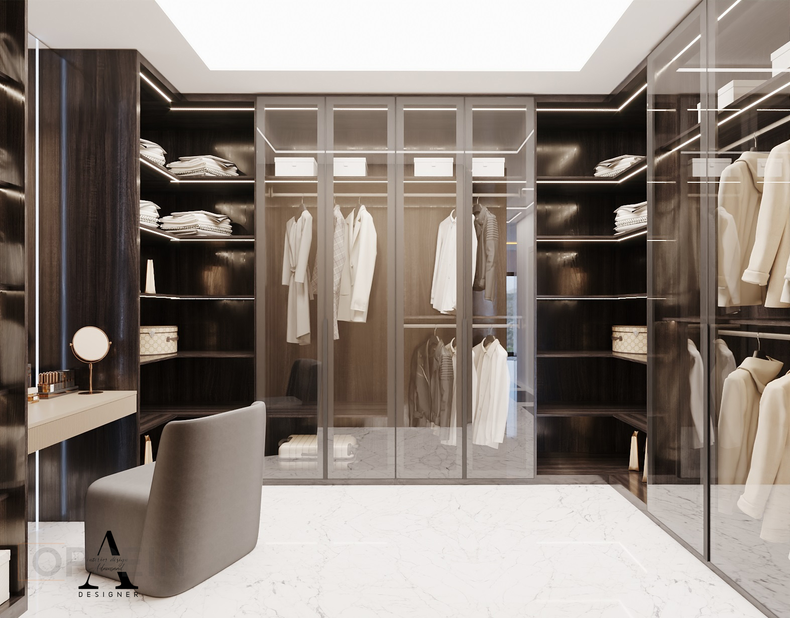 A sleek, high-end wardrobe design that blends glass, lighting, and dark wood to create a luxurious walk-in closet experience. The space is organized with precision, offering both function and finesse.