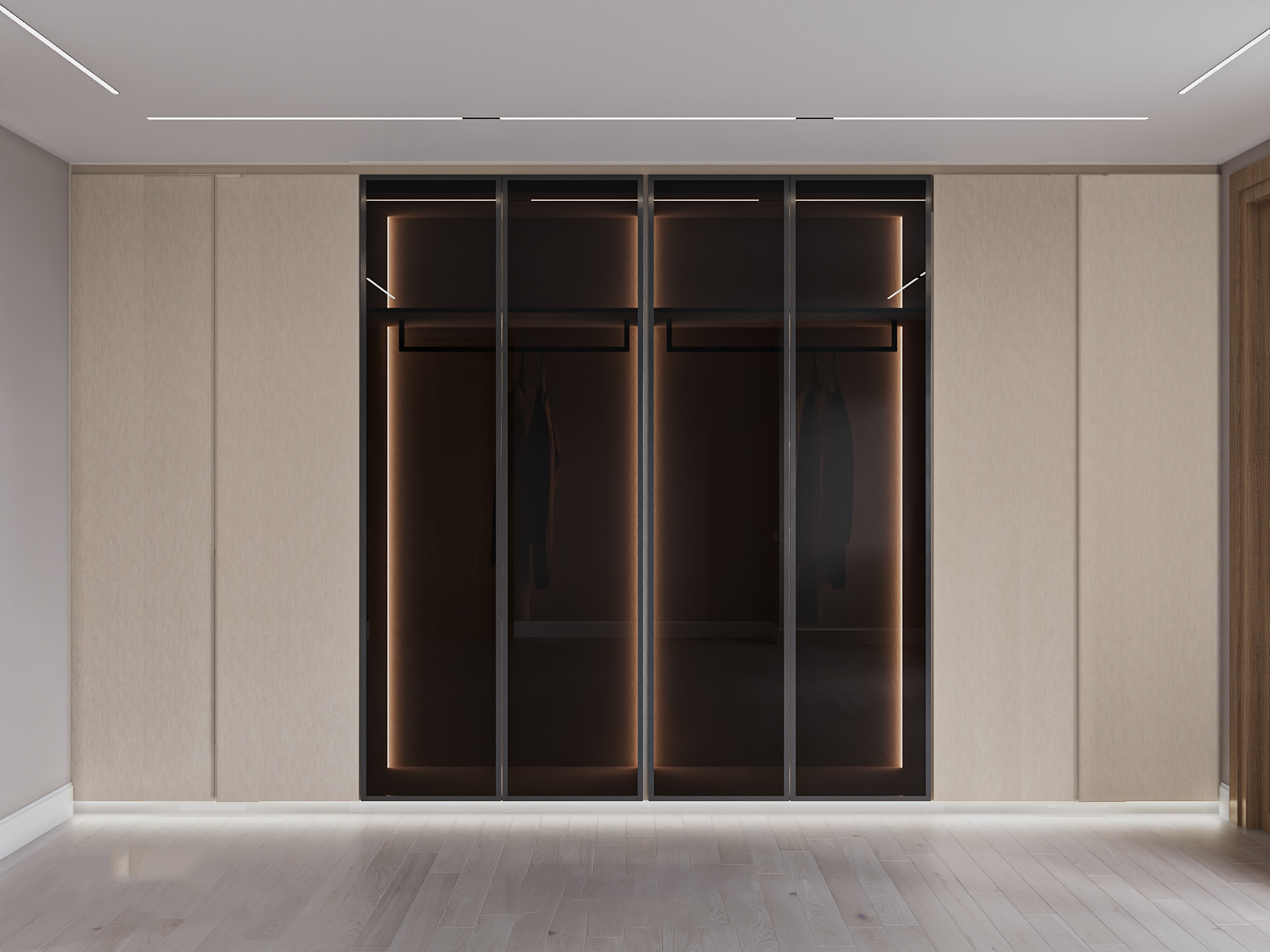 This sleek wardrobe combines dark-tinted glass doors with warm ambient lighting, creating a luxurious and contemporary storage solution. The light beige framing blends seamlessly with the room for a sophisticated look.