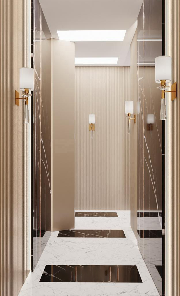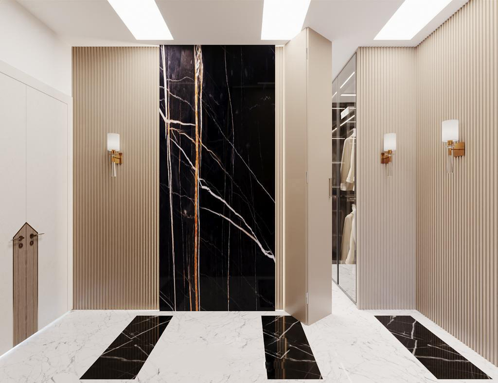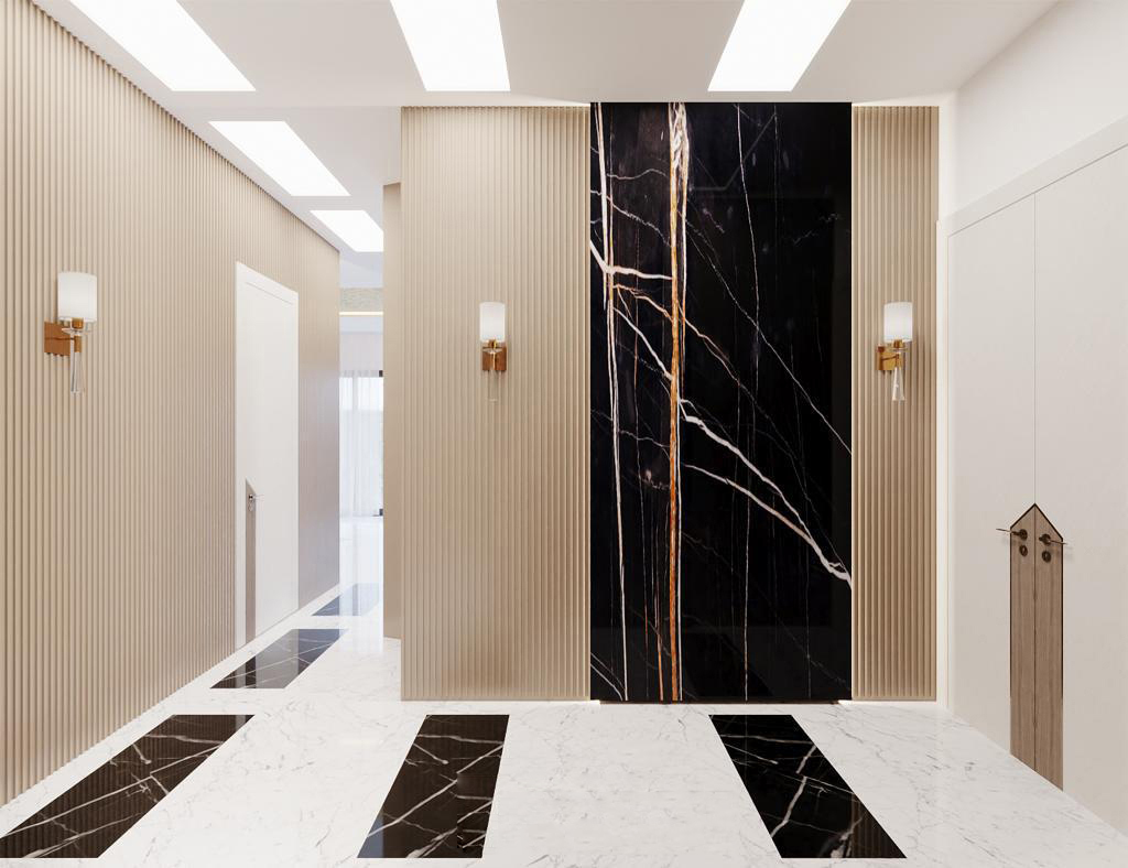 This hallway design exudes sophistication with its striking contrast of black marble and creamy textured panels. Warm lighting and minimal decor enhance the spacious and upscale feel.