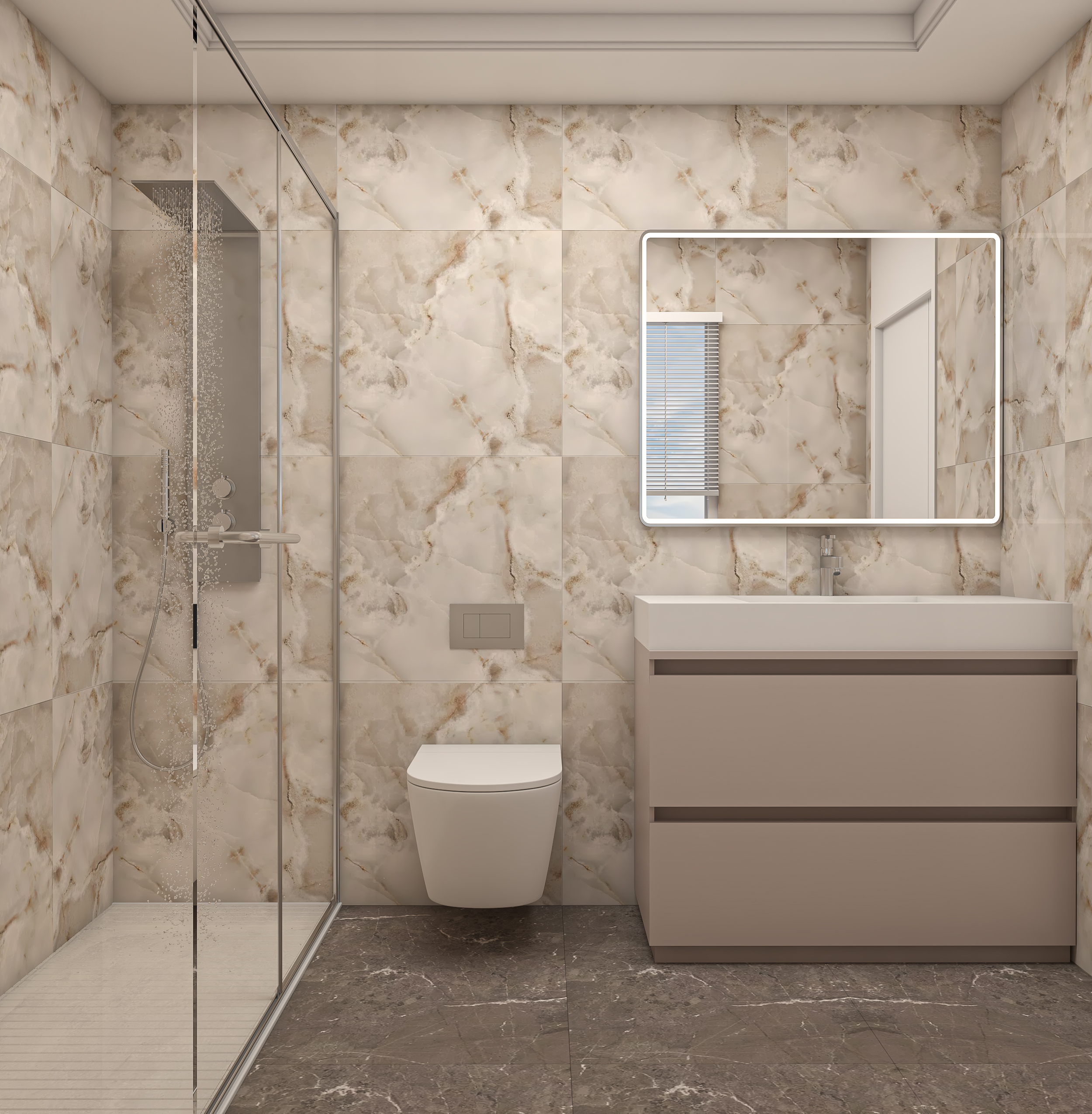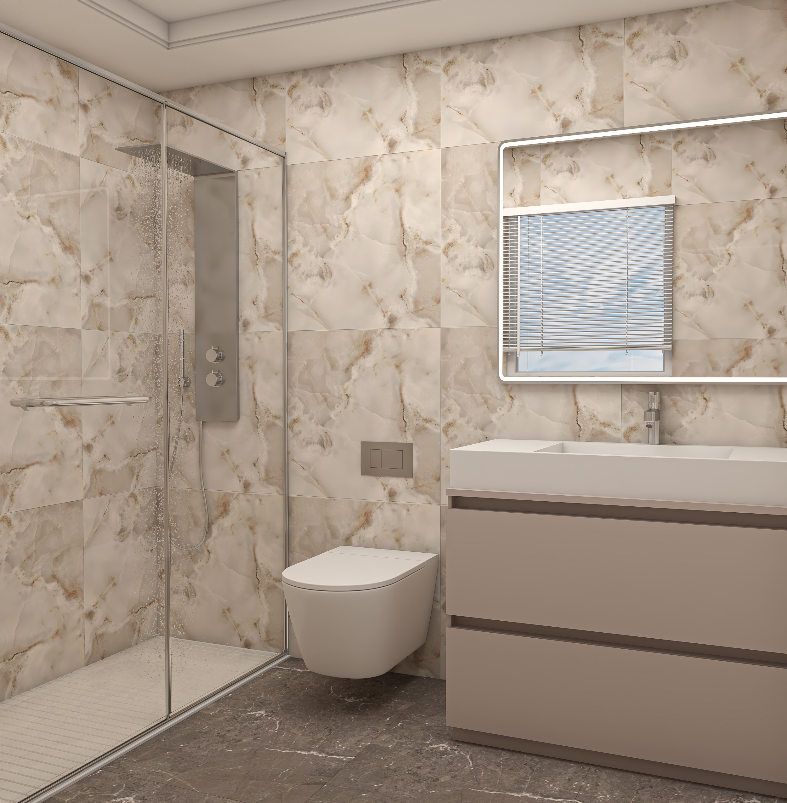This elegant bathroom design blends neutral beige tones with bold stone textures to create a luxurious spa-like atmosphere. Perfectly balanced lighting, dual sinks, and high-end materials make this space a statement in comfort and modern style.