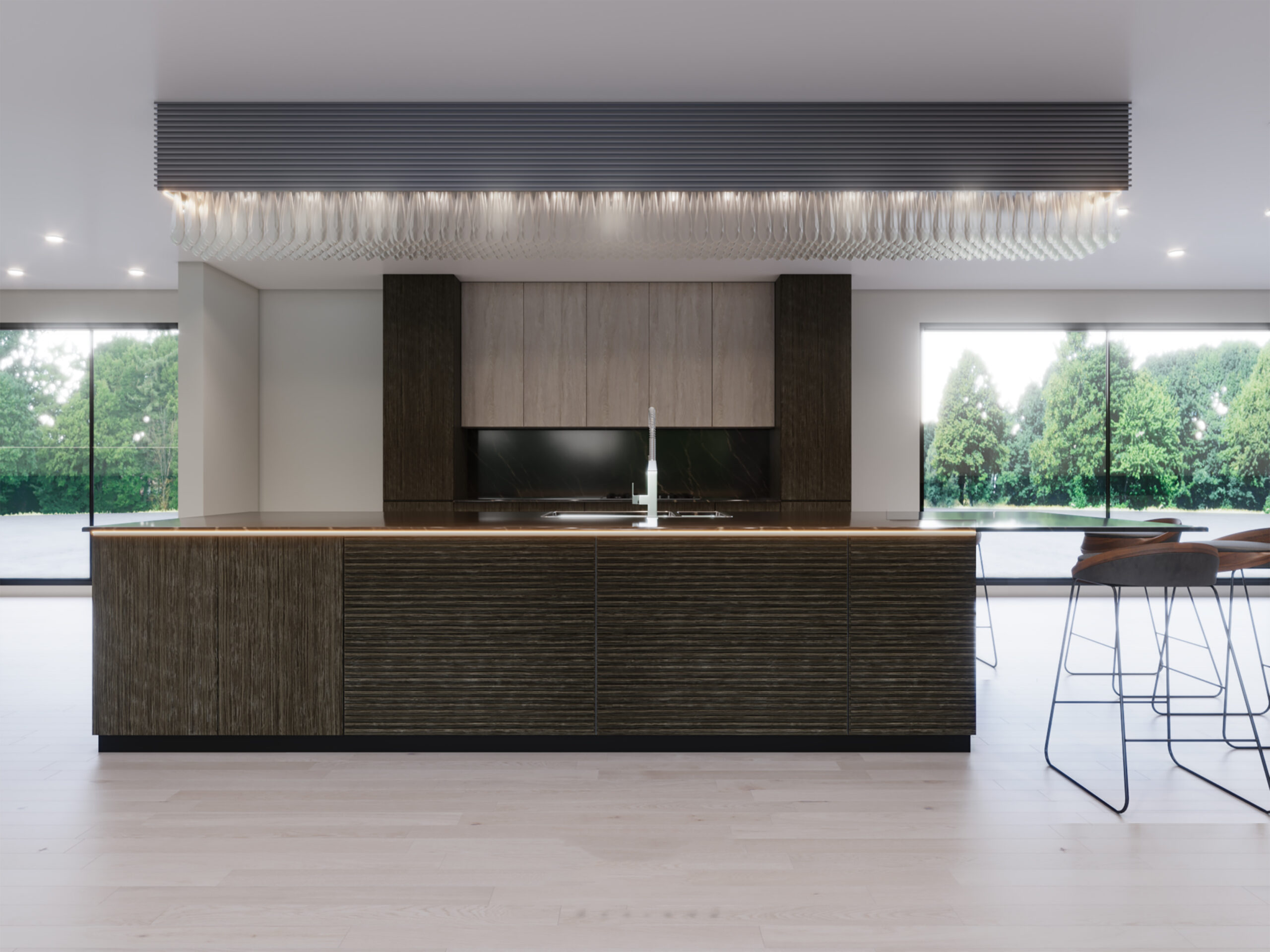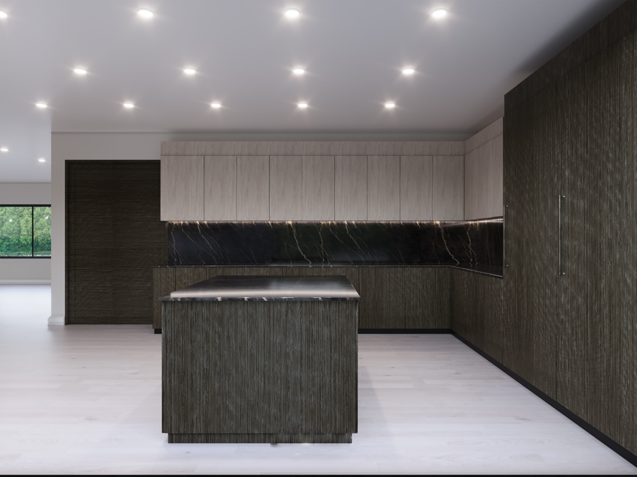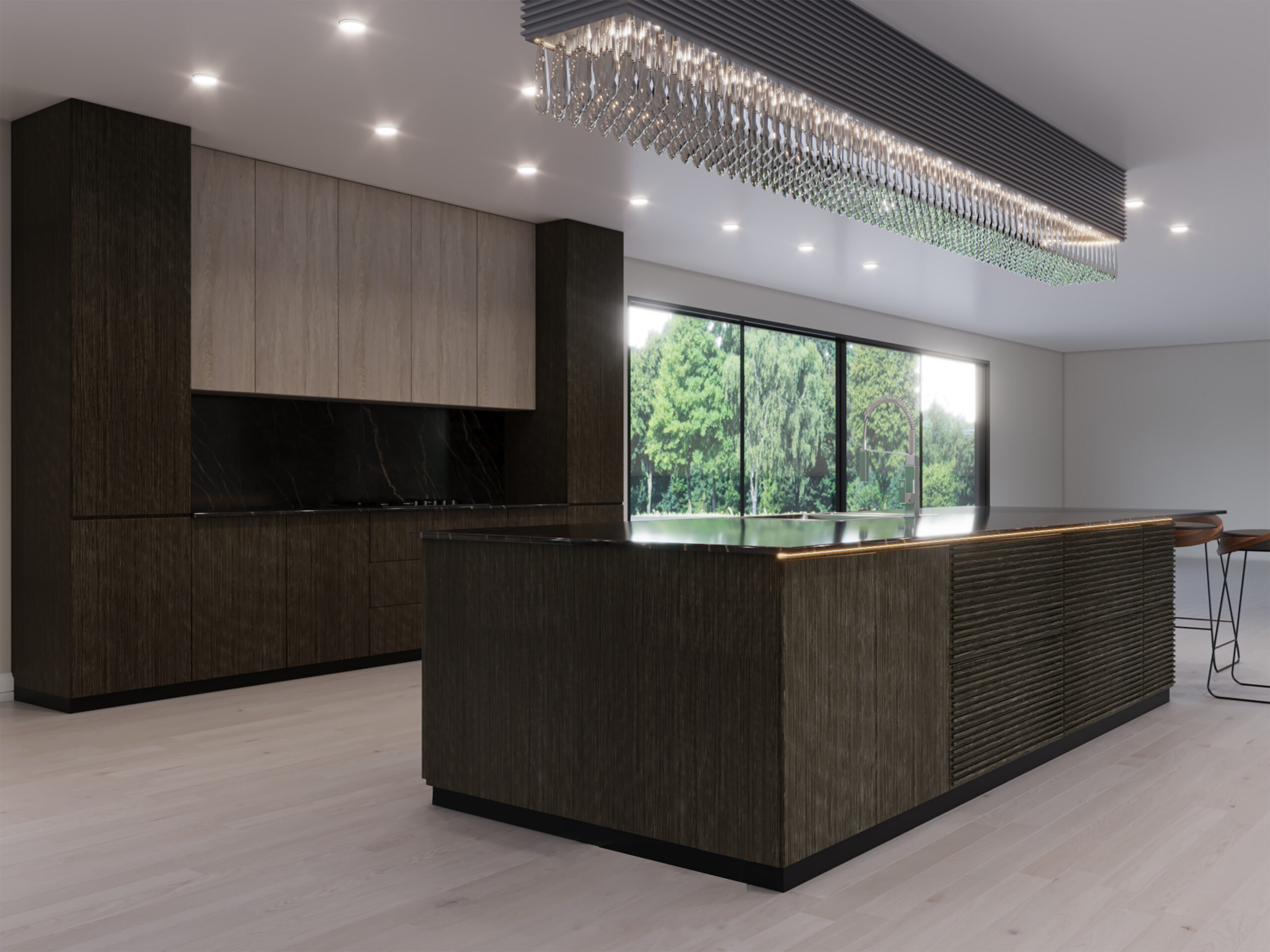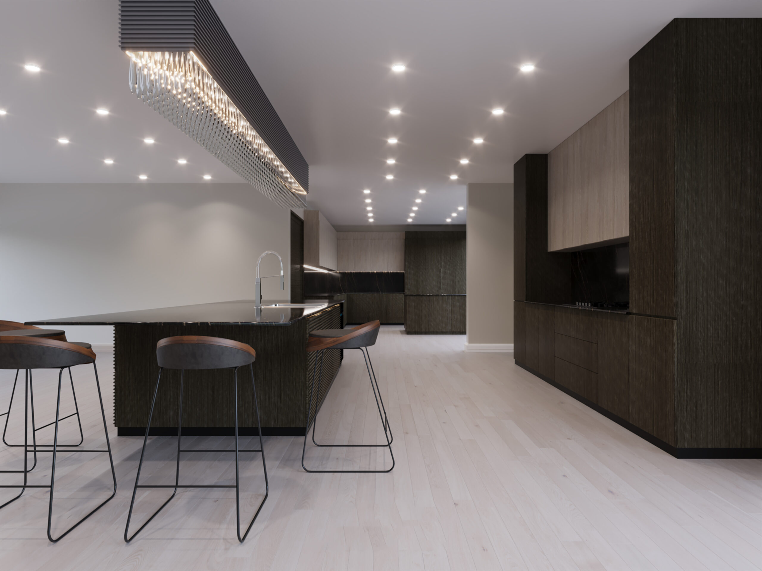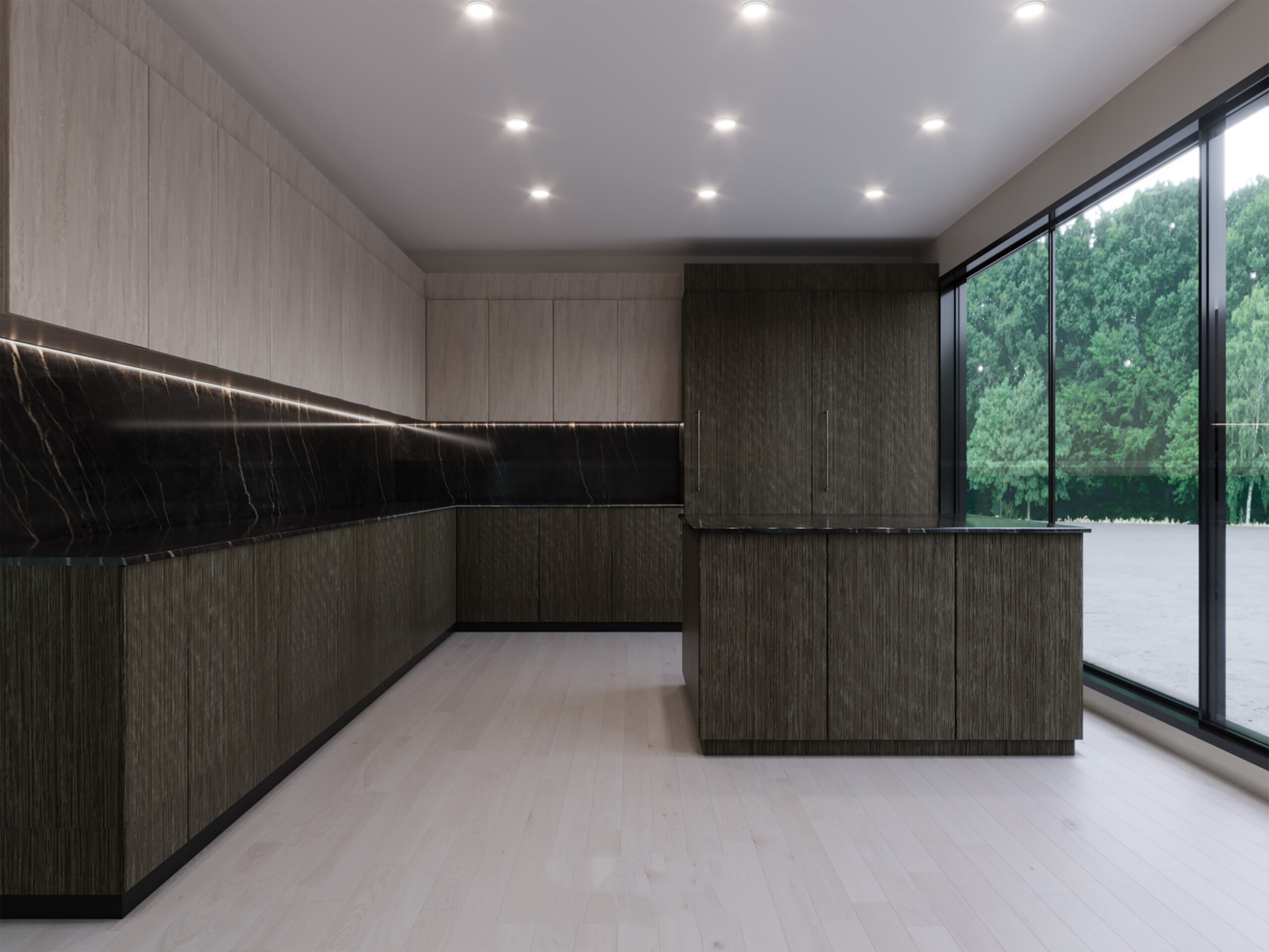 A contemporary kitchen featuring dark wood cabinetry, black marble accents, and minimalist design, complemented by large windows and high-end lighting fixtures. The space blends style and function for a refined cooking and dining experience.
