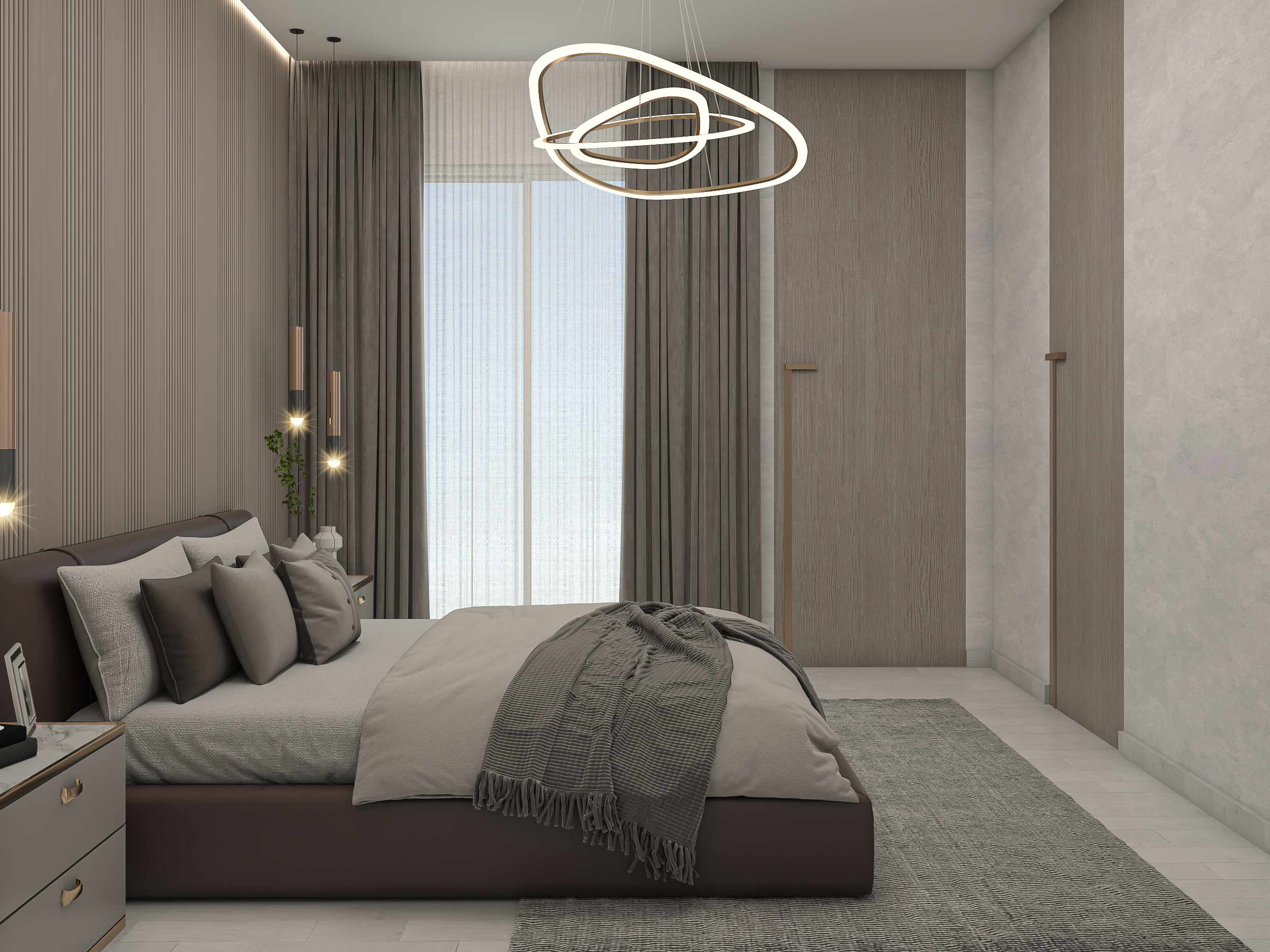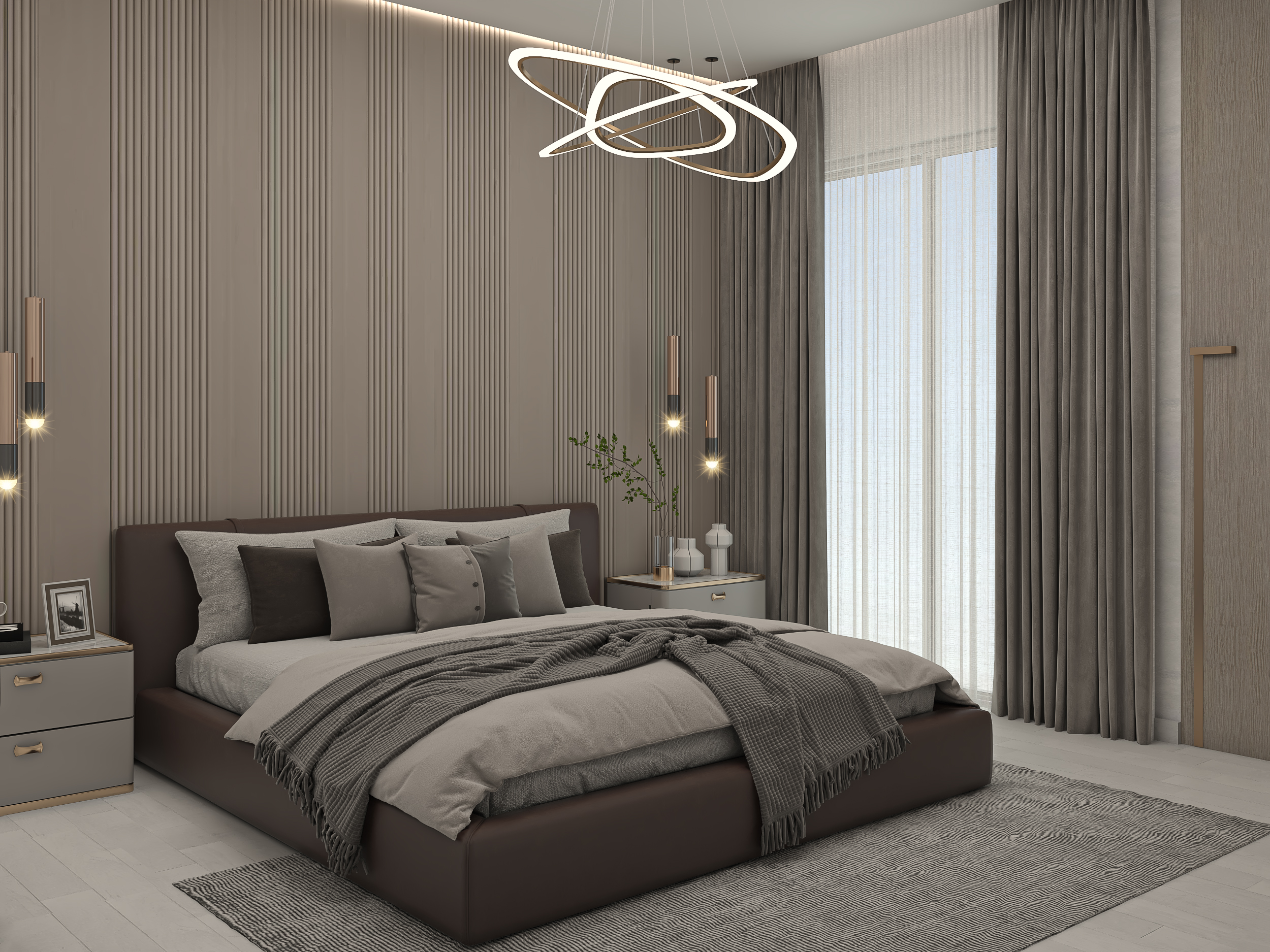 A sleek and serene bedroom design that blends warm neutrals with clean lines for a calming retreat. The space exudes sophistication through subtle textures, layered lighting, and harmonious color tones.