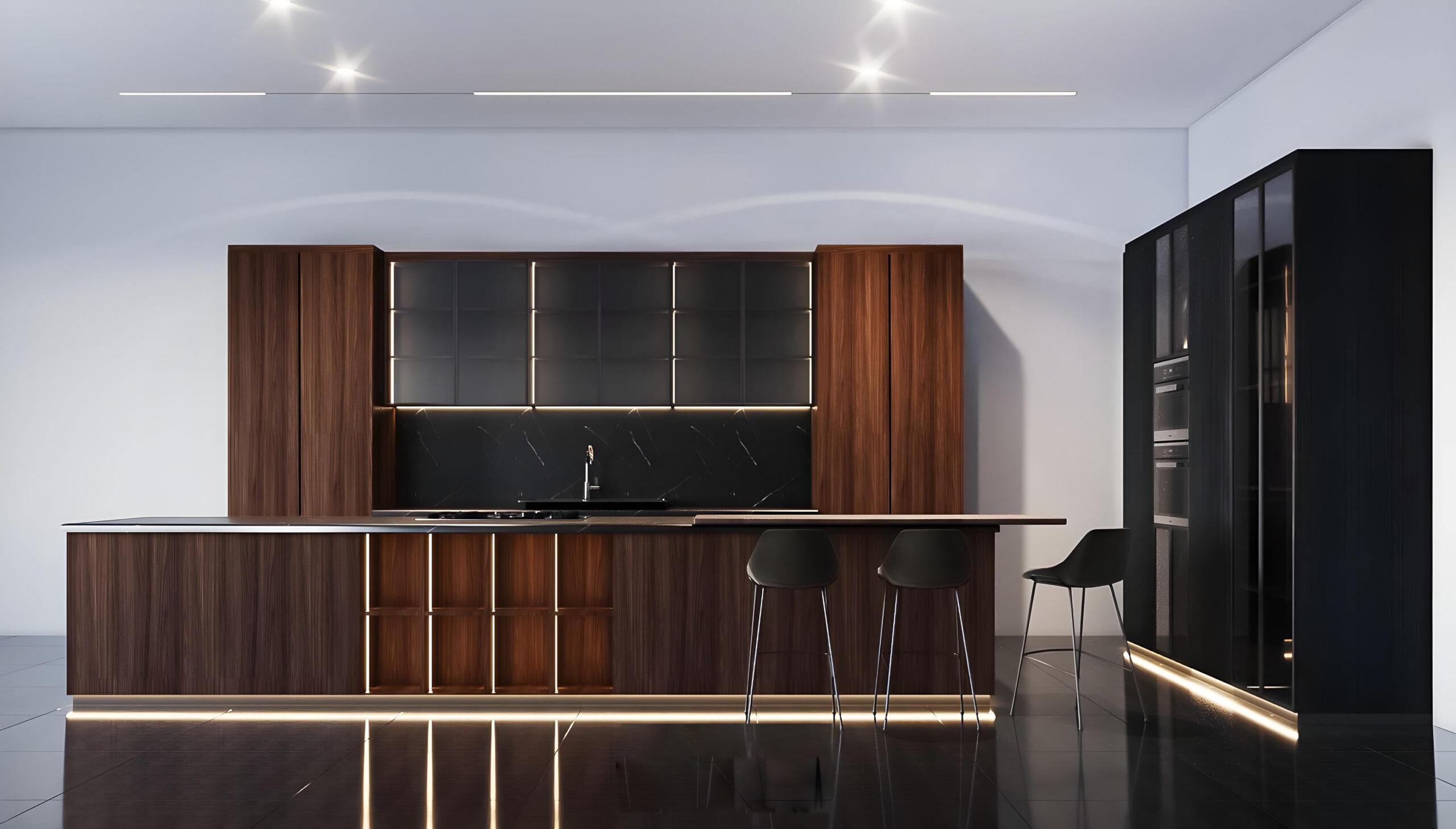 This modular kitchen blends contemporary aesthetics with functional elegance. The walnut wood finish, black accents, and ambient lighting create a stylish and sophisticated cooking space.