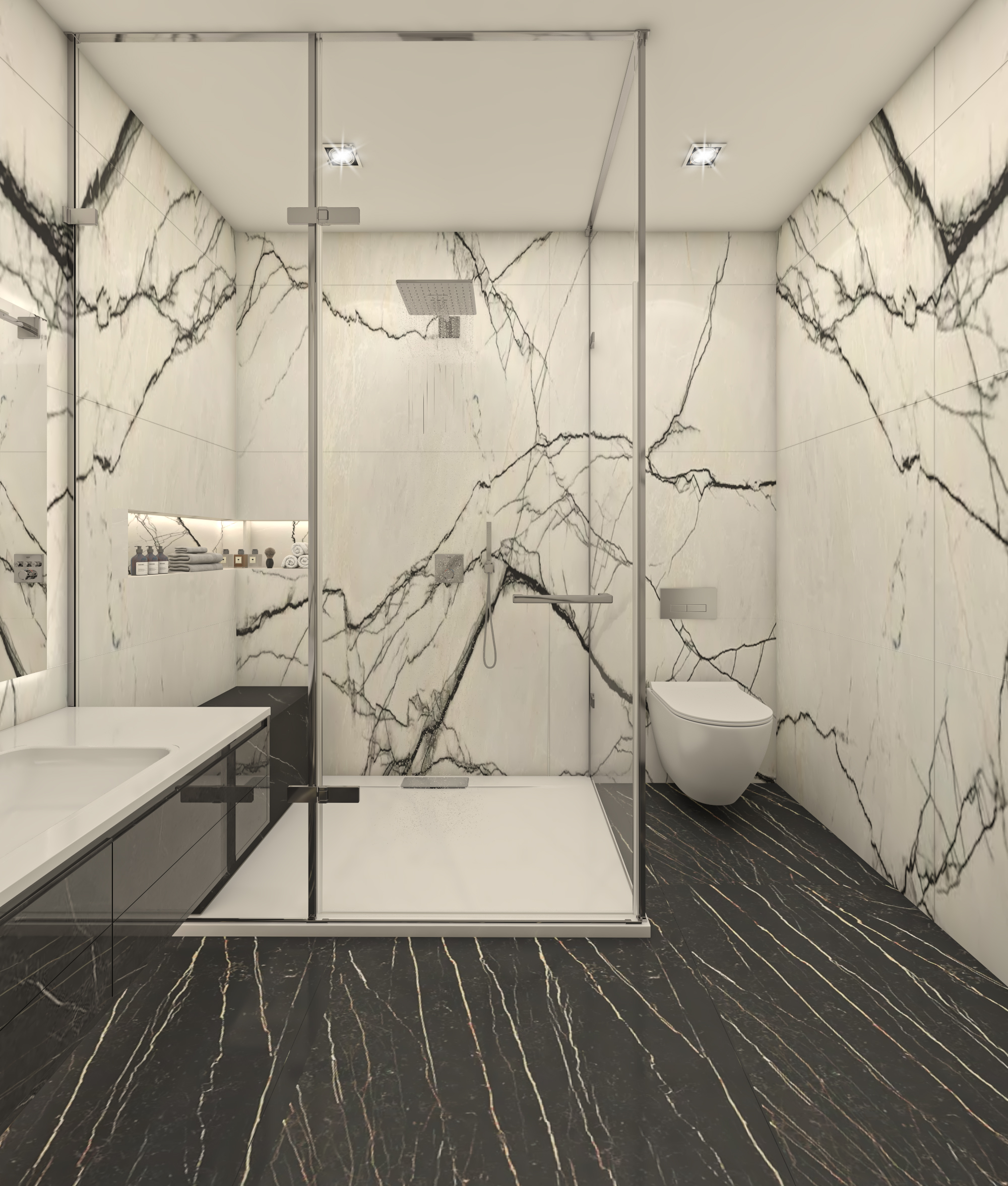 - The high-contrast black veining over white marble walls adds visual drama and timeless elegance.