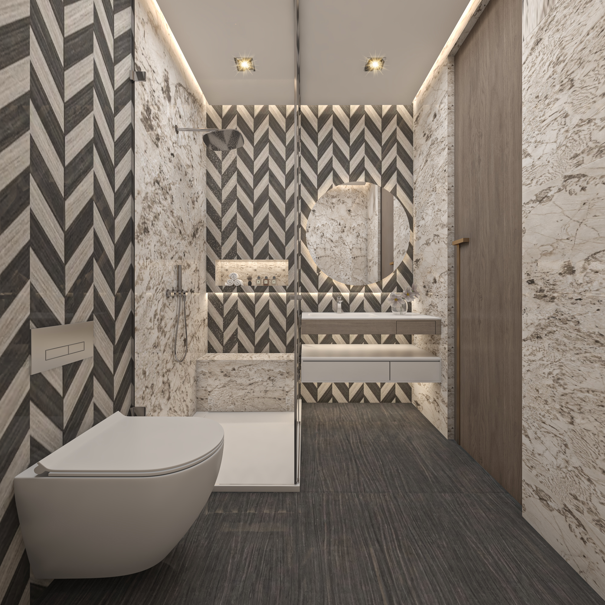 A bold interplay of chevron patterns and textured marble creates a dramatic, high-end bathing space. Balanced lighting and clean lines enhance the modern look.