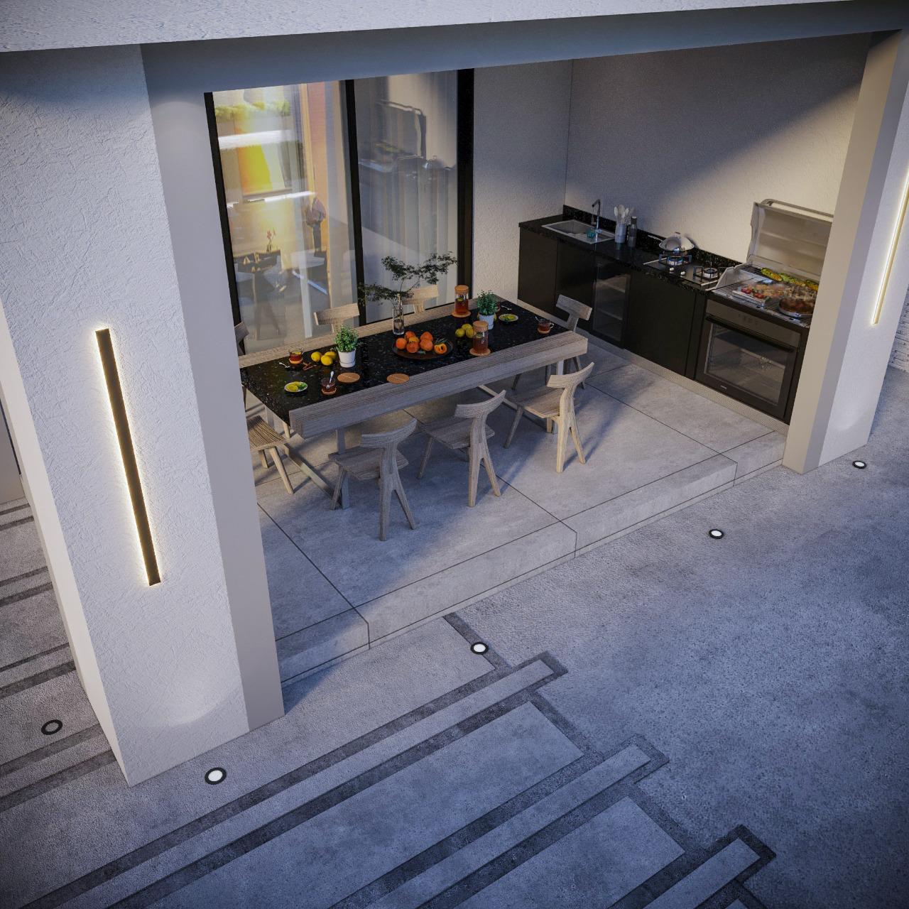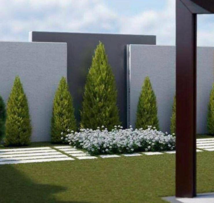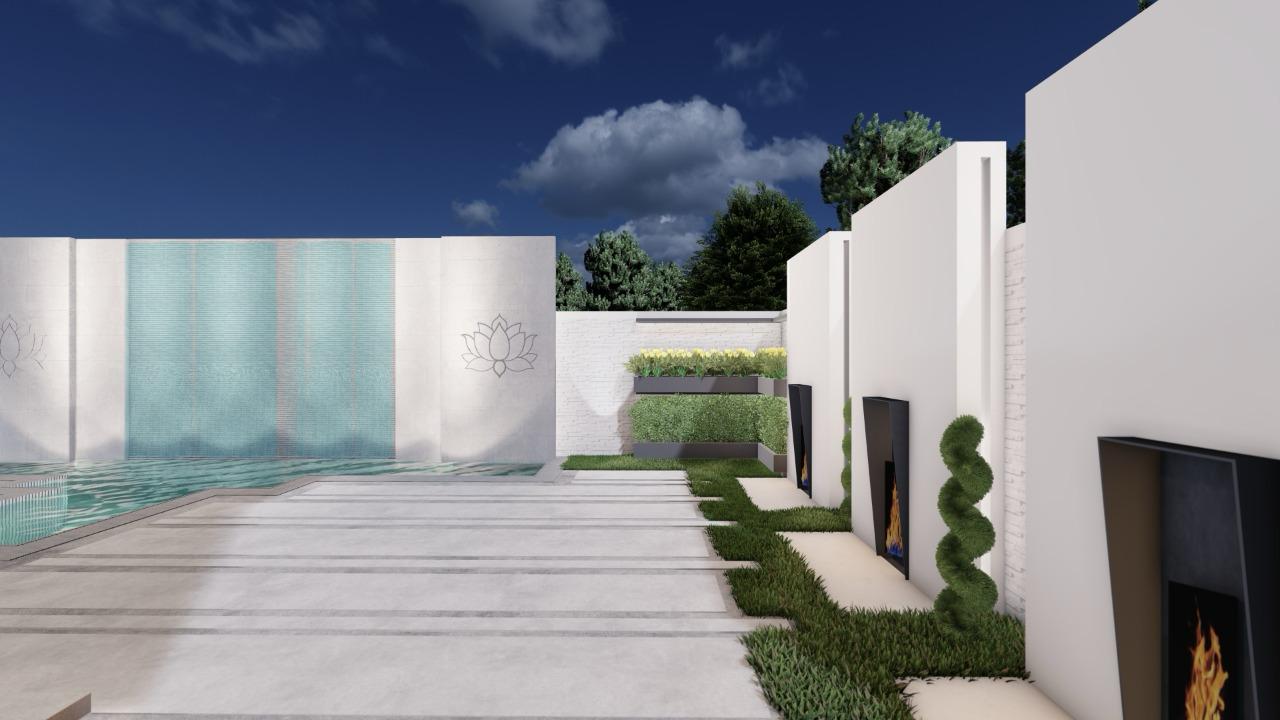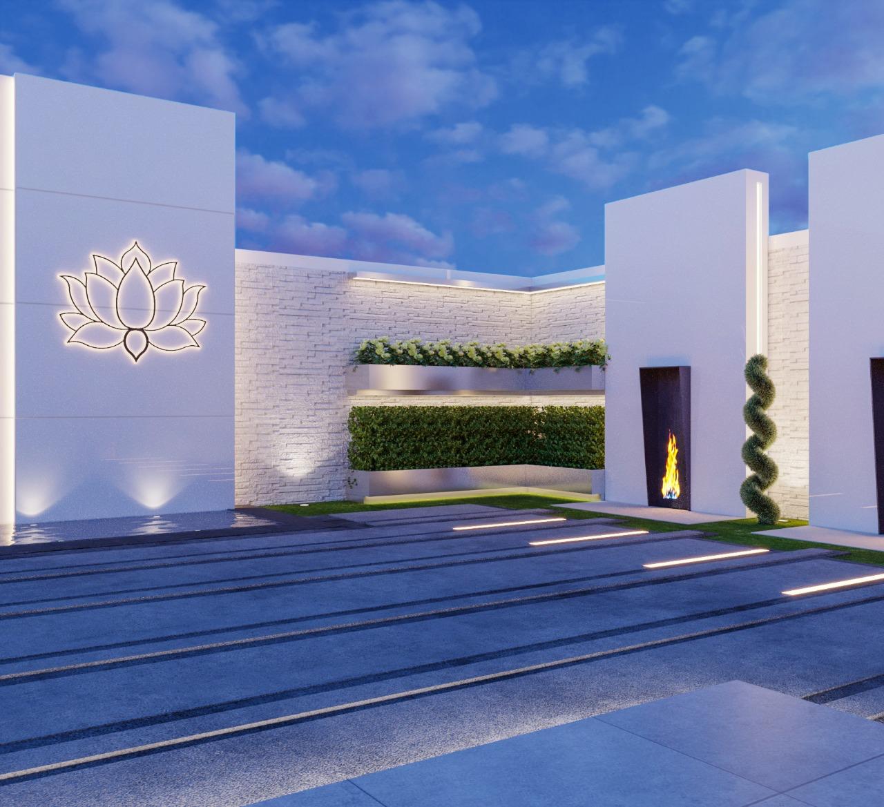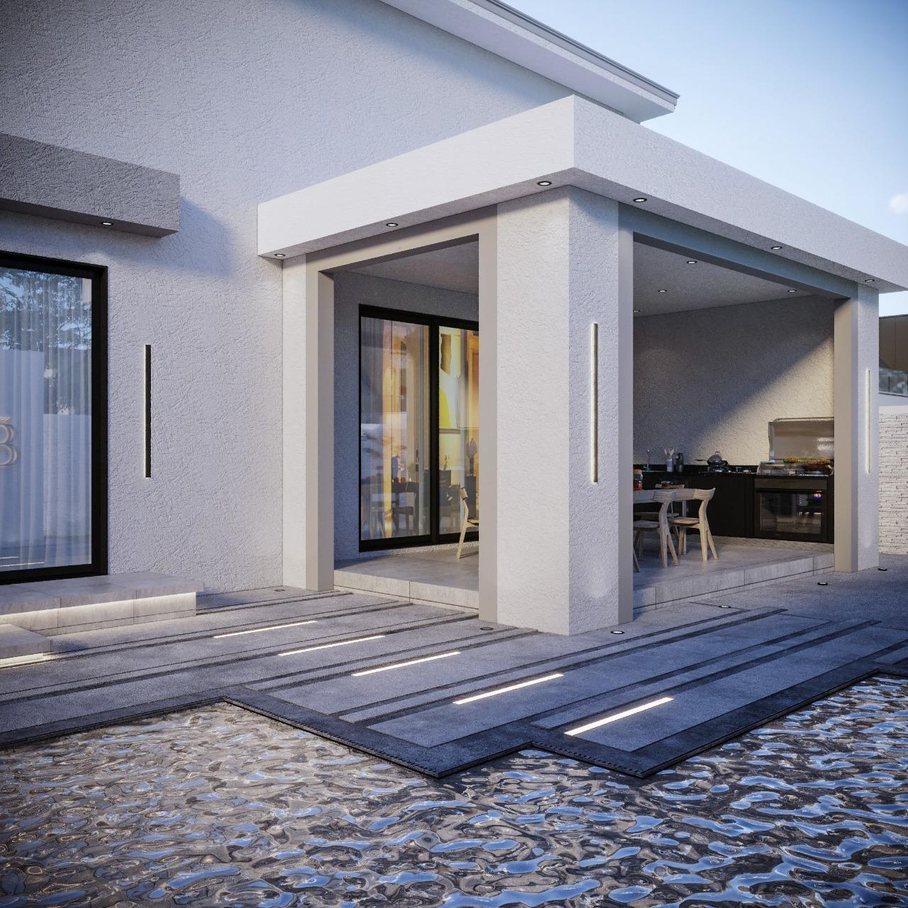A series of modern, minimalistic outdoor spaces combining natural elements, clean architecture, and ambient lighting to create serene and functional environments.