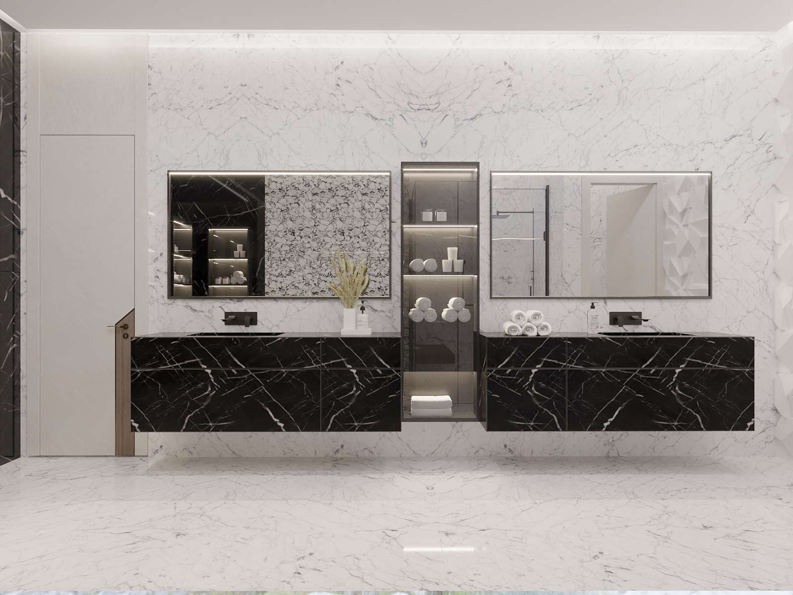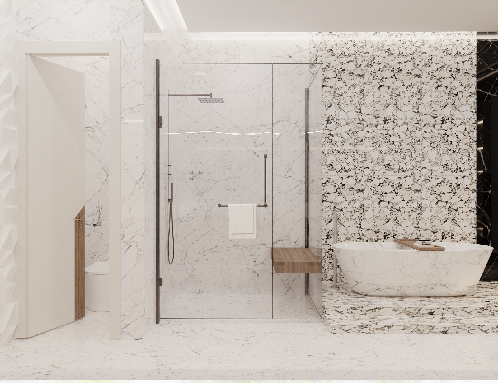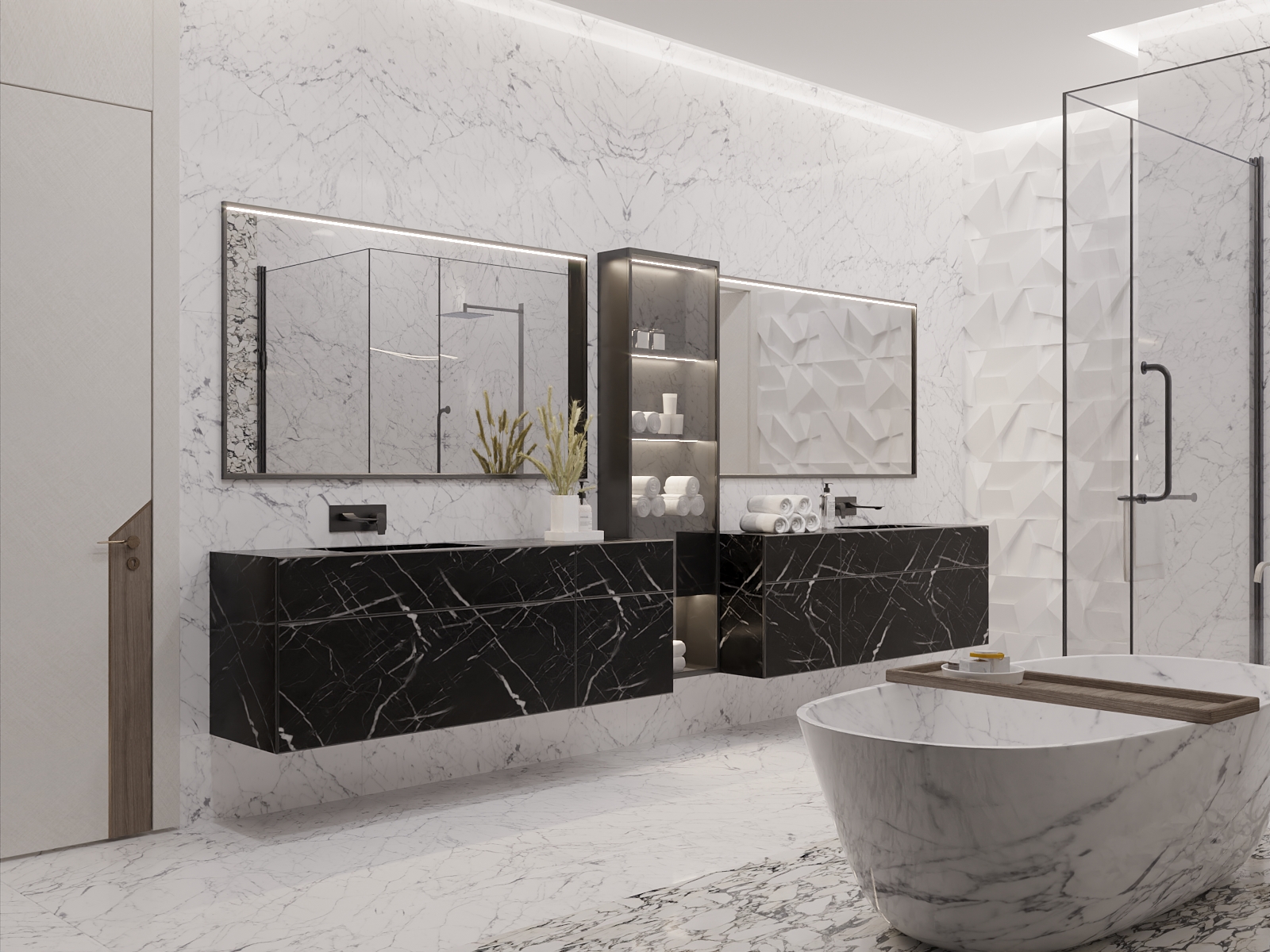 This modern bathroom blends opulence with restraint through its use of sculpted marble, geometric textures, and mood lighting. Every detail evokes calm luxury and refined craftsmanship.