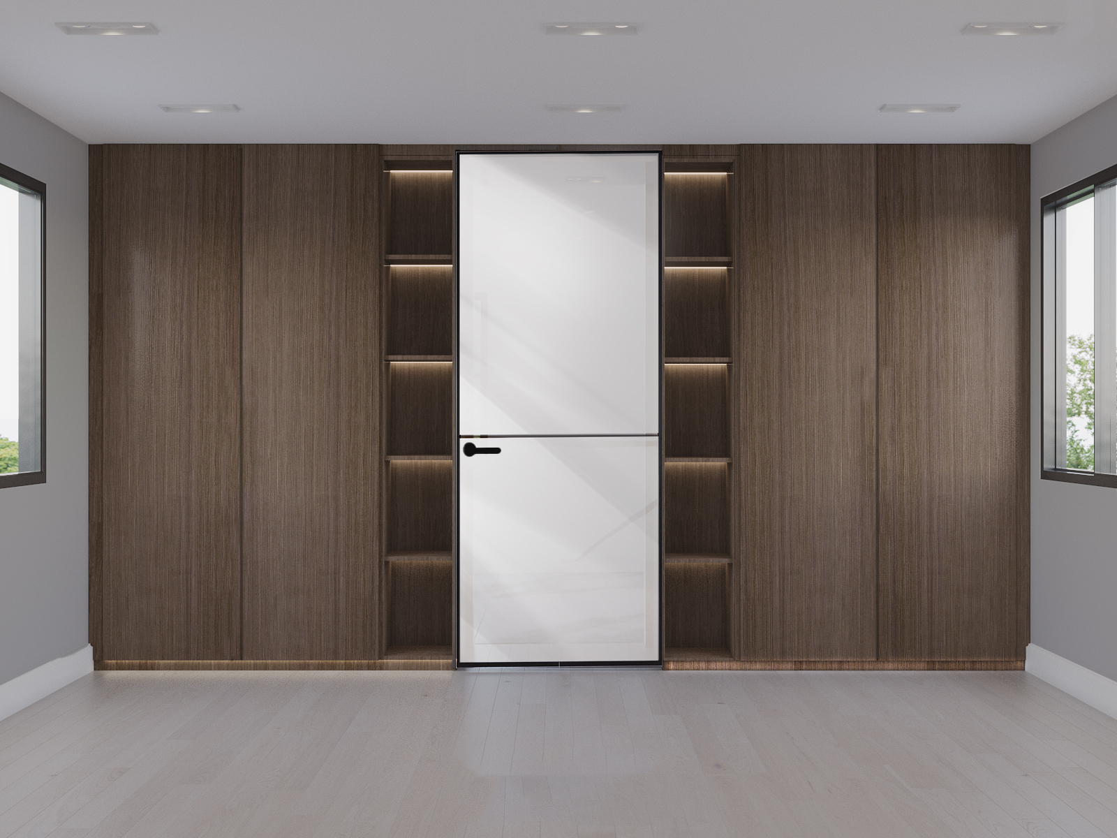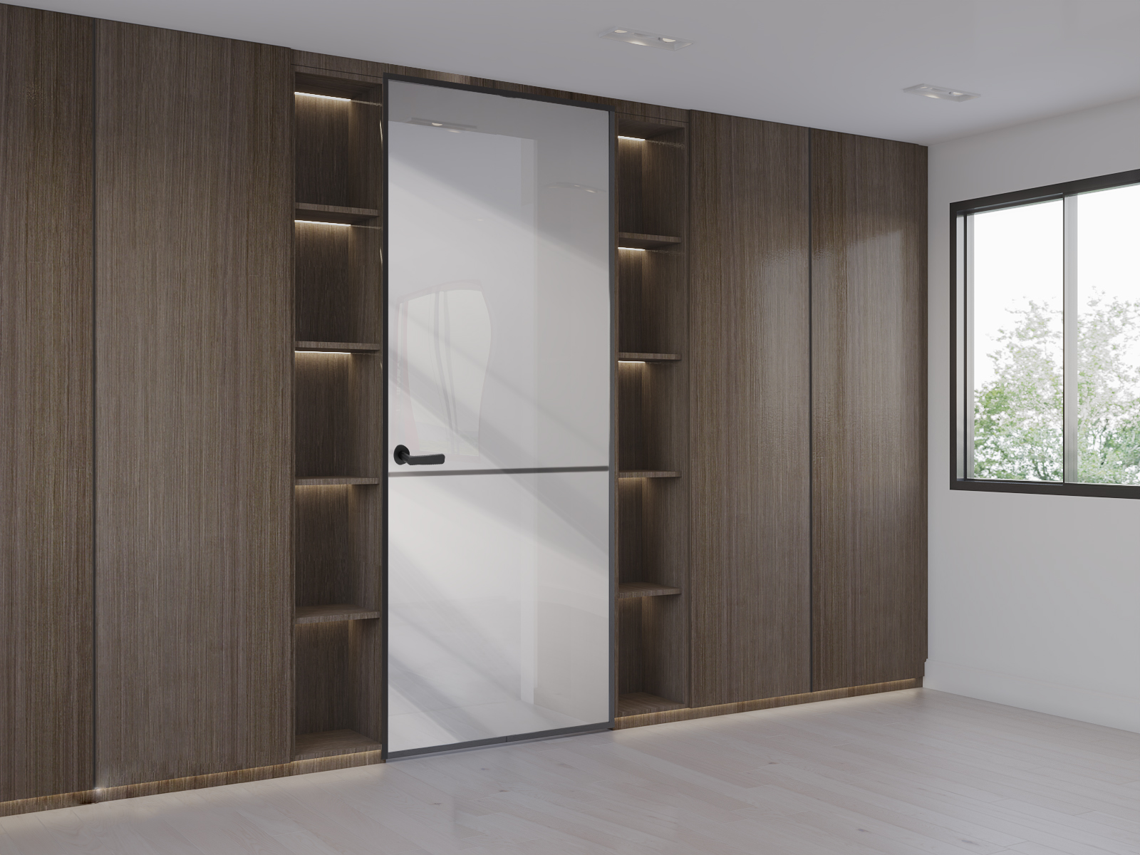 A modern, minimalist wardrobe featuring tinted glass doors and ambient lighting. Perfect for adding a luxurious yet functional statement to any bedroom.