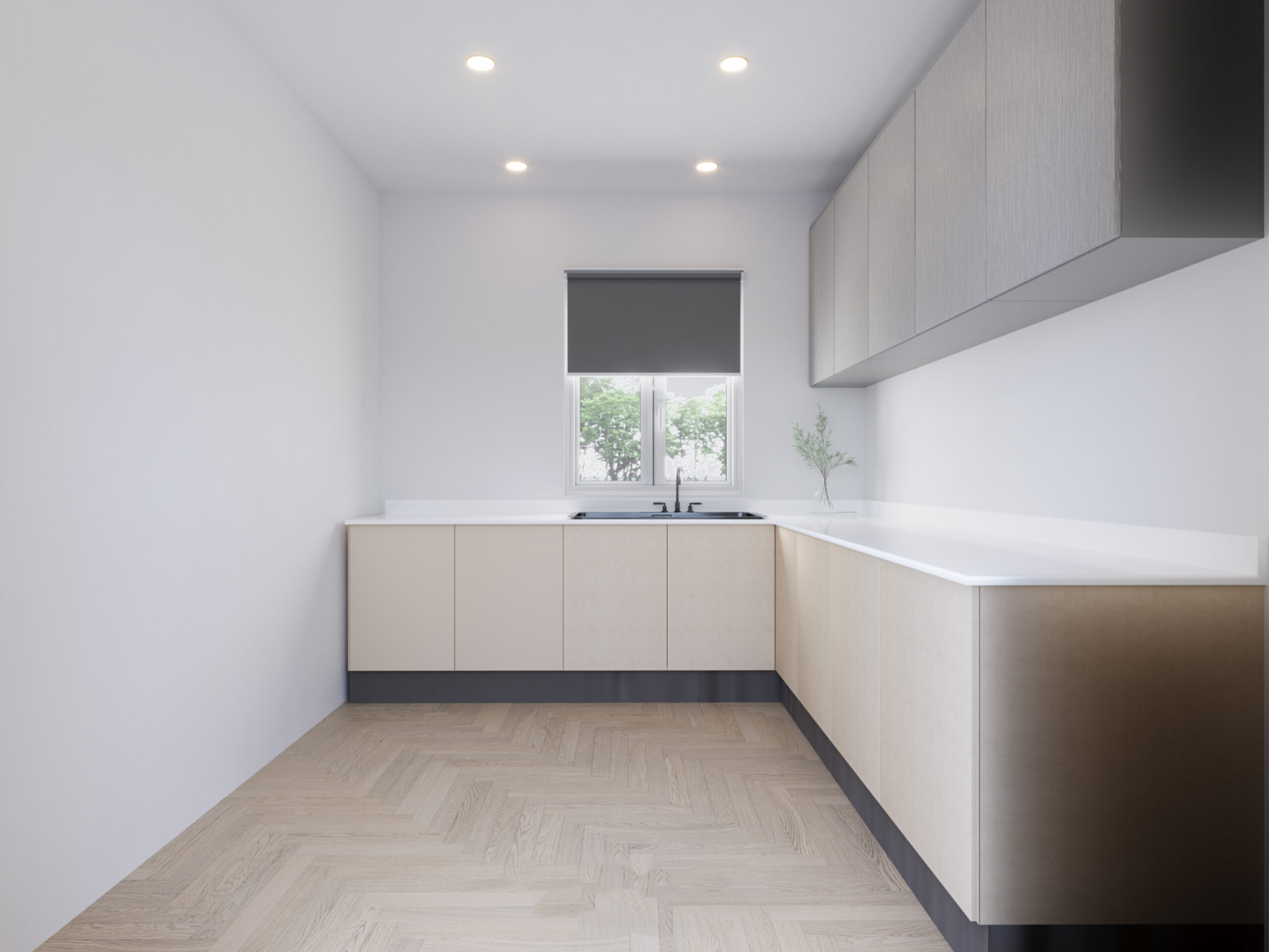 This kitchen features a clean L-shaped layout with neutral tones, matte finishes, and handleless cabinetry, delivering both elegance and functionality. Bright lighting and natural textures complete the modern minimal appeal.