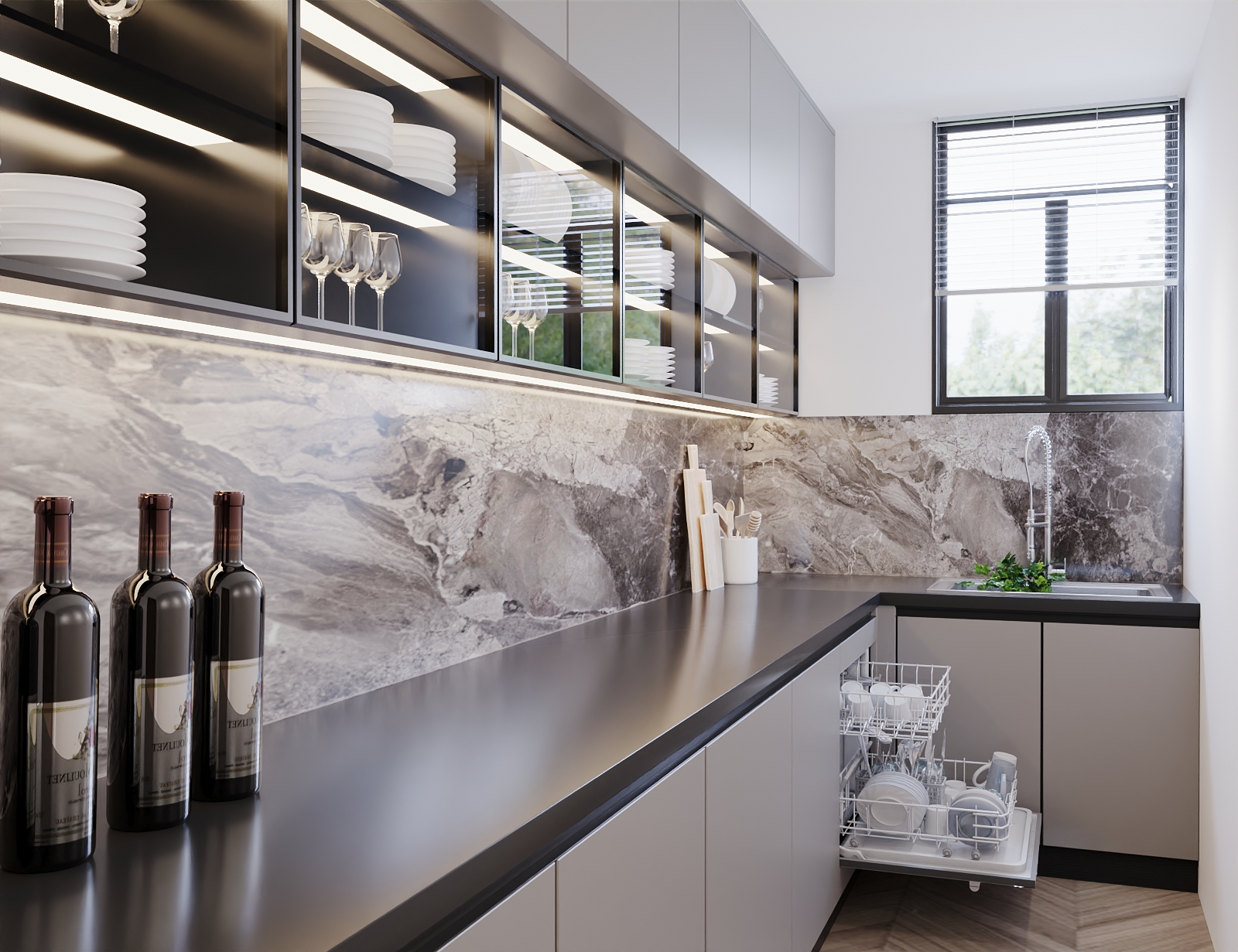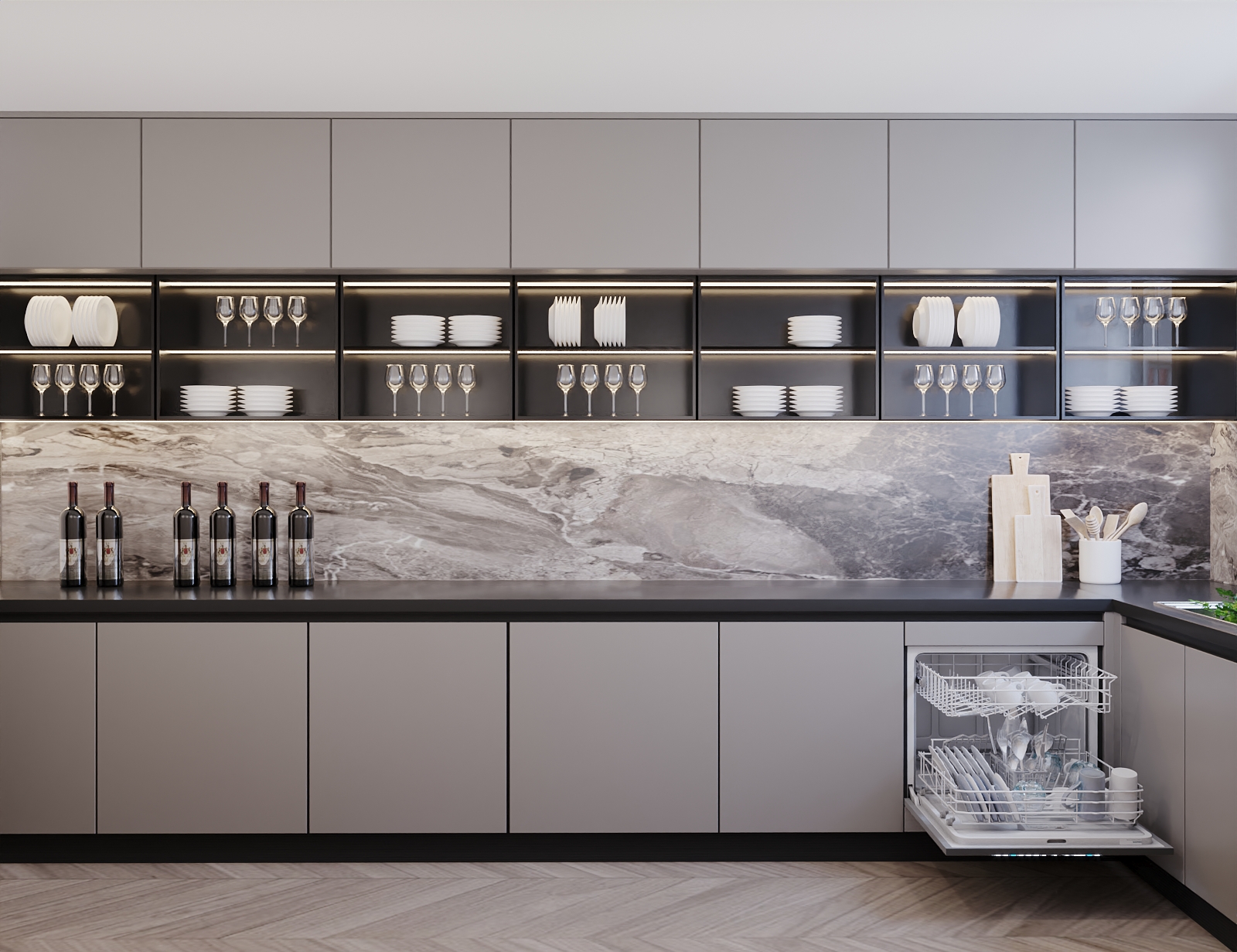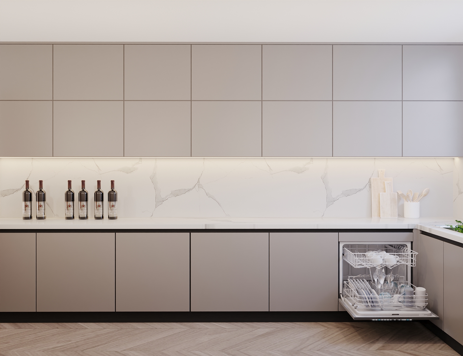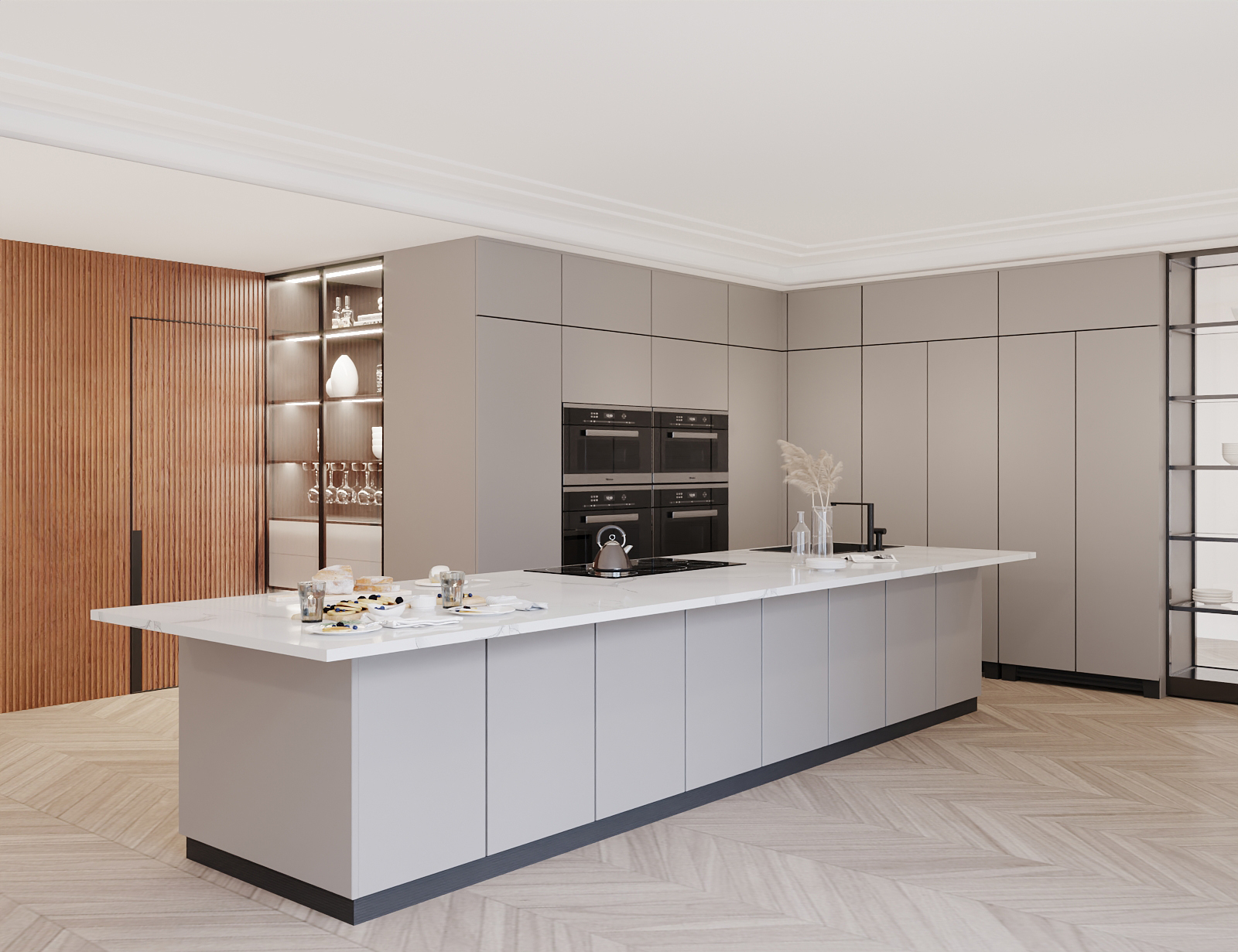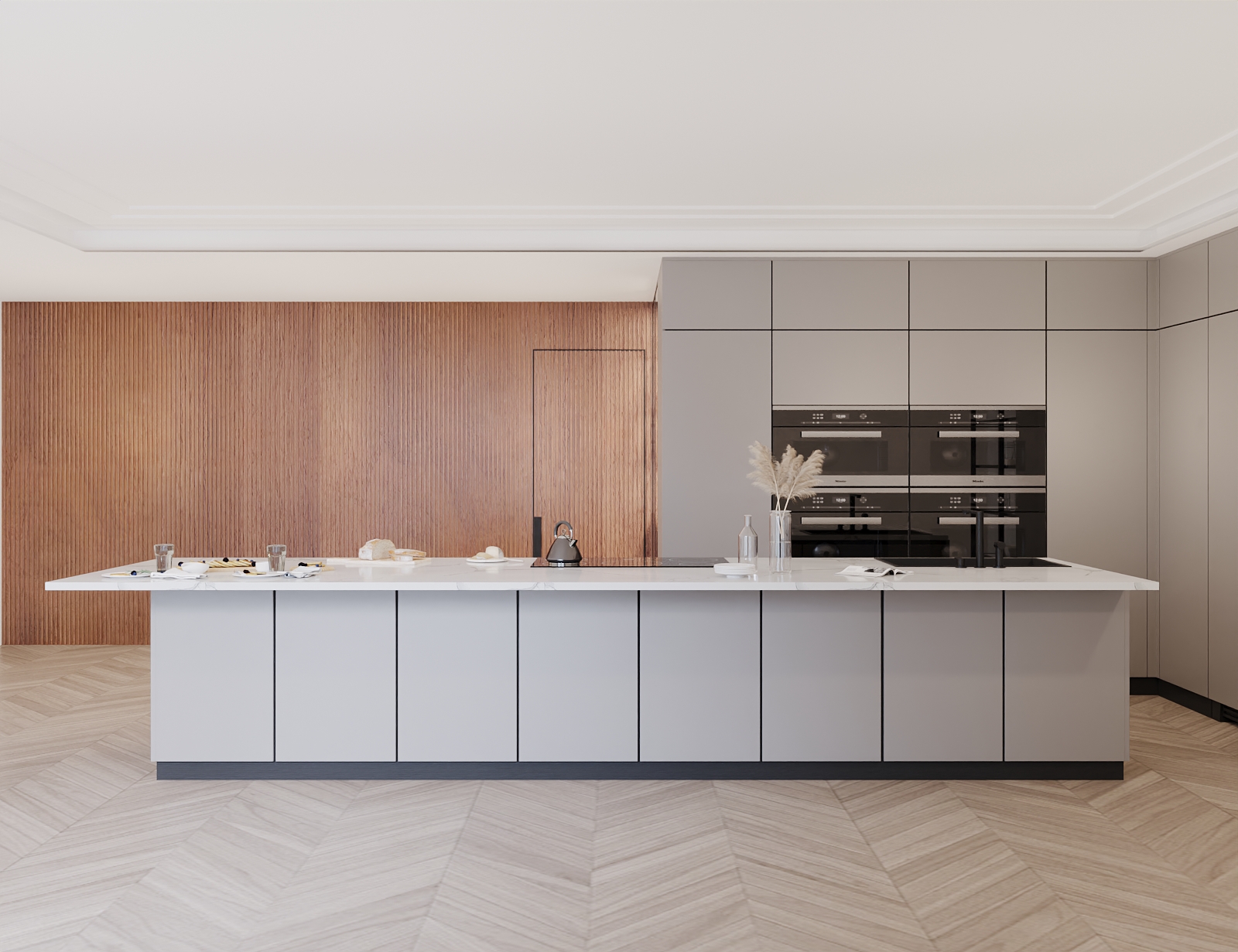 This contemporary kitchen blends muted tones with clean lines and functional layout, offering a calm and luxurious ambiance. Every element is crafted to elevate everyday efficiency.