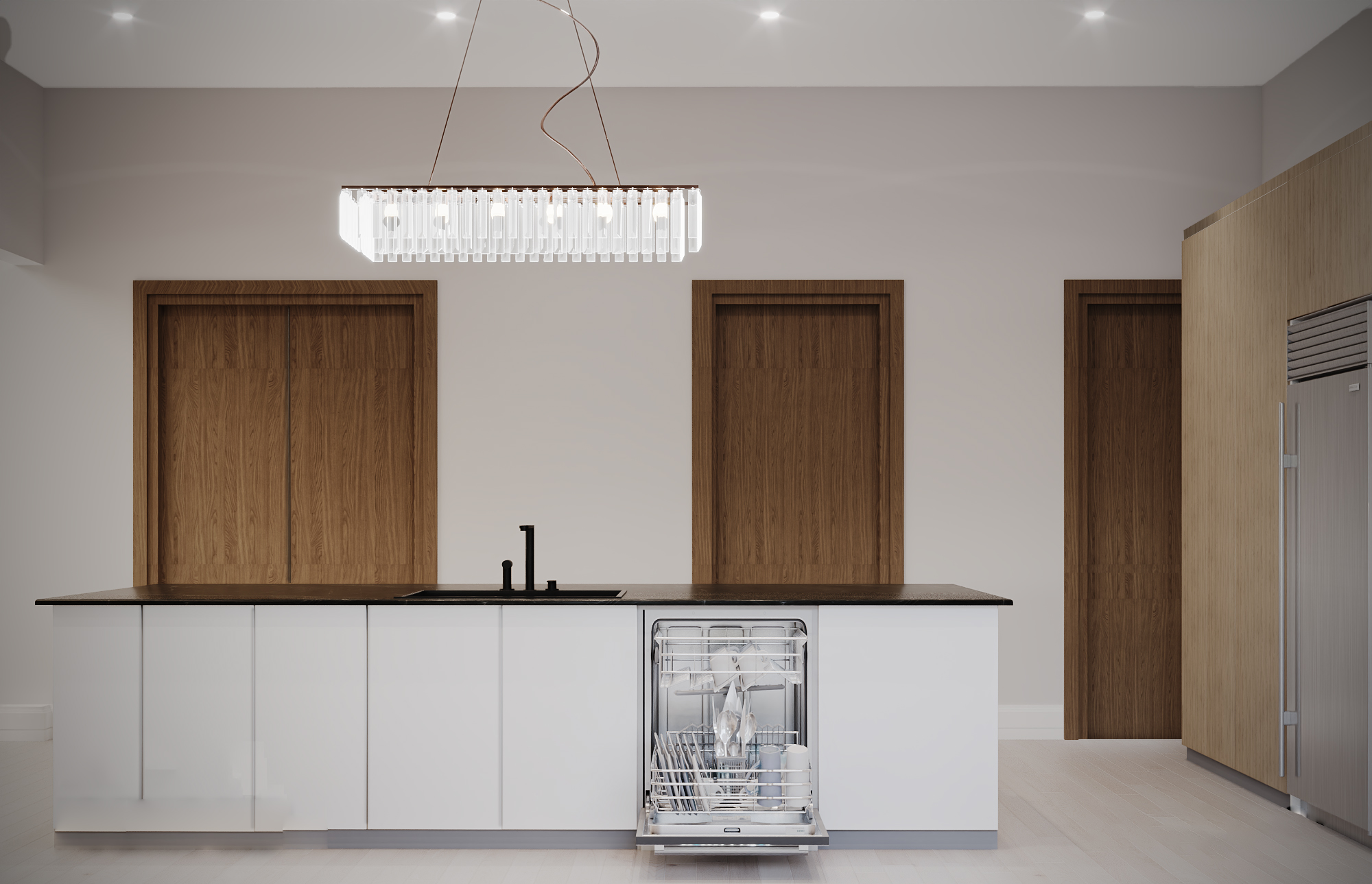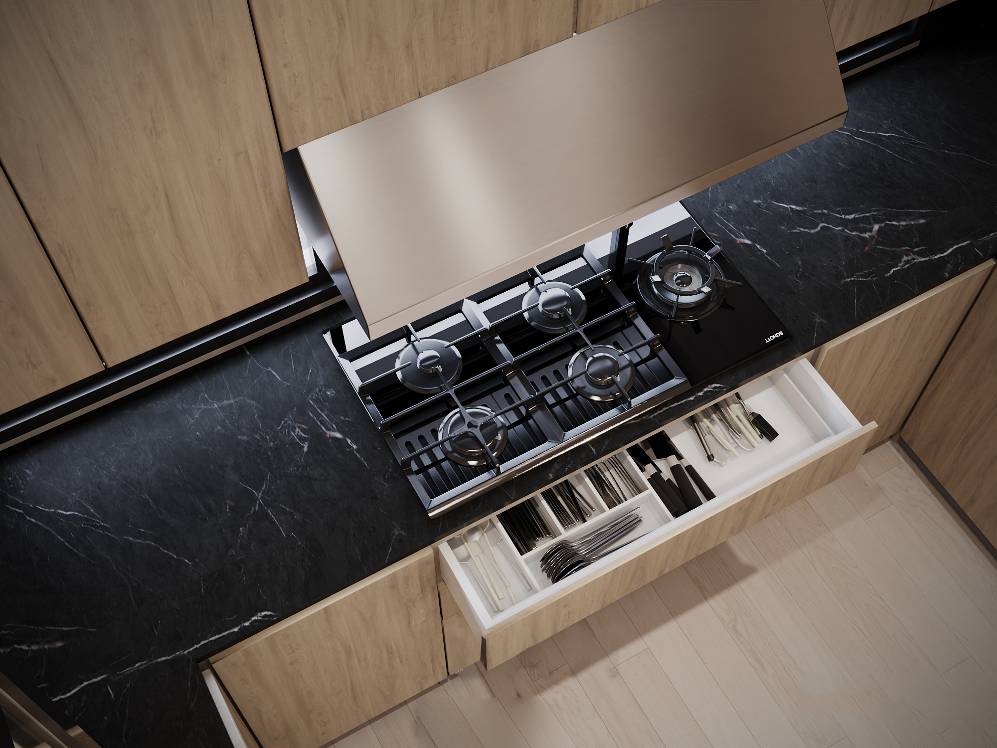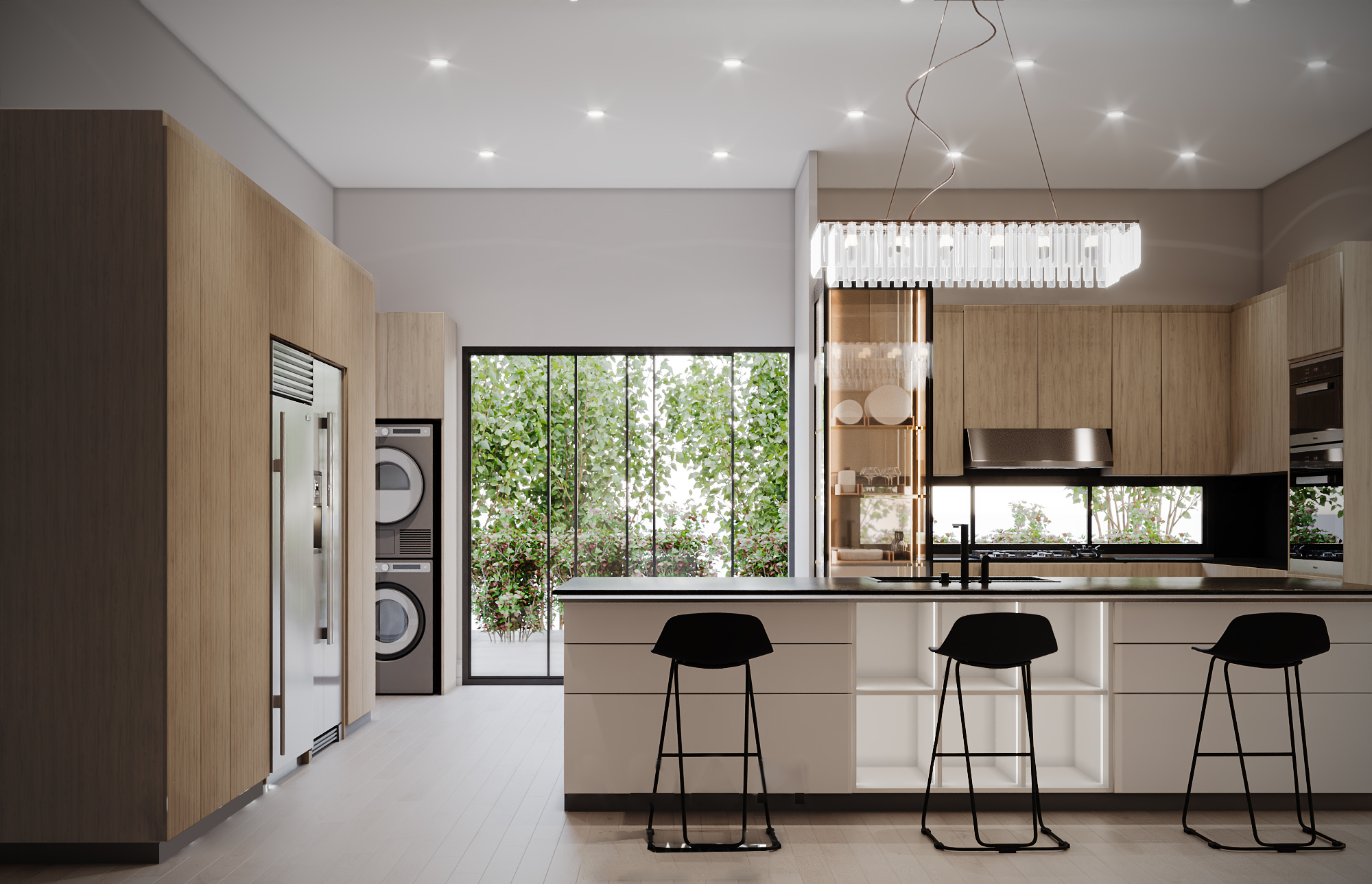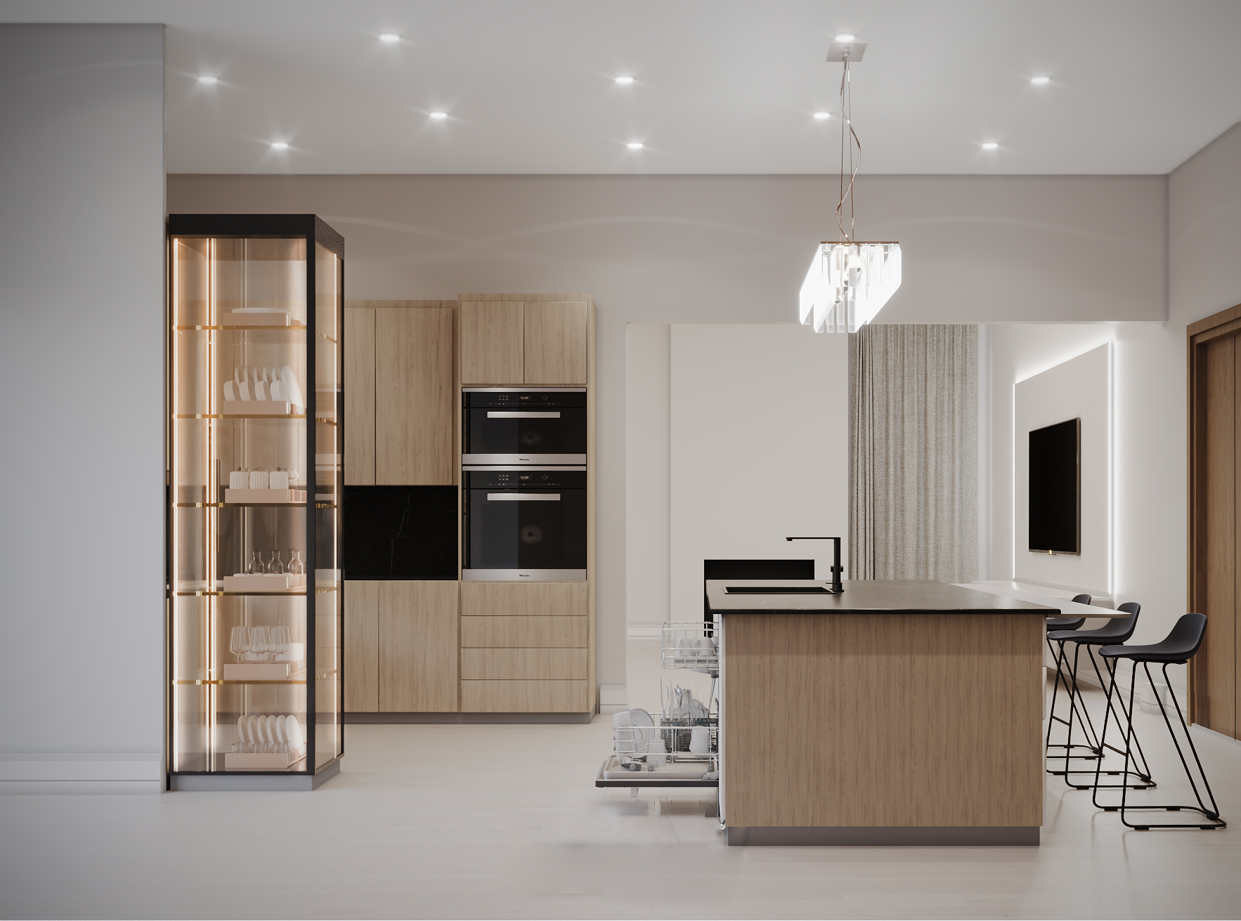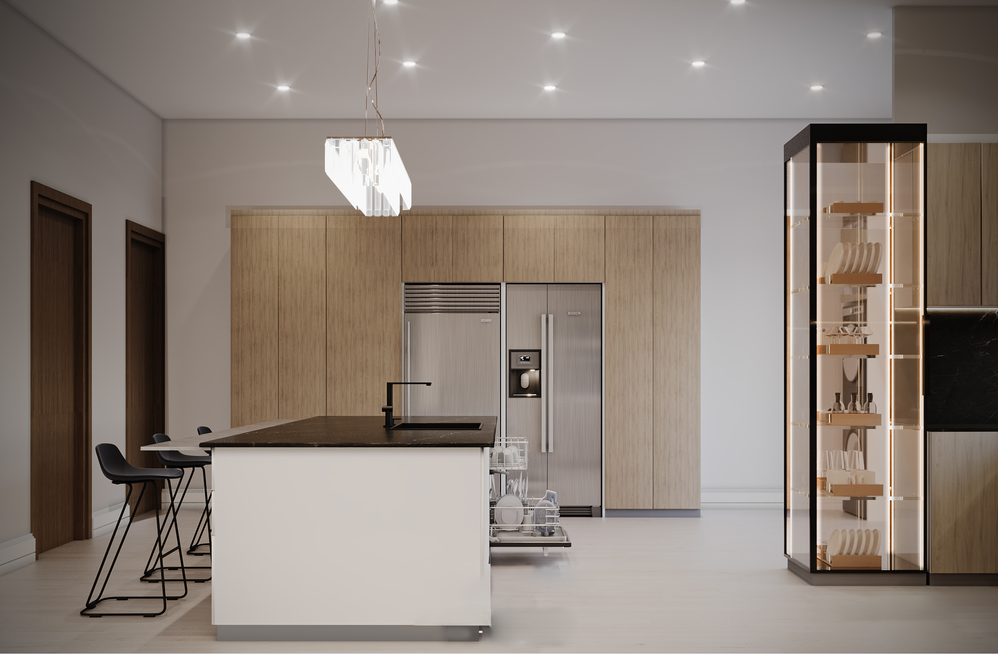 A minimalist yet highly functional modular kitchen that combines aesthetic sophistication with smart storage and cutting-edge appliances.