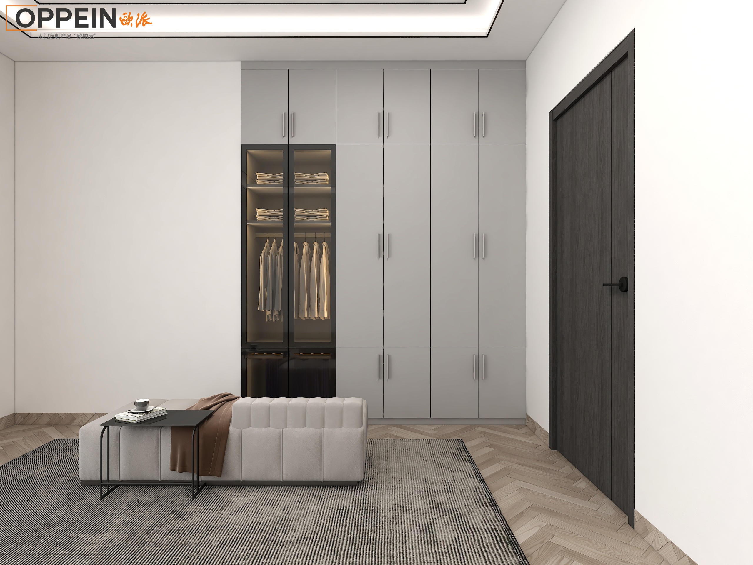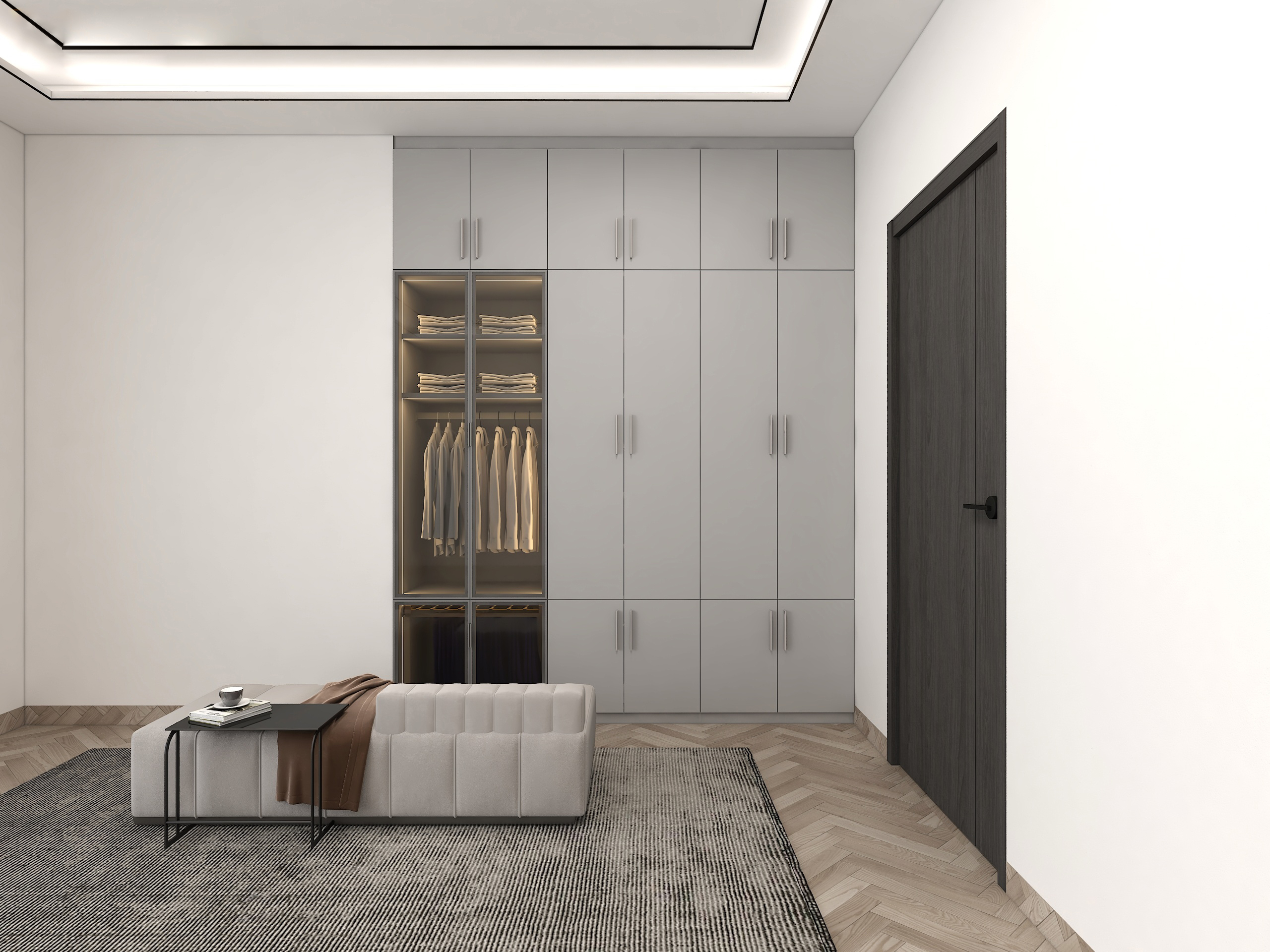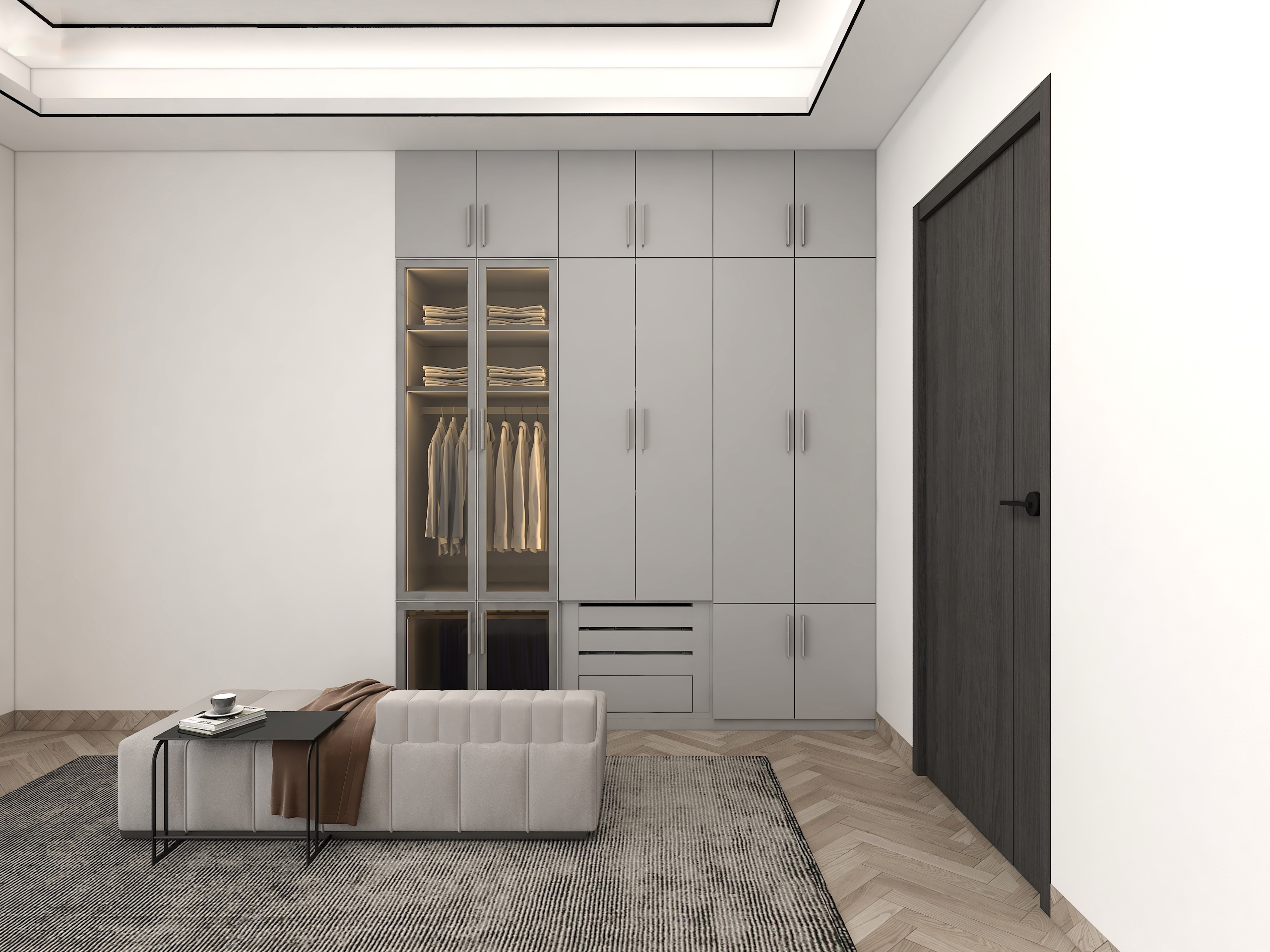 This modern wardrobe blends minimalism with high functionality. Featuring matte grey finishes, glass display doors, and integrated lighting, it brings elegance to everyday storage.