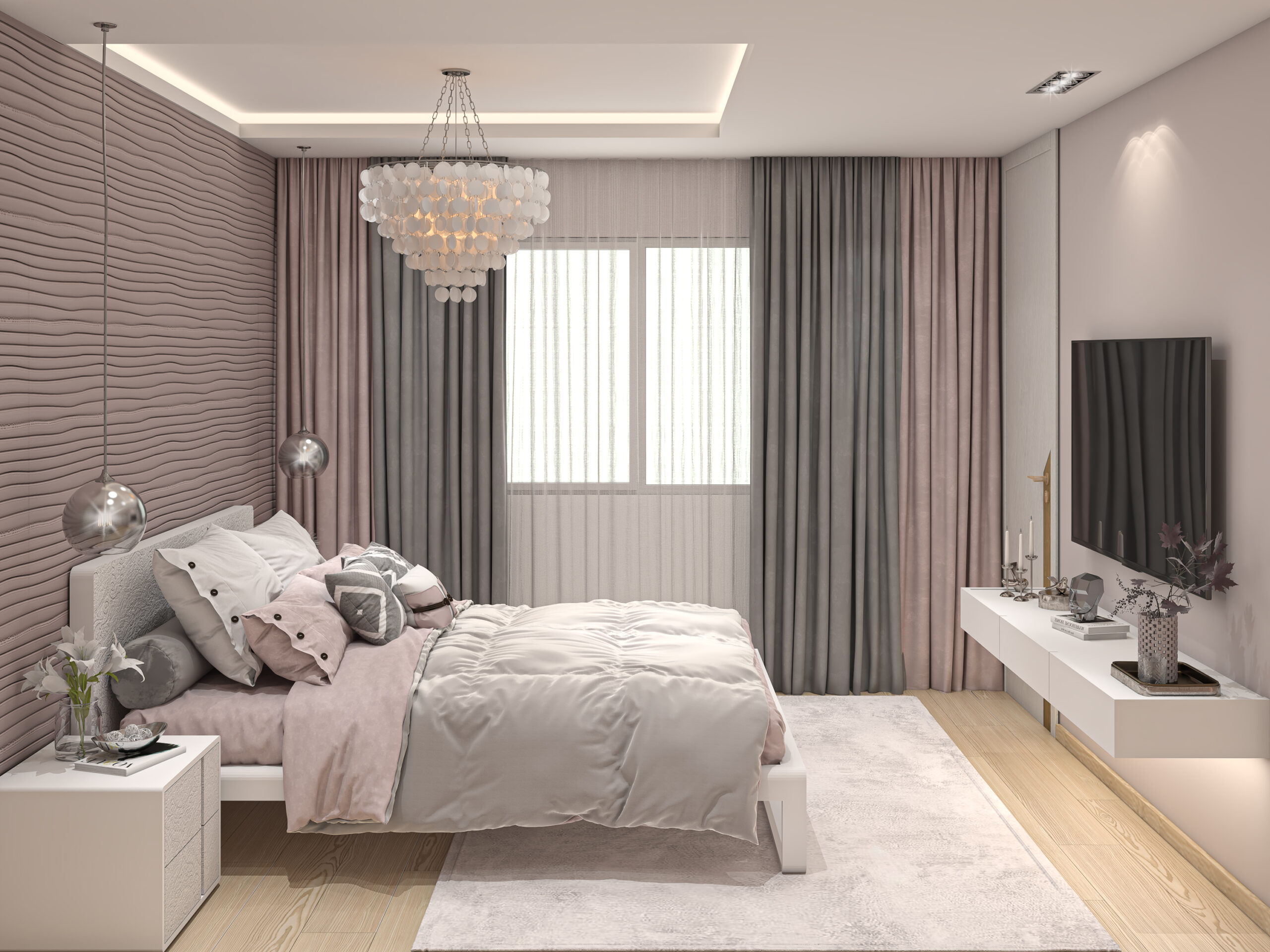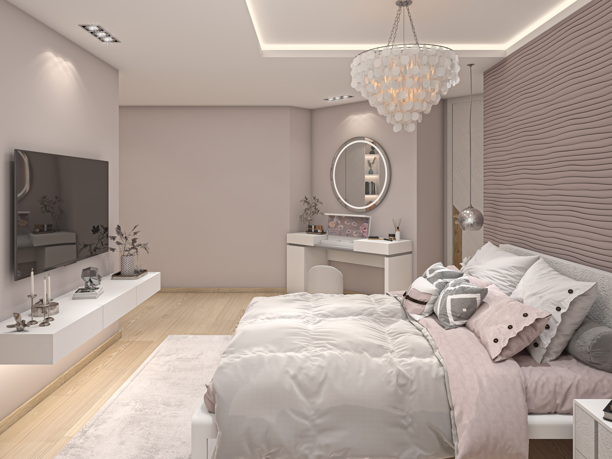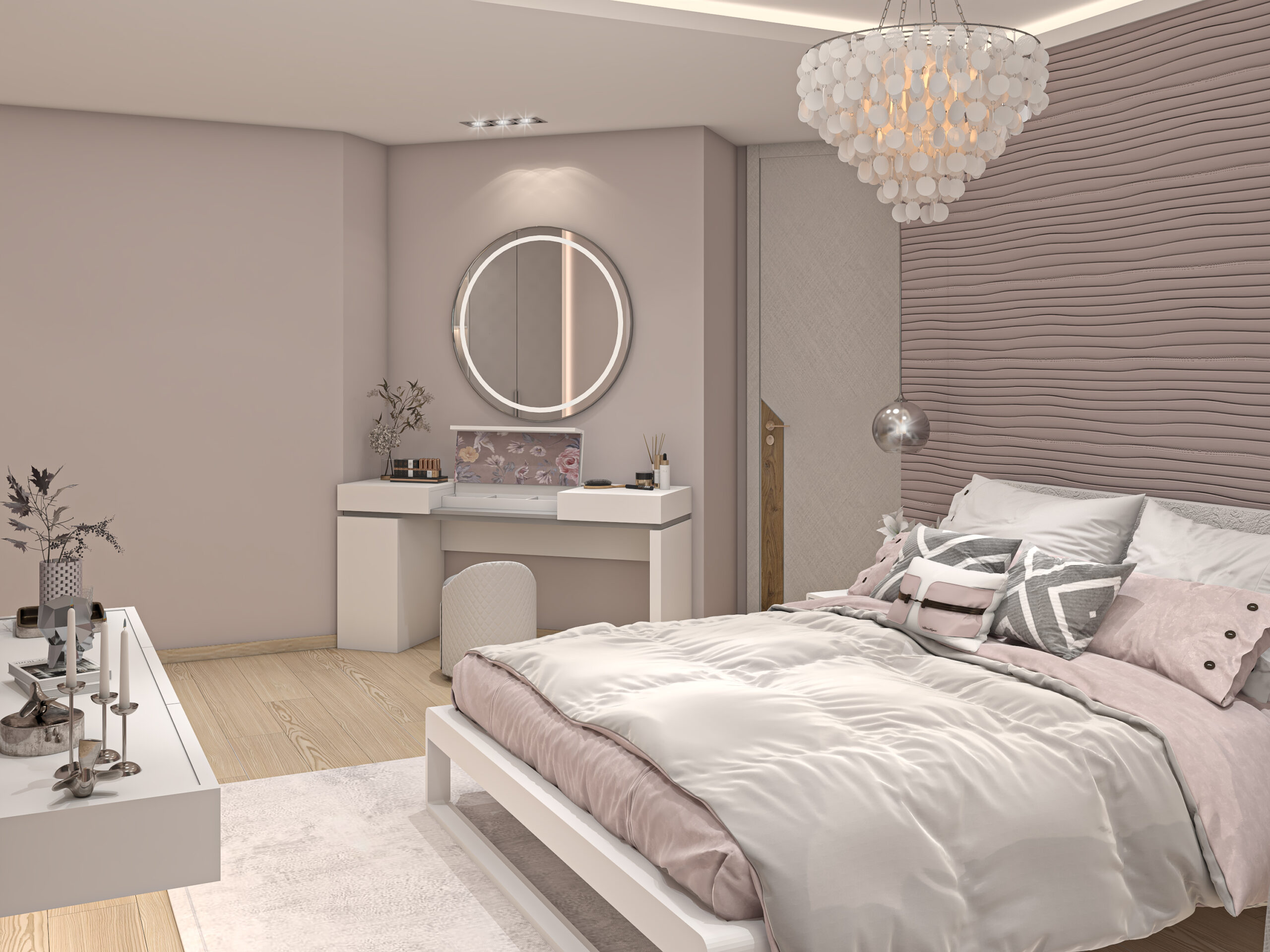This serene bedroom pairs blush tones with soft textures and metallic accents to create a refined and feminine escape. A delicate chandelier, textured feature wall, and layered fabrics combine for an atmosphere of subtle elegance.