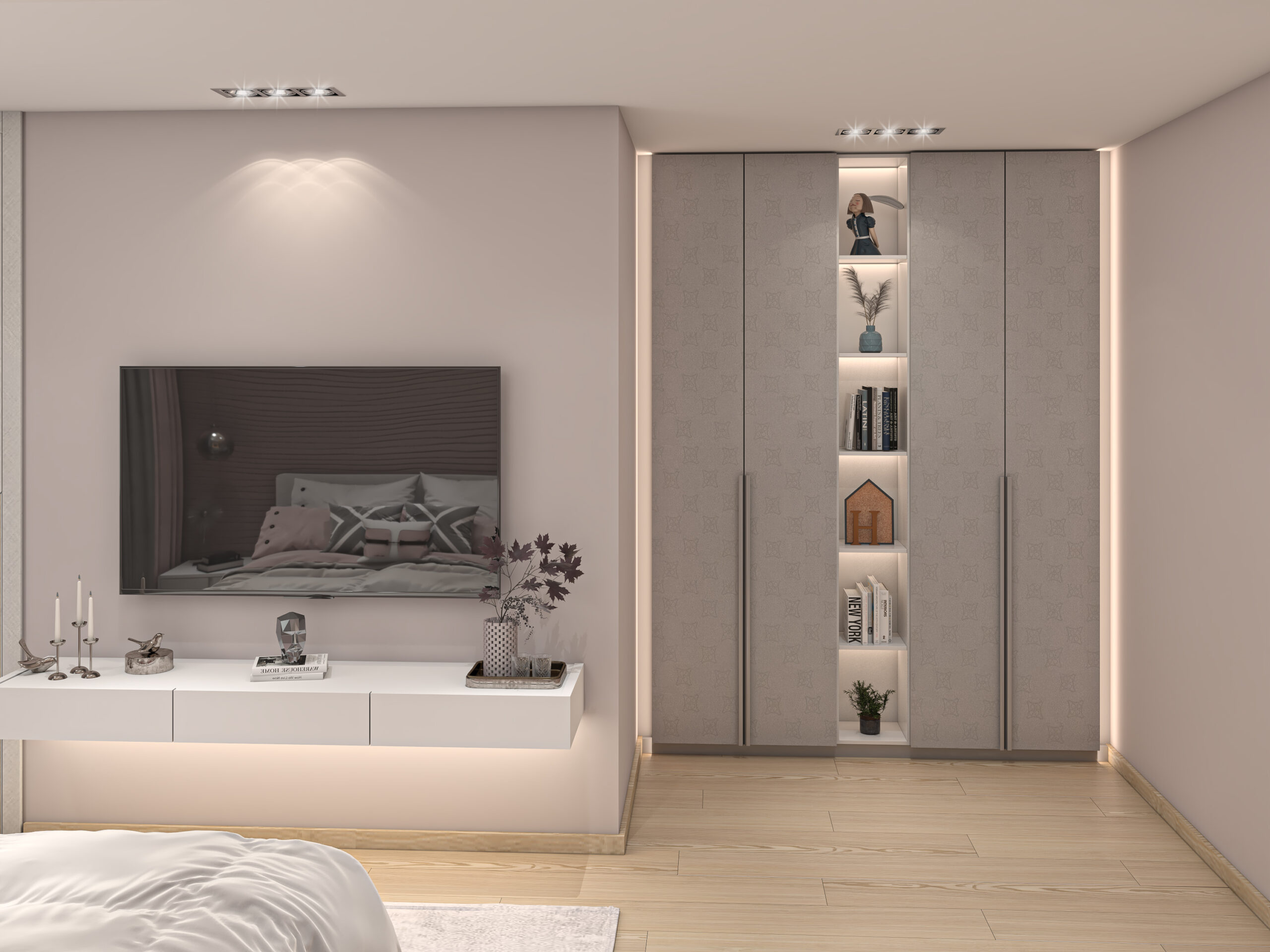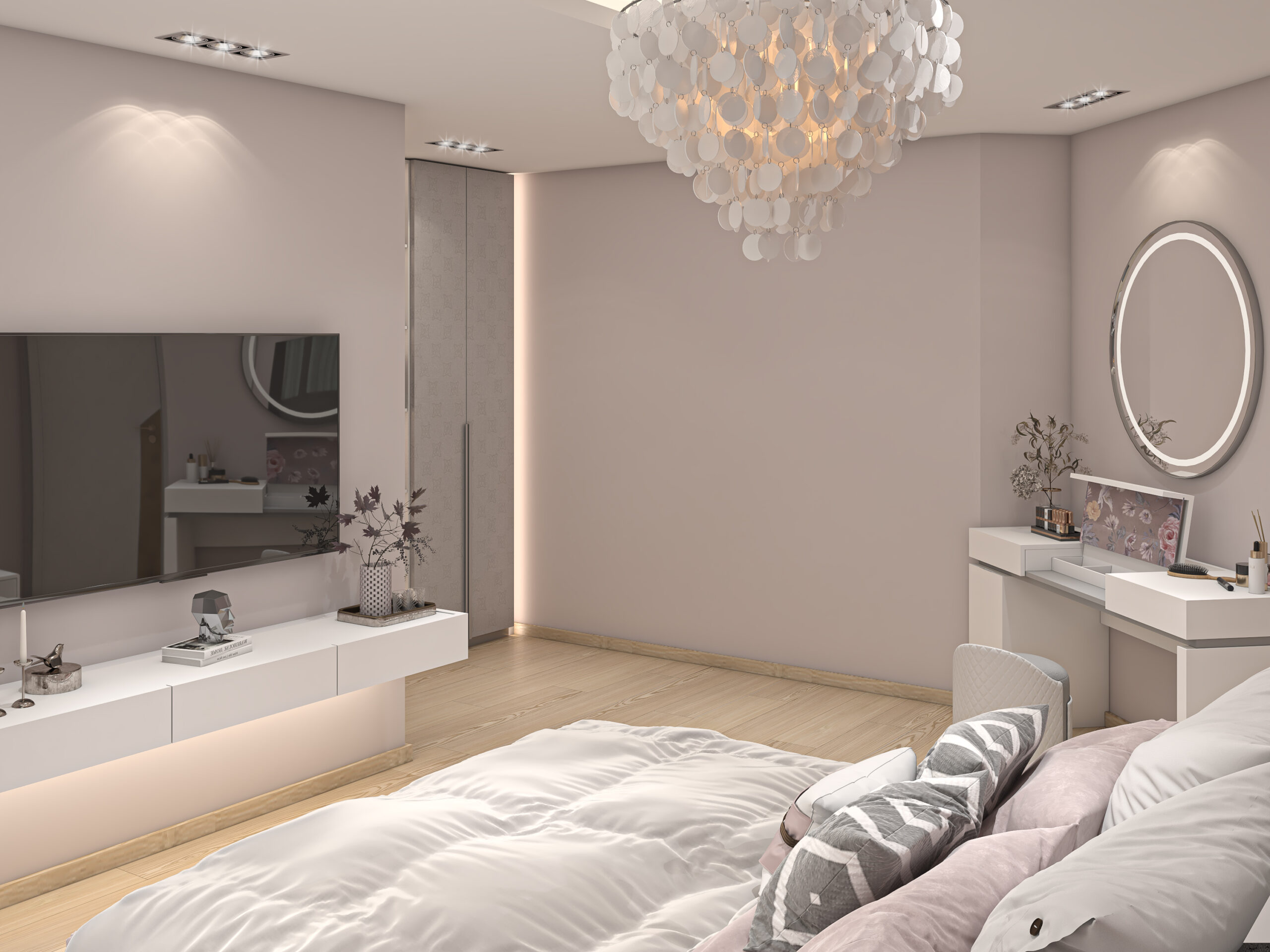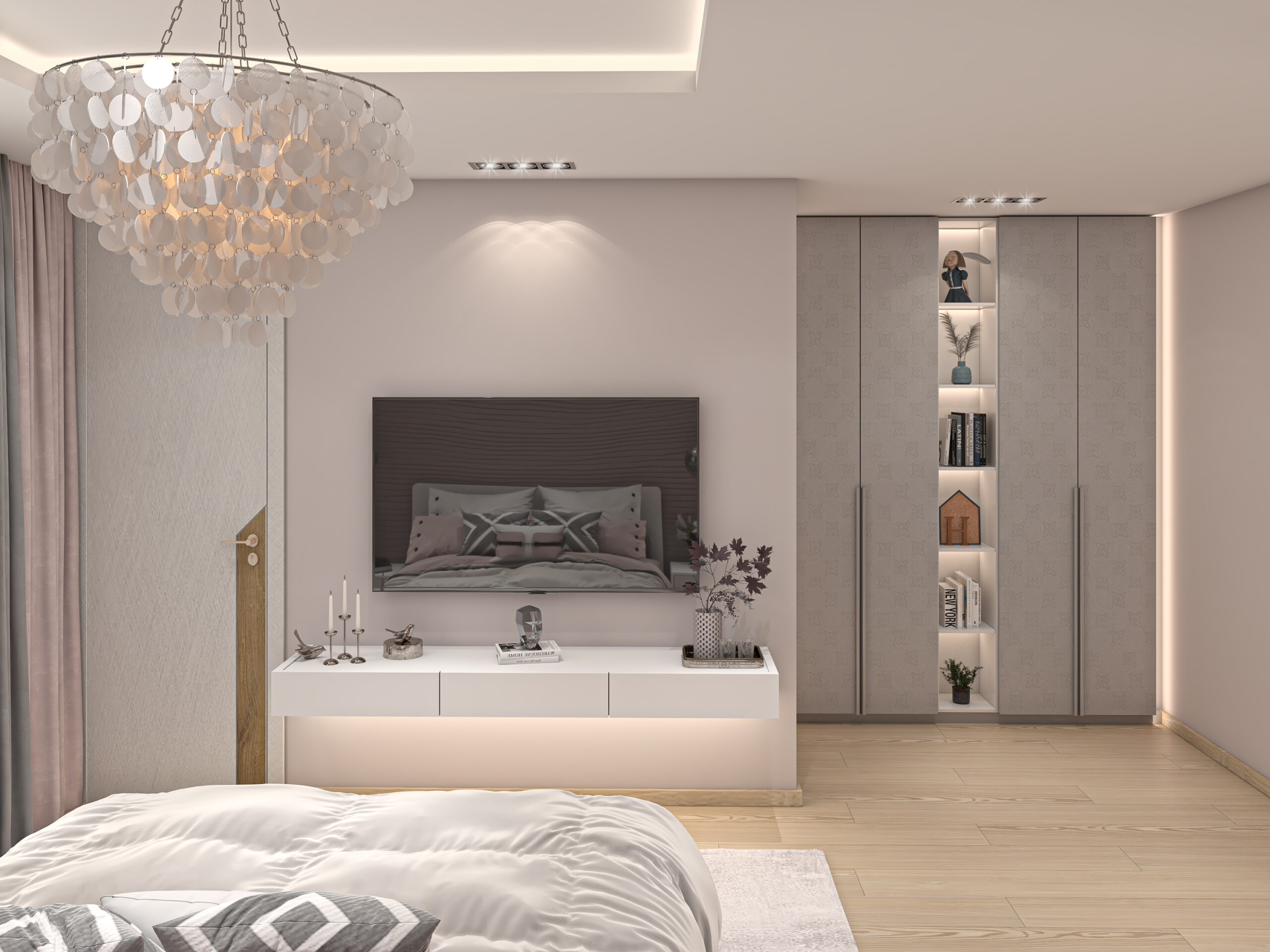 This serene bedroom pairs blush tones with soft textures and metallic accents to create a refined and feminine escape. A delicate chandelier, textured feature wall, and layered fabrics combine for an atmosphere of subtle elegance.