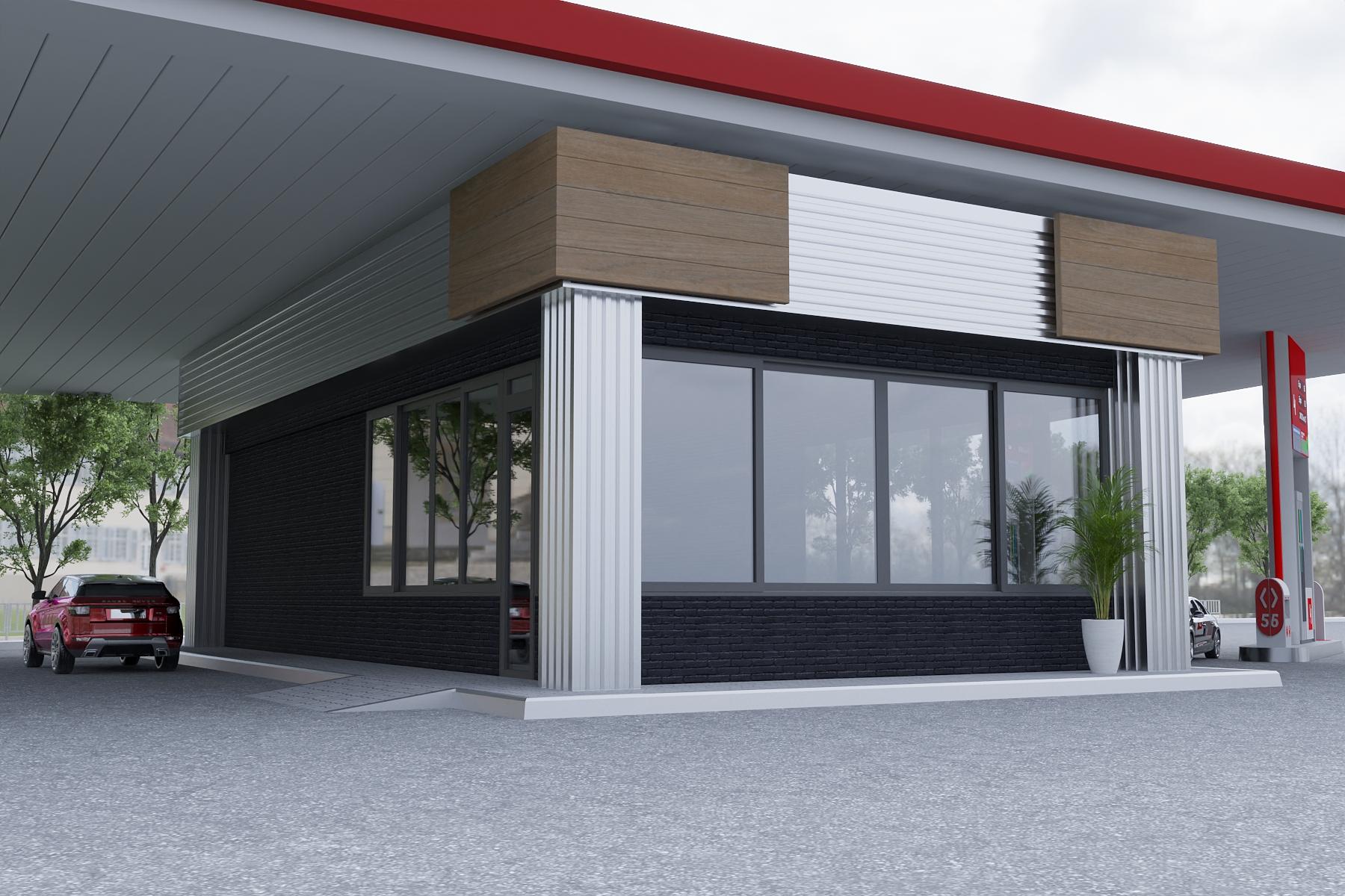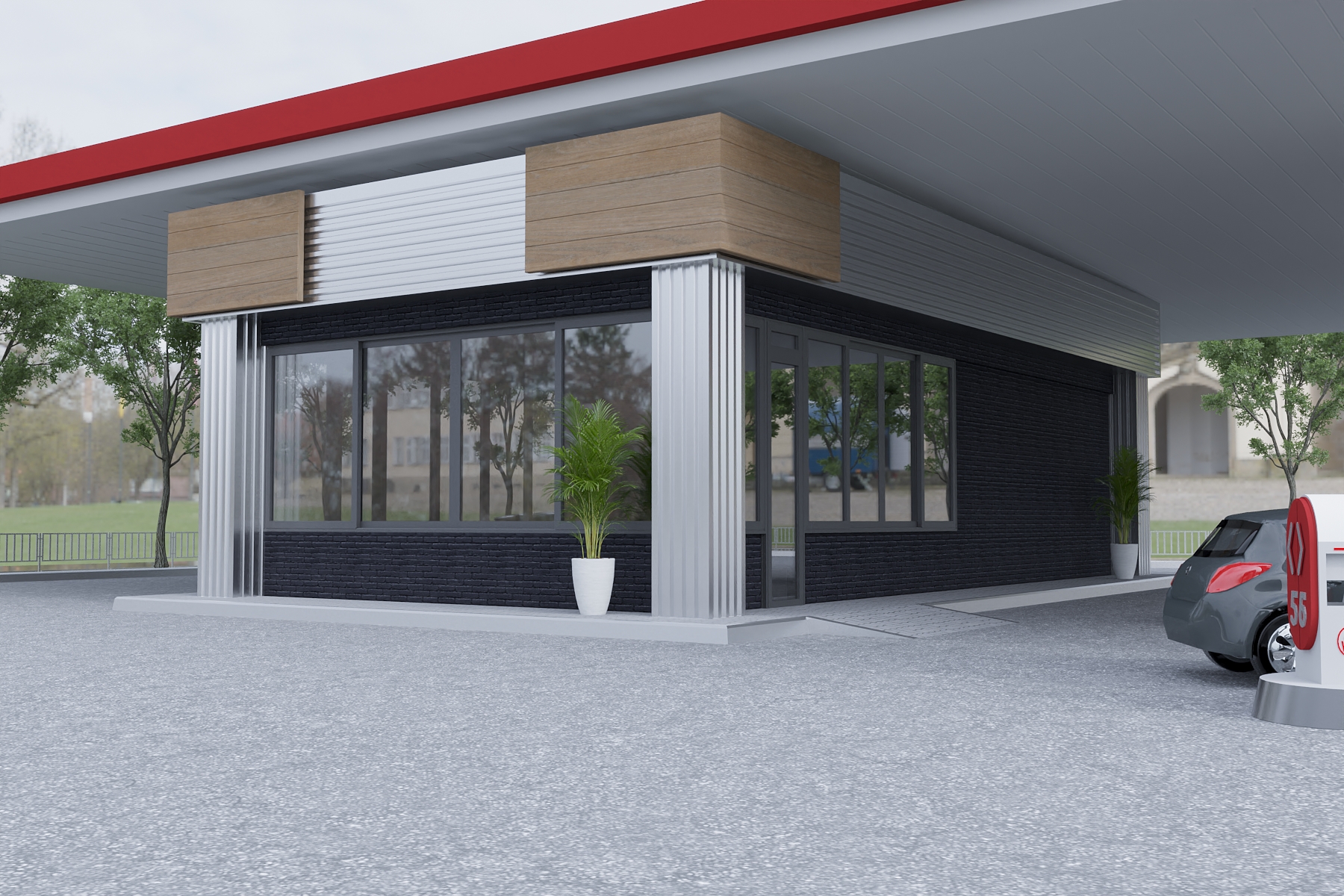 A sleek and functional fuel station design blending industrial aesthetics with modern detailing. The mix of black brick, metallic cladding, and warm wooden accents delivers a balanced, sophisticated facade.