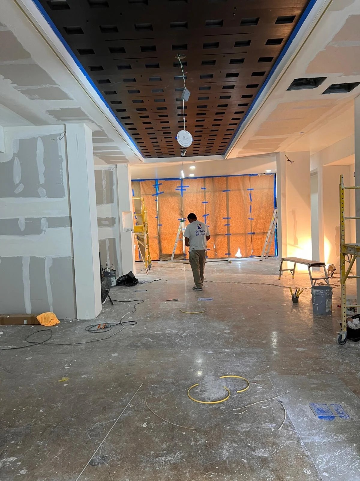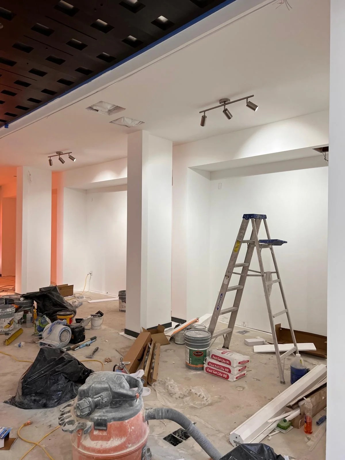 This series of images captures the transformation of a commercial interior space focusing on ceiling installation, lighting setup, and interior finishing. The project showcases modern design elements, with detailed ceiling work and efficient task lighting for enhanced aesthetics and functionality.